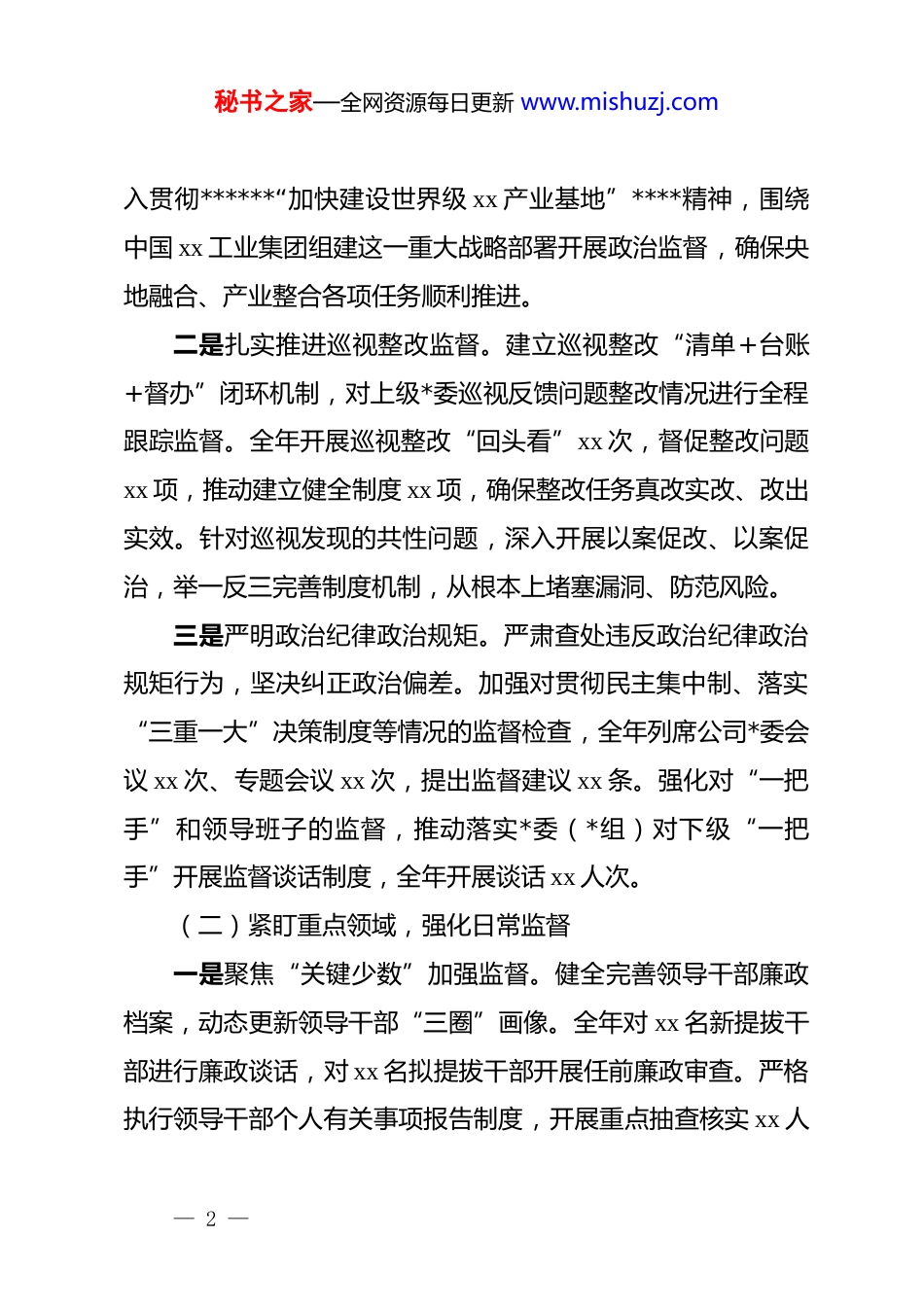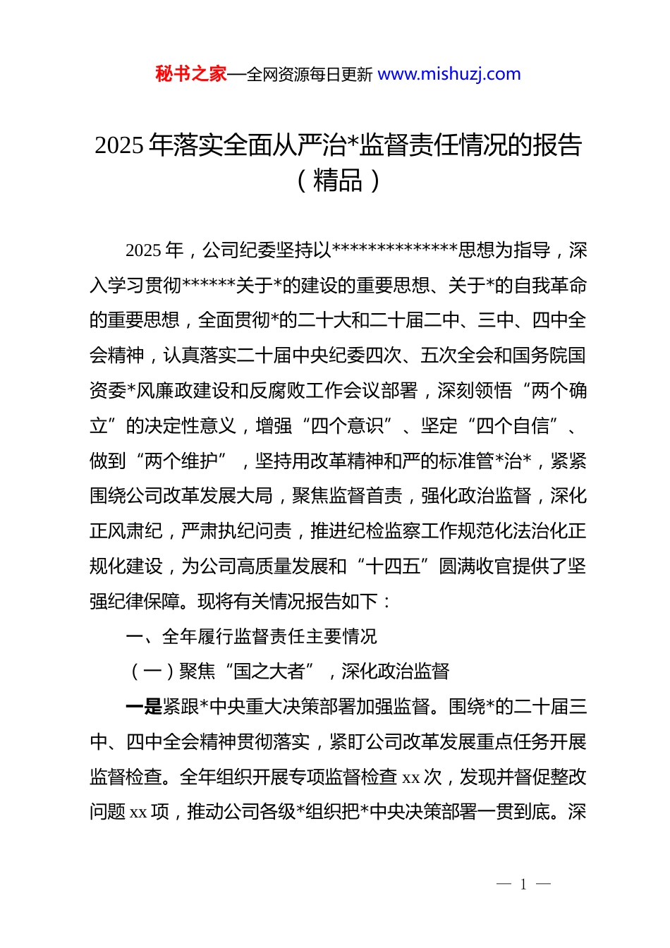 秘书之家—全网资源每日更新 www.mishuzj.com2025 年落实全面从严治*监督责任情况的报告(精品)2025 年,公司纪委坚持以**************思想为指导,深入学习贯彻******关于*的建设的重要思想、关于*的自我革命的重要思想,全面贯彻*的二十大和二十届二中、三中、四中全会精神,认真落实二十届中央纪委四次、五次全会和国务院国资委*风廉政建设和反腐败工作会议部署,深刻领悟“两个确立”的决定性意义,增强“四个意识”、坚定“四个自信”、做到“两个维护”,坚持用改革精神和严的标准管*治*,紧紧围绕公司改革发展大局,聚焦监督首责,强化政治监督,深化正风肃纪,严肃执纪问责,推进纪检监察工作规范化法治化正规化建设,为公司高质量发展和“十四五”圆满收官提供了坚强纪律保障。现将有关情况报告如下:一、全年履行监督责任主要情况(一)聚焦“国之大者”,深化政治监督一是紧跟*中央重大决策部署加强监督。围绕*的二十届三中、四中全会精神贯彻落实,紧盯公司改革发展重点任务开展监督检查。全年组织开展专项监督检查 xx 次,发现并督促整改问题 xx 项,推动公司各级*组织把*中央决策部署一贯到底。深— 1 —秘书之家—全网资源每日更新 www.mishuzj.com入贯彻******“加快建设世界级 xx 产业基地”****精神,围绕中国 xx 工业集团组建这一重大战略部署开展政治监督,确保央地融合、产业整合各项任务顺利推进。二是扎实推进巡视整改监督。建立巡视整改“清单+台账+督办”闭环机制,对上级*委巡视反馈问题整改情况进行全程跟踪监督。全年开展巡视整改“回头看”xx 次,督促整改问题xx 项,推动建立健全制度 xx 项,确保整改任务真改实改、改出实效。针对巡视发现的共性问题,深入开展以案促改、以案促治,举一反三完善制度机制,从根本上堵塞漏洞、防范风险。三是严明政治纪律政治规矩。严肃查处违反政治纪律政治规矩行为,坚决纠正政治偏差。加强对贯彻民主集中制、落实“三重一大”决策制度等情况的监督检查,全年列席公司*委会议 xx 次、专题会议 xx 次,提出监督建议 xx 条。强化对“一把手”和领导班子的监督,推动落实*委(*组)对下级“一把手”开展监督谈话制度,全年开展谈话 xx 人次。(二)紧盯重点领域,强化日常监督一是聚焦“关键少数”加强监督。健全完善领导干部廉政档案,动态更新领导干部“三圈”画像。全年对 xx 名新提拔干部进行廉政谈话,对 xx 名拟提拔干部开展任前廉政审查。严格执行领导干部个人有关事项报告制度,开展重点抽查核实 xx 人— 2 —秘书之家—全网资源每日更新 www.mishuzj.com次。参与干部选拔任用工作,出具*风廉政意见 xx 人次,切实把好选人用人“廉洁关”。二是聚焦“微权力”岗位强化监督。梳理排查生产经营管理中的“微权力”岗位风险点,建立风险防控清单。重点加强对物资采购、合同签订、资金支付、资产处置等关键环节的监督,推动完善内控流程 xx 项。针对基层“微腐败”问题,深入开展专项整治,全年发现并纠正问题 xx 项,推动建立健全小微权力运行监督机制。三是聚焦重大项目和招投标领域加强监督。围绕公司重大工程建设、技术改造等项目,建立全过程嵌入式监督机制,全年开展项目监督检查 xx 次,发现问题 xx 项并督促整改。严格招投标监督管理,对重大招投标项目实行全程监督,全年监督招投标项目 xx 项,涉及金额 xx 亿元。开展招投标领域突出问题专项整治,重点纠治围标串标、“明招暗定”等问题,查处违规问题 xx 起。四是健全大监督工作格局。推动构建“纪检监察+审计+巡察+职能部门”的大监督体系,建立监督信息共享、线索移送、协同办案等机制。全年召开监督工作联席会议 xx 次,实现监督信息共享 xx 条,移送问题线索 xx 条。加强与审计部门的协调配合,将审计发现问题纳入监督范围,推动审计整改落实。— 3 —秘书之家—全网资源每日更新 www.mishuzj.com(三)锲而不舍正风肃纪,涵养优良作风一是高质量开展深入贯彻中央八项规定精神学习教育。按照*中央统一部署,协助公司*委扎实开展深入贯彻中央八项规定精神学习教育。制定公司学习教育工...