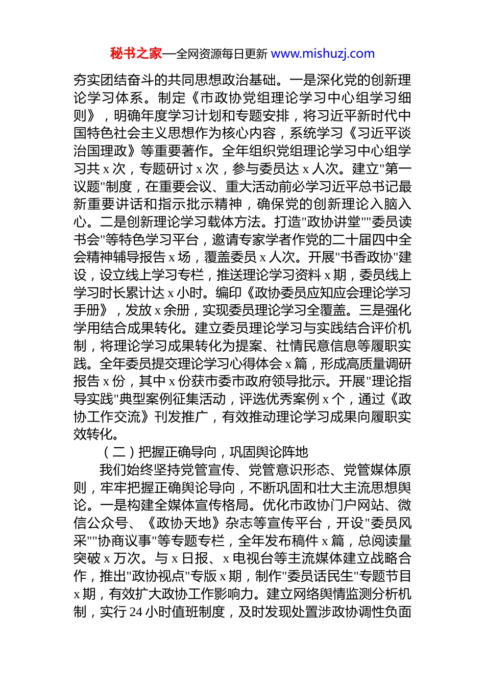 秘书之家—全网资源每日更新 www.mishuzj.comxx 办公室 2025 年意识形态工作总结与 2026年工作计划 意识形态工作是党的一项极端重要的工作,事关党的前途命运,事关国家长治久安,事关民族凝聚力和向心力。2025 年,市政协办公室坚持以习近平新时代中国特色社会主义思想为指导,深入学习贯彻党的二十届四中全会精神和习近平总书记关于加强和改进人民政协工作的重要思想,紧紧围绕市委市政府中心工作,全面贯彻落实《中国共产党思想政治工作条例》,牢牢掌握意识形态工作领导权,不断巩固马克思主义在意识形态领域的指导地位,巩固全党全国各族人民团结奋斗的共同思想基础。全年意识形态工作导向正确、基调鲜明、推进有序、成效显著,为政协履职提供了坚强思想保障和强大精神力量。现将全年工作总结及下一年工作计划报告如下:一、2025 年意识形态工作成效与经验在意识形态工作实践中,我们深刻认识到,做好新时代人民政协意识形态工作,必须始终坚持党的全面领导,把政治建设摆在首位。习近平总书记强调,"建设具有强大凝聚力和引领力的社会主义意识形态"是新时代坚持和发展中国特色社会主义的一个重大课题。我们紧紧围绕这一重要指示,以党的创新理论武装头脑,以社会主义核心价值观凝聚共识,以政协履职实践彰显价值,确保了意识形态工作与政协履职深度融合、同频共振。本年度,我们通过五个方面的系统推进,实现了意识形态工作的整体提升,为服务全市工作大局贡献了政协智慧和力量。(一)强化理论武装,筑牢思想根基我们坚持将理论学习作为意识形态工作的首要任务,通过完善学习制度、创新学习形式、深化学习内容,不断秘书之家—全网资源每日更新 www.mishuzj.com夯实团结奋斗的共同思想政治基础。一是深化党的创新理论学习体系。制定《市政协党组理论学习中心组学习细则》,明确年度学习计划和专题安排,将习近平新时代中国特色社会主义思想作为核心内容,系统学习《习近平谈治国理政》等重要著作。全年组织党组理论学习中心组学习共 x 次,专题研讨 x 次,参与委员达 x 人次。建立"第一议题"制度,在重要会议、重大活动前必学习近平总书记最新重要讲话和指示批示精神,确保党的创新理论入脑入心。二是创新理论学习载体方法。打造"政协讲堂""委员读书会"等特色学习平台,邀请专家学者作党的二十届四中全会精神辅导报告 x 场,覆盖委员 x 人次。开展"书香政协"建设,设立线上学习专栏,推送理论学习资料 x 期,委员线上学习时长累计达 x 小时。编印《政协委员应知应会理论学习手册》,发放 x 余册,实现委员理论学习全覆盖。三是强化学用结合成果转化。建立委员理论学习与实践结合评价机制,将理论学习成果转化为提案、社情民意信息等履职实践。全年委员提交理论学习心得体会 x 篇,形成高质量调研报告 x 份,其中 x 份获市委市政府领导批示。开展"理论指导实践"典型案例征集活动,评选优秀案例 x 个,通过《政协工作交流》刊发推广,有效推动理论学习成果向履职实效转化。(二)把握正确导向,巩固舆论阵地我们始终坚持党管宣传、党管意识形态、党管媒体原则,牢牢把握正确舆论导向,不断巩固和壮大主流思想舆论。一是构建全媒体宣传格局。优化市政协门户网站、微信公众号、《政协天地》杂志等宣传平台,开设"委员风采""协商议事"等专题专栏,全年发布稿件 x 篇,总阅读量突破 x 万次。与 x 日报、x 电视台等主流媒体建立战略合作,推出"政协视点"专版 x 期,制作"委员话民生"专题节目x 期,有效扩大政协工作影响力。建立网络舆情监测分析机制,实行 24 小时值班制度,及时发现处置涉政协调性负面秘书之家—全网资源每日更新 www.mishuzj.com信息 x 条,确保网络空间清朗。二是深化主题宣传引领。组织开展"辉煌历程·政协见证"系列宣传活动,举办图片展 x场,征集文史资料 x 篇,参观人次达 x 人。开展"委员故事汇"活动,宣传优秀委员履职事迹 x 人次,制作先进事迹展板 x 块,在全市 x 个委员工作室巡回展示,激发委员履职热情。三是提升新闻发布质量。完善新闻发布制度,规范重要活动报道流程,召开新闻发布会...