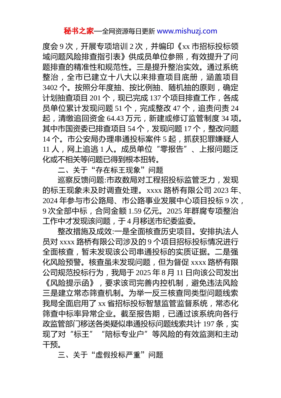 秘书之家—全网资源每日更新 www.mishuzj.comxx 市 xx 局*组关于市委第二巡察组“群腐”专项巡察反馈问题整改情况的报告根据市委统一部署,2025 年 5 月中旬至 6 月中旬,市委第二巡察组对我局牵头负责的招标投标领域突出问题专项整治工作进行了专项巡察。2025 年 x 月 x 日,巡察组向我局*组反馈了巡察意见。局*组高度重视,诚恳接受、坚决整改,切实履行主体责任,成立了整改工作领导小组,制定了整改方案,明确了责任和时限,全力推动整改落实截至目前,巡察反馈的 9 个具体问题中,8 个已整改完成,1 个问题因客观原因正在按计划推进。现将整改情况报告如下:一、关于“主体责任意识淡薄”问题巡察反馈问题:市政数局*组对专项整治重视不够,斗争意识不强,对成员单位上报的不属于招投标的问题,未及时指出;对未上报问题的单位,未督促整改。2025 年整治招标投标突出问题攻坚行动中,市自然资源和城乡建设局将市纪委监委已处理的市民之家不动产登记专区 8 名工作人员玩手机问题上报;市农业农村局将 xxxx 村护坡跨坡、xxx 村xx 桥防撞墩破损,总口管理区 xxxx 办事处道路路基不合格问题上报;截至 2025 年 6 月 25 日,市国资委、市公安局查摆问题数量为 0。整改措施及成效:一是深化整治部署。我局以攻坚行动深化为“系统整治”为契机,于 2025 年 8 月制定印发《全市招标投标领域突出问题系统整治实施方案》,进一步明确了任务分工,压实牵头责任和各成员单位主体责任。二是强化过程督导。坚持“周小结、月调度”机制,加强统筹协调和业务指导。截至报告期,已召开专题部署会、调秘书之家—全网资源每日更新 www.mishuzj.com度会 9 次,开展专项培训 2 次,并编印《xx 市招标投标领域问题风险排查指引表》供成员单位参照,有效提升了问题排查的精准性和规范性。三是提升整治实效。通过系统整治,全市已建立十八大以来排查项目底册,涵盖项目3402 个。按照分年度抽、按比例抽、随机抽的原则,确定计划抽查项目 201 个,现已完成 137 个项目排查工作,各成员单位累计发现问题 51 个,完成整改 47 个,追责问责 24起,清缴追回资金 64.43 万元,新建或修订监管制度 34 项。其中市国资委已排查项目 54 个,发现问题 17 个,整改问题14 个。市公安局办理串通投标案件 5 起,抓获犯罪嫌疑人11 人,网上追逃 1 人。成员单位“零报告”、上报问题泛化或不相关等问题已得到根本扭转。二、关于“存在标王现象”问题巡察反馈问题:市政数局对工程招投标监管乏力,发现的标王现象未及时调查处理。xxxx 路桥有限公司 2023 年、2024 年参与市公路局、市公路事业发展中心项目投标 9 次,9 次全部中标,合同金额 1.59 亿元。2025 年群腐专项整治工作中才发现该问题,于 4 月移送市纪委监委。整改措施及成效:一是全面核查历史项目。安排执法人员对 xxxx 路桥有限公司涉及的 9 个项目招标投标情况进行全面核查,暂未发现该公司串通投标的实质证据。二是强化风险预警。核查虽未发现问题,但为督促 xxxx 路桥有限公司规范投标行为,我局于 2025 年 8 月 11 日向该公司发出《风险提示函》,要求该司完善内控机制,避免违法风险三是建立常态筛查机制。为举一反三核查同类型问题线索我局全面启用了 xx 省招标投标智慧监管监督系统,常态化筛查中标率异常企业。截至报告期,已通过该系统向各行政监管部门移送各类疑似串通投标问题线索共计 197 条,实现了对“标王”“陪标专业户”等风险的有效监测和主动干预。三、关于“虚假投标严重”问题秘书之家—全网资源每日更新 www.mishuzj.com巡察反馈问题:2022 年至 2025 年 5 月市政数局共查办案件 26 起,其中涉及企业通过伪造财务审计报告、项目经理资格证书、虚假业绩承诺等手段骗取中标的虚假投标案件14 起,占比 53.8%。如 xx 国基建设集团有限公司参与市公安局业务技术用房项目投标,提供虚假财务审计报告;xx 建设集团有限公司参与“xxxx”投标,提供的拟派项目经理资格证书系伪造。整改措施及成效:一是列为整治重点。已将虚假投标问题明...