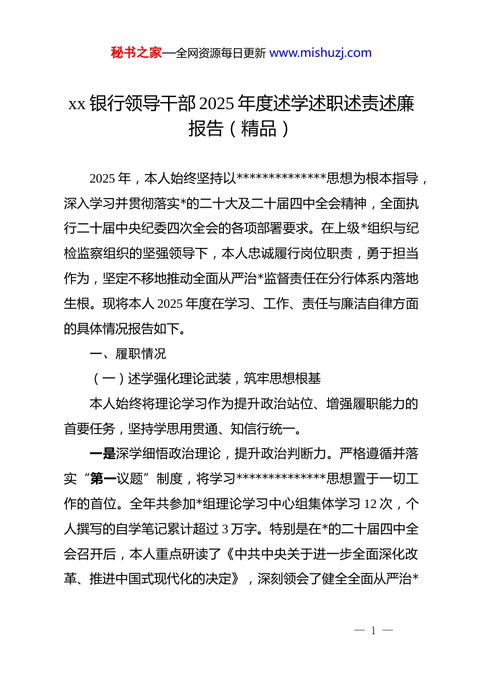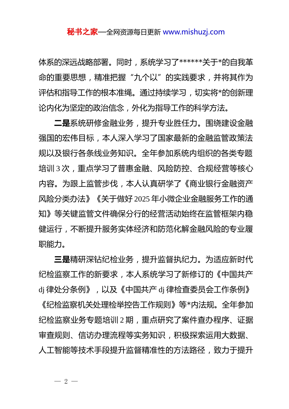 秘书之家—全网资源每日更新 www.mishuzj.comxx 银行领导干部 2025 年度述学述职述责述廉报告(精品)2025 年,本人始终坚持以**************思想为根本指导,深入学习并贯彻落实*的二十大及二十届四中全会精神,全面执行二十届中央纪委四次全会的各项部署要求。在上级*组织与纪检监察组织的坚强领导下,本人忠诚履行岗位职责,勇于担当作为,坚定不移地推动全面从严治*监督责任在分行体系内落地生根。现将本人 2025 年度在学习、工作、责任与廉洁自律方面的具体情况报告如下。一、履职情况(一)述学强化理论武装,筑牢思想根基本人始终将理论学习作为提升政治站位、增强履职能力的首要任务,坚持学思用贯通、知信行统一。一是深学细悟政治理论,提升政治判断力。严格遵循并落实“第一议题”制度,将学习**************思想置于一切工作的首位。全年共参加*组理论学习中心组集体学习 12 次,个人撰写的自学笔记累计超过 3 万字。特别是在*的二十届四中全会召开后,本人重点研读了《中共中央关于进一步全面深化改革、推进中国式现代化的决定》,深刻领会了健全全面从严治*— 1 —秘书之家—全网资源每日更新 www.mishuzj.com体系的深远战略部署。同时,系统学习了******关于*的自我革命的重要思想,精准把握“九个以”的实践要求,并将其作为评估和指导工作的根本准绳。通过持续学习,切实将*的创新理论内化为坚定的政治信念,外化为指导工作的科学方法。二是系统研修金融业务,提升专业胜任力。围绕建设金融强国的宏伟目标,本人深入学习了国家最新的金融监管政策法规以及银行各条线业务知识。全年参加系统内组织的各类专题培训 3 次,重点学习了普惠金融、风险防控、合规经营等核心内容。为跟上监管步伐,本人认真研学了《商业银行金融资产风险分类办法》《关于做好 2025 年小微企业金融服务工作的通知》等关键监管文件确保分行的经营活动始终在监管框架内稳健运行,不断提升服务实体经济和防范化解金融风险的专业履职能力。三是精研深钻纪检业务,提升监督执纪力。为适应新时代纪检监察工作的新要求,本人系统学习了新修订的《中国共产dj 律处分条例》,以及《中国共产 dj 律检查委员会工作条例》《纪检监察机关处理检举控告工作规则》等*内法规。全年参加纪检监察业务专题培训 2 期,重点研究了案件查办程序、证据审查规则、信访办理流程等实务知识,积极探索运用大数据、人工智能等技术手段提升监督精准性的方法路径,致力于提升— 2 —秘书之家—全网资源每日更新 www.mishuzj.com监督执纪的规范化、法治化、正规化水平。四是扎实开展学习教育,提升作风约束力。按照中央统一部署,本人认真组织并深度参与了深入学习贯彻中央八项规定精神学习教育。通过系统学习******关于加强*的作风建设的重要论述,深刻领会中央八项规定及其实施细则的核心要义,全年参加相关专题研讨 4 次,撰写心得体会 2 篇,切实增强了抓作风、树新风的政治自觉、思想自觉和行动自觉。(二)述职聚焦主责主业,服务发展大局本人立足岗位,将学习成果转化为推动分行高质量发展的实际成效,聚焦重点任务,狠抓工作落实。一是全力服务国家战略,推动普惠金融落地。坚决贯彻落实*中央关于金融服务实体经济的决策部署,特别是将支持小微企业发展作为工作的重中之重。在小微企业融资协调机制的落实过程中,本人牵头组织开展专项监督,确保“千企万户大走访”活动不走过场。通过监督检查,督促业务部门优化审批流程、提高服务效能,确保首贷、续贷政策执行到位,信贷资金直达效率显著提升。得益于此协调机制的有效运行,截至 2025年 6 月末,全国银行业对“推荐清单”内经营主体的新发放贷款已达 17.8 万亿元,其中信用贷款占比达到 32.8%,有力地支持了小微企业的生存与发展。我分行普惠型小微企业贷款增速— 3 —秘书之家—全网资源每日更新 www.mishuzj.com也顺利达到预期目标。二是主动防范化解风险,维护区域金融稳定。面对复杂严峻的经济金融形势,本人始终将风险防控置于突出位置。扎实推进风险化解专项监督,紧盯不良资产清收处置、重点领域授信审批、抵押担...