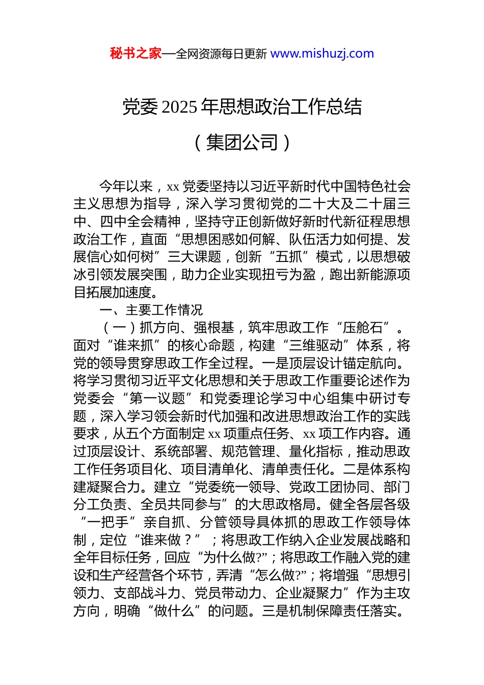 秘书之家—全网资源每日更新 www.mishuzj.com党委 2025 年思想政治工作总结(集团公司)(2 篇)目录1.党委 2025 年思想政治工作总结(集团公司).......................22.党委 2025 年思想政治工作总结(集团公司).....................9秘书之家—全网资源每日更新 www.mishuzj.com党委 2025 年思想政治工作总结(集团公司)今年以来,xx 党委坚持以习近平新时代中国特色社会主义思想为指导,深入学习贯彻党的二十大及二十届三中、四中全会精神,坚持守正创新做好新时代新征程思想政治工作,直面“思想困惑如何解、队伍活力如何提、发展信心如何树”三大课题,创新“五抓”模式,以思想破冰引领发展突围,助力企业实现扭亏为盈,跑出新能源项目拓展加速度。一、主要工作情况(一)抓方向、强根基,筑牢思政工作“压舱石”。面对“谁来抓”的核心命题,构建“三维驱动”体系,将党的领导贯穿思政工作全过程。一是顶层设计锚定航向。将学习贯彻习近平文化思想和关于思政工作重要论述作为党委会“第一议题”和党委理论学习中心组集中研讨专题,深入学习领会新时代加强和改进思想政治工作的实践要求,从五个方面制定 xx 项重点任务、xx 项工作内容。通过顶层设计、系统部署、规范管理、量化指标,推动思政工作任务项目化、项目清单化、清单责任化。二是体系构建凝聚合力。建立“党委统一领导、党政工团协同、部门分工负责、全员共同参与”的大思政格局。健全各层各级“一把手”亲自抓、分管领导具体抓的思政工作领导体制,定位“谁来做?”;将思政工作纳入企业发展战略和全年目标任务,回应“为什么做?”;将思政工作融入党的建设和生产经营各个环节,弄清“怎么做?”;将增强“思想引领力、支部战斗力、党员带动力、企业凝聚力”作为主攻方向,明确“做什么”的问题。三是机制保障责任落实。秘书之家—全网资源每日更新 www.mishuzj.com推动思政工作与党建和企业中心工作同谋划、同部署、同检查、同考核,将思政工作纳入党建、意识形态工作责任制,作为党组织书记抓基层党建工作述职评议的重要内容。实施“三级联查”制度:党委每半年专项督查,党建部每月通报支部思政工作开展情况,党支部每周在“三会一课”中嵌入思想动态分析。建立“思政工作负面清单”,将“职工思想问题处置不及时”“形势教育走过场”等 x 类情形纳入党建考核、党支部书记约谈范围。(二)抓内容、重创新,激活思想教育“动力源”。针对“抓什么”的现实需求,创新教育载体,让思想引领更具穿透力。一是理论武装走深走实。健全“以学铸魂、以学增智、以学正风、以学促干”长效机制,把抓实“关键少数”与拓展“绝大多数”结合起来,打造“线上+线下”学习矩阵。线上强化“学习强国”“公司党建数字化网”学习评价,教育引导党员干部旗帜鲜明讲政治。线下通过个人自学、集体学习、书记领学、专家导学、交流研学、参观见学、开展“一年一主题”形势任务教育,引导职工识“大势”知“小情”,增强全局意识和改革心理承受能力。二是文化浸润入脑入心。实施“奋进文化”落地工程,依托“职工文化月”“x・xx 员工日”系列活动及各类培训,开展首批十大“奋进者”评选表彰,组织开展“践行奋进文化、省身有为”大讨论,加强企业重大主题、特色亮点工作宣传策划,立体化营造,践行“求实、创新、团结、奋进”企业核心价值的良好氛围。三是红色教育铸魂聚力。打造全时域“红色课堂”,通过专题党课、主题宣讲、党支部读书角、观看红色电影、配发学习书籍,参观红色教育基地,讲好公司红色故事,厚植电力产业工人爱党爱国情怀。建立先进典型“选树链”“培育链”“引领链”,促进职工大力践行劳模、工匠、劳动精神。开展道德讲堂、“光盘行动”、学雷锋志愿服务、爱心公益捐助、“七礼八仪”培训等新时代文明实践活动,秘书之家—全网资源每日更新 www.mishuzj.com激发职工见贤思齐正能量。(三)抓人心、办实事,架好联系群众“连心桥”。围绕“怎么抓”的核心问题,坚持以人为本,将思政工作做到职工心坎上。一是谈心谈话打通“堵点”。建立党支部书记联系支委、支委联系党员、党员联系职工...