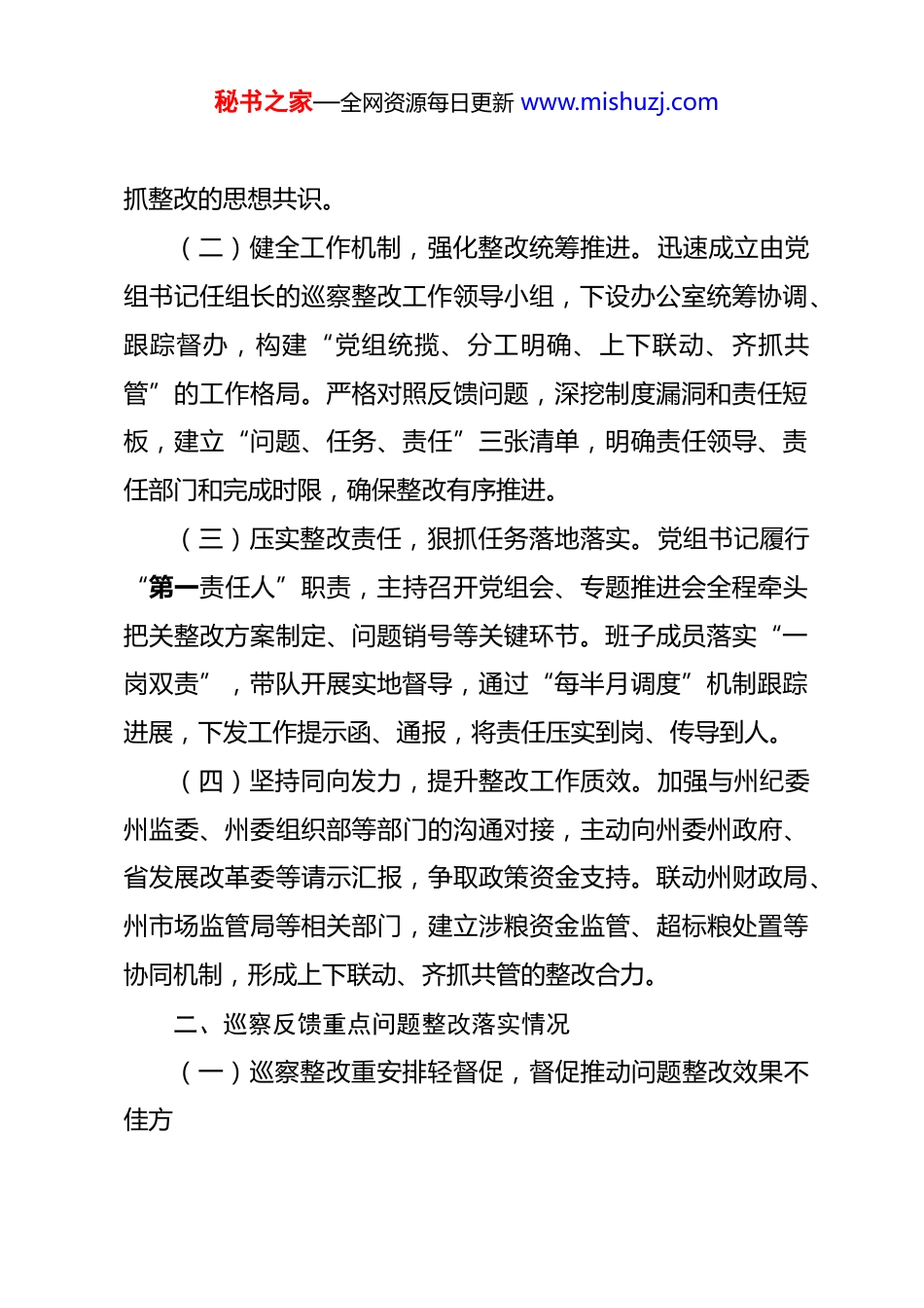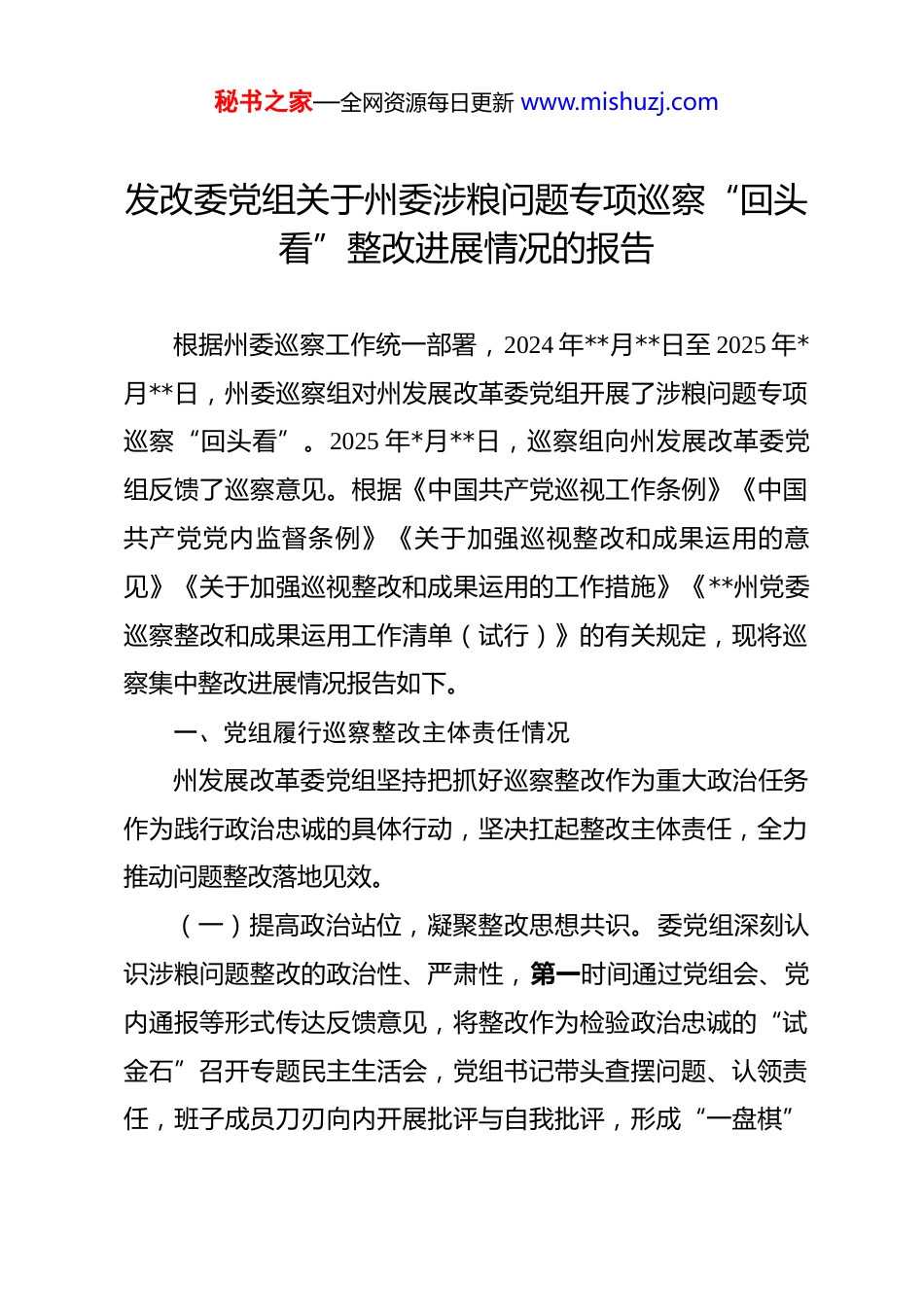 秘书之家—全网资源每日更新 www.mishuzj.com发改委党组关于州委涉粮问题专项巡察“回头看”整改进展情况的报告 根据州委巡察工作统一部署,2024 年**月**日至 2025 年*月**日,州委巡察组对州发展改革委党组开展了涉粮问题专项巡察“回头看”。2025 年*月**日,巡察组向州发展改革委党组反馈了巡察意见。根据《中国共产党巡视工作条例》《中国共产党党内监督条例》《关于加强巡视整改和成果运用的意见》《关于加强巡视整改和成果运用的工作措施》《**州党委巡察整改和成果运用工作清单(试行)》的有关规定,现将巡察集中整改进展情况报告如下。一、党组履行巡察整改主体责任情况州发展改革委党组坚持把抓好巡察整改作为重大政治任务作为践行政治忠诚的具体行动,坚决扛起整改主体责任,全力推动问题整改落地见效。(一)提高政治站位,凝聚整改思想共识。委党组深刻认识涉粮问题整改的政治性、严肃性,第一时间通过党组会、党内通报等形式传达反馈意见,将整改作为检验政治忠诚的“试金石”召开专题民主生活会,党组书记带头查摆问题、认领责任,班子成员刀刃向内开展批评与自我批评,形成“一盘棋”秘书之家—全网资源每日更新 www.mishuzj.com抓整改的思想共识。(二)健全工作机制,强化整改统筹推进。迅速成立由党组书记任组长的巡察整改工作领导小组,下设办公室统筹协调、跟踪督办,构建“党组统揽、分工明确、上下联动、齐抓共管”的工作格局。严格对照反馈问题,深挖制度漏洞和责任短板,建立“问题、任务、责任”三张清单,明确责任领导、责任部门和完成时限,确保整改有序推进。(三)压实整改责任,狠抓任务落地落实。党组书记履行“第一责任人”职责,主持召开党组会、专题推进会全程牵头把关整改方案制定、问题销号等关键环节。班子成员落实“一岗双责”,带队开展实地督导,通过“每半月调度”机制跟踪进展,下发工作提示函、通报,将责任压实到岗、传导到人。(四)坚持同向发力,提升整改工作质效。加强与州纪委州监委、州委组织部等部门的沟通对接,主动向州委州政府、省发展改革委等请示汇报,争取政策资金支持。联动州财政局、州市场监管局等相关部门,建立涉粮资金监管、超标粮处置等协同机制,形成上下联动、齐抓共管的整改合力。二、巡察反馈重点问题整改落实情况(一)巡察整改重安排轻督促,督促推动问题整改效果不佳方秘书之家—全网资源每日更新 www.mishuzj.com1.州粮油质量检测中心设备闲置方面。州粮油质量检测中心获农药残留、真菌毒素资质扩项认定,闲置的检测设备已投入使用,并开展相关培训及检测工作。2.库区管理混乱方面。完成库区物理隔离,修订完善库区《值班值守制度》,强化库区安全管控。3.粮食干部队伍建设有差距方面。制定《2025 年度干部职工履职情况专项调研工作方案》,对全委干部队伍建设情况、干部职工履职情况进行了专项调研,充分掌握干部职工思想动态、履职表现情况。根据调研情况和干部个人能力特长进行岗位调整,目前科室结构、工作人员力量趋于合理。(二)系统整改推动整体提升有差距,对县级涉粮问题整改督促推动不力方面。1.**县粮权不归政府方面。**县修订完善《**县县级储备粮油管理制度》,目前食用油、成品粮由县级承储企业直接储存,粮权属于**县人民政府,并严格按照要求按时足量拨付保管费、轮换费等费用。2.仓储保管人员无证上岗占比高方面。组织仓储保管人员参加省粮食和储备局举办的 2025 年粮油仓储保管员(初级)粮油质量检验员(中级)职业技能培训,同时调整持证人员担任保管员,目前全州粮库保管员持证率为 100%。秘书之家—全网资源每日更新 www.mishuzj.com3.部分国有粮食企业落实政策性粮食储备和经营性业务分离要求有差距方面。指导**市出台改革方案,并按方案要求完成营业执照变更、法人变更、人员调整等工作,实现人员、实物、财务、账务“四分开”。指导**县将 7 处闲置资产划转至****农垦公司。督促指导福泉市完成企业经营和储备业务人员、实物、财务、账务分离。督促指导**县按程序注销**商贸公司。(三)问题整改边改边犯,巡察整改长效机制不健全方面。1.学习不及时方面。全...