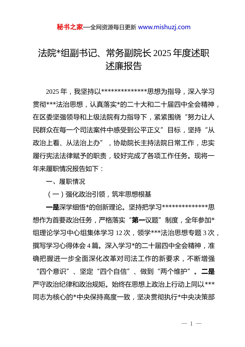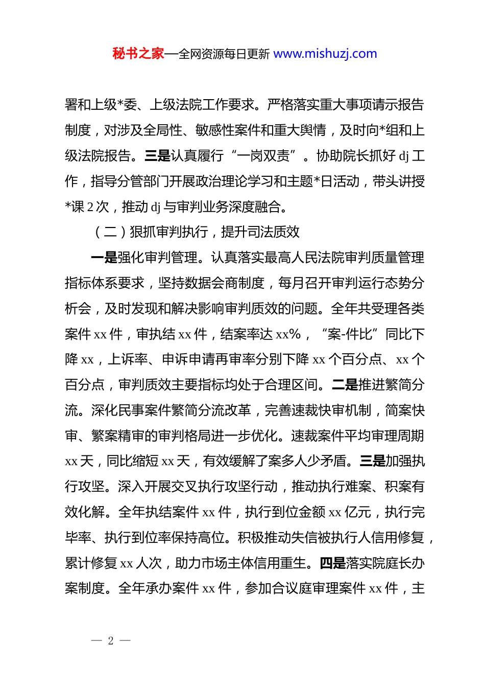 秘书之家—全网资源每日更新 www.mishuzj.com法院*组副书记、常务副院长 2025 年度述职述廉报告2025 年,我坚持以**************思想为指导,深入学习贯彻***法治思想,认真落实*的二十大和二十届四中全会精神,在区委坚强领导和上级法院有力指导下,紧紧围绕“努力让人民群众在每一个司法案件中感受到公平正义”目标,坚持“从政治上看、从法治上办”,协助院长主持法院日常工作,忠实履行宪法法律赋予的职责,较好完成了各项工作任务。现将一年来履职情况报告如下:一、履职情况(一)强化政治引领,筑牢思想根基一是深学细悟*的创新理论。坚持把学习**************思想作为首要政治任务,严格落实“第一议题”制度,全年参加*组理论学习中心组集体学习 12 次,领学***法治思想专题 3 次,撰写学习心得体会 4 篇。深入学习*的二十届四中全会精神,准确把握进一步全面深化改革对司法工作的新要求,不断增强“四个意识”、坚定“四个自信”、做到“两个维护”。二是严守政治纪律和政治规矩。始终在思想上政治上行动上同以***同志为核心的*中央保持高度一致,坚决贯彻执行*中央决策部— 1 —秘书之家—全网资源每日更新 www.mishuzj.com署和上级*委、上级法院工作要求。严格落实重大事项请示报告制度,对涉及全局性、敏感性案件和重大舆情,及时向*组和上级法院报告。三是认真履行“一岗双责”。协助院长抓好 dj 工作,指导分管部门开展政治理论学习和主题*日活动,带头讲授*课 2 次,推动 dj 与审判业务深度融合。(二)狠抓审判执行,提升司法质效一是强化审判管理。认真落实最高人民法院审判质量管理指标体系要求,坚持数据会商制度,每月召开审判运行态势分析会,及时发现和解决影响审判质效的问题。全年共受理各类案件 xx 件,审执结 xx 件,结案率达 xx%,“案-件比”同比下降 xx,上诉率、申诉申请再审率分别下降 xx 个百分点、xx 个百分点,审判质效主要指标均处于合理区间。二是推进繁简分流。深化民事案件繁简分流改革,完善速裁快审机制,简案快审、繁案精审的审判格局进一步优化。速裁案件平均审理周期xx 天,同比缩短 xx 天,有效缓解了案多人少矛盾。三是加强执行攻坚。深入开展交叉执行攻坚行动,推动执行难案、积案有效化解。全年执结案件 xx 件,执行到位金额 xx 亿元,执行完毕率、执行到位率保持高位。积极推动失信被执行人信用修复,累计修复 xx 人次,助力市场主体信用重生。四是落实院庭长办案制度。全年承办案件 xx 件,参加合议庭审理案件 xx 件,主— 2 —秘书之家—全网资源每日更新 www.mishuzj.com持审判委员会讨论案件 xx 件,切实发挥示范引领作用。严格履行案件阅核职责,全年阅核案件 xx 件,有效防范“四类案件”风险。(三)服务中心大局,优化法治环境一是护航经济发展。深入开展规范涉企执法司法专项行动,依法平等保护各类经营主体合法权益。妥善审理涉民营企业案件 xx 件,帮助企业挽回经济损失 xx 万元。审结破产案件 xx 件,推动 xx 家“僵尸企业”依法出清、xx 家困难企业脱困重生。积极参与营商环境优化,主动走访企业 xx 家,开展法律服务活动xx 次。二是保障民生福祉。践行“如我在诉”理念,用心用情办好涉民生案件。审结劳动争议、婚姻家庭、民间借贷等涉民生案件 xx 件,依法维护群众合法权益。开展“根治欠薪”专项行动,帮助农民工追回劳动报酬 xx 万元。三是推进诉源治理。坚持“抓前端、治未病”,主动融入基层社会治理大格局。派驻诉讼服务团队入驻县级综治中心,先行调解成功案件 xx 件,调解成功案件自动履行率超过 90%。深化“法官包乡”工作机制,开展巡回审判、以案释法活动 xx 次,从源头预防和减少矛盾纠纷。(四)深化司法改革,激发内生动力一是落实司法责任制。健全“让审理者裁判、由裁判者负— 3 —秘书之家—全网资源每日更新 www.mishuzj.com责”的司法责任制,完善权责清单,规范院庭长审判监督管理职责。建立案件质量评查常态化机制,全年评查案件 xx 件,发现并整改问题 xx 个。二是推进数字法院建设。积极应用“全国法院一张...