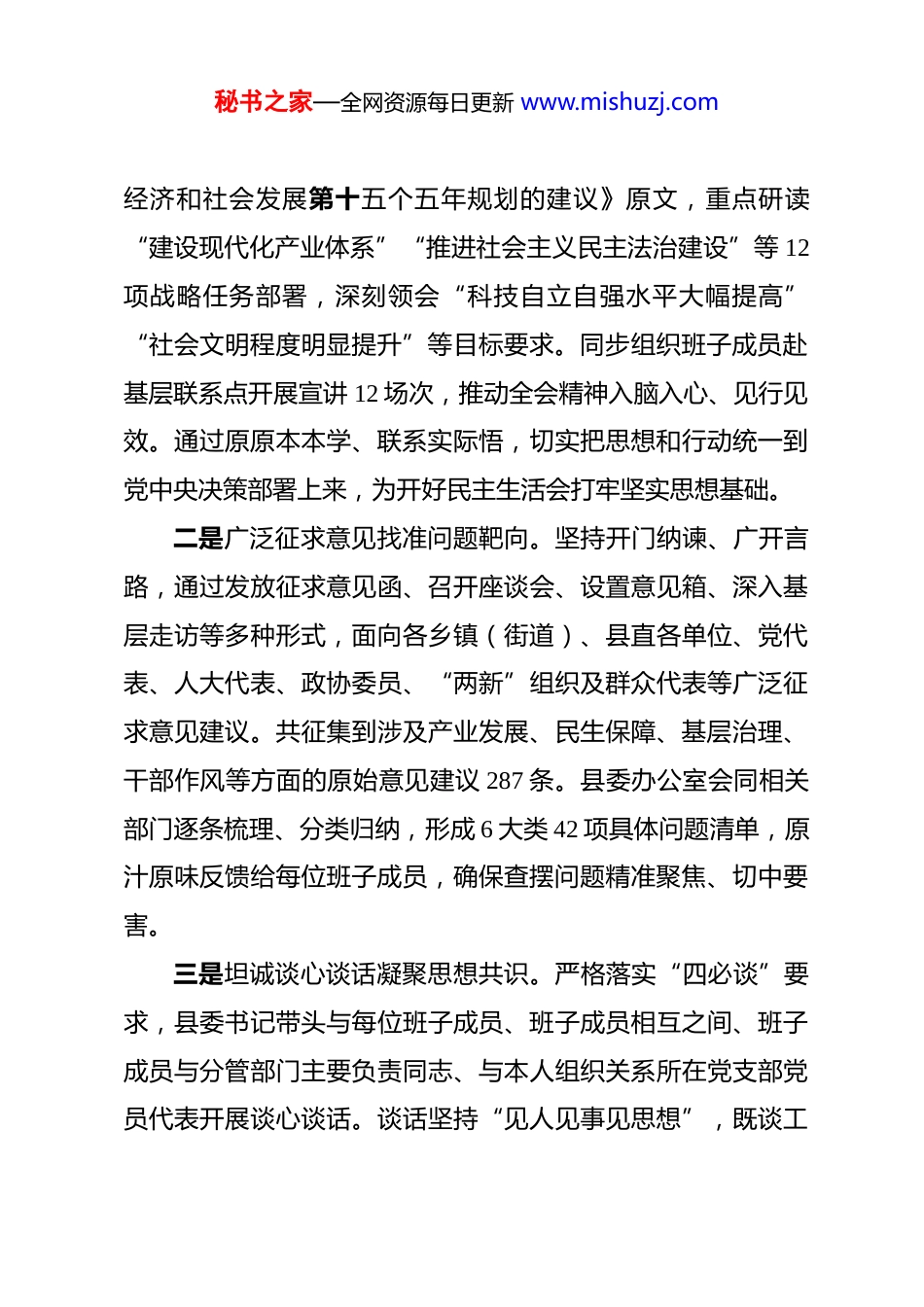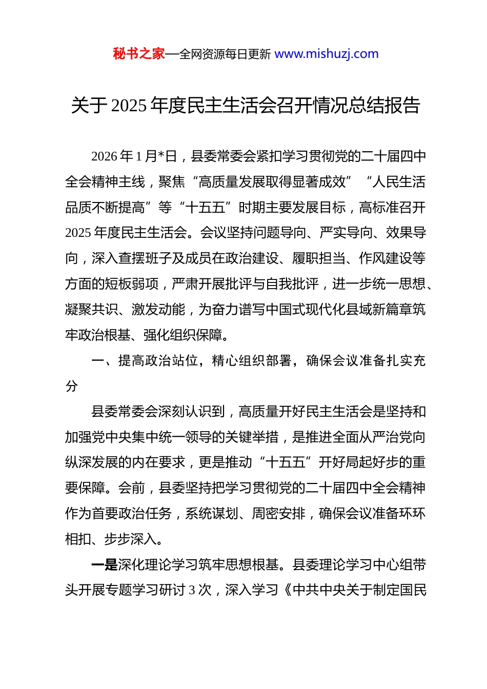 秘书之家—全网资源每日更新 www.mishuzj.com关于 2025 年度民主生活会召开情况总结报告 2026 年 1 月*日,县委常委会紧扣学习贯彻党的二十届四中全会精神主线,聚焦“高质量发展取得显著成效”“人民生活品质不断提高”等“十五五”时期主要发展目标,高标准召开2025 年度民主生活会。会议坚持问题导向、严实导向、效果导向,深入查摆班子及成员在政治建设、履职担当、作风建设等方面的短板弱项,严肃开展批评与自我批评,进一步统一思想、凝聚共识、激发动能,为奋力谱写中国式现代化县域新篇章筑牢政治根基、强化组织保障。一、提高政治站位,精心组织部署,确保会议准备扎实充分县委常委会深刻认识到,高质量开好民主生活会是坚持和加强党中央集中统一领导的关键举措,是推进全面从严治党向纵深发展的内在要求,更是推动“十五五”开好局起好步的重要保障。会前,县委坚持把学习贯彻党的二十届四中全会精神作为首要政治任务,系统谋划、周密安排,确保会议准备环环相扣、步步深入。一是深化理论学习筑牢思想根基。县委理论学习中心组带头开展专题学习研讨 3 次,深入学习《中共中央关于制定国民秘书之家—全网资源每日更新 www.mishuzj.com经济和社会发展第十五个五年规划的建议》原文,重点研读“建设现代化产业体系”“推进社会主义民主法治建设”等 12项战略任务部署,深刻领会“科技自立自强水平大幅提高”“社会文明程度明显提升”等目标要求。同步组织班子成员赴基层联系点开展宣讲 12 场次,推动全会精神入脑入心、见行见效。通过原原本本学、联系实际悟,切实把思想和行动统一到党中央决策部署上来,为开好民主生活会打牢坚实思想基础。二是广泛征求意见找准问题靶向。坚持开门纳谏、广开言路,通过发放征求意见函、召开座谈会、设置意见箱、深入基层走访等多种形式,面向各乡镇(街道)、县直各单位、党代表、人大代表、政协委员、“两新”组织及群众代表等广泛征求意见建议。共征集到涉及产业发展、民生保障、基层治理、干部作风等方面的原始意见建议 287 条。县委办公室会同相关部门逐条梳理、分类归纳,形成 6 大类 42 项具体问题清单,原汁原味反馈给每位班子成员,确保查摆问题精准聚焦、切中要害。三是坦诚谈心谈话凝聚思想共识。严格落实“四必谈”要求,县委书记带头与每位班子成员、班子成员相互之间、班子成员与分管部门主要负责同志、与本人组织关系所在党支部党员代表开展谈心谈话。谈话坚持“见人见事见思想”,既谈工秘书之家—全网资源每日更新 www.mishuzj.com作表现,更谈思想动态;既指出对方存在的问题,又主动查摆自身不足。累计开展谈心谈话 156 人次,真正把问题谈开、把思想谈通、把意见谈好,为开展批评与自我批评营造了良好氛围。四是深刻检视剖析撰写发言提纲。县委常委班子及每位成员严格对照党章党规,对照初心使命,对照群众期盼,紧密联系 2025 年履职尽责和廉洁自律情况,重点从带头强化政治忠诚、提高政治能力,带头固本培元、增强党性,带头敬畏人民、敬畏组织、敬畏法纪,带头干事创业、担当作为,带头坚决扛起管党治党责任等方面,深入查摆突出问题,深刻剖析问题根源,明确整改方向和措施。县委书记亲自主持起草班子对照检查材料,并对每位班子成员的个人发言提纲逐一审阅把关,确保查摆问题不遮不掩、原因剖析见筋见骨、整改措施务实管用。二、坚持刀刃向内,严肃开展批评,确保会议氛围既严又实会议通报了 2024 年度民主生活会整改措施落实情况和本次民主生活会征求意见情况。县委书记代表县委常委班子作对照检查,带头开展自我批评,主动认领责任。随后,各位常委同志逐一进行个人对照检查,严肃认真开展批评与自我批评。整个会议过程既有红脸出汗的紧张严肃,又有加油鼓劲的团结和秘书之家—全网资源每日更新 www.mishuzj.com谐,达到了统一思想、增进团结、改进工作的预期目的。一是查摆问题精准深刻。班子对照检查材料聚焦主责主业,深入查摆在推动高质量发展、增进民生福祉、防范化解风险等方面存在的差距。例如,在推动产业转型升级上,存在对新兴产业培育不够快、传统产业升级步伐不够大的...