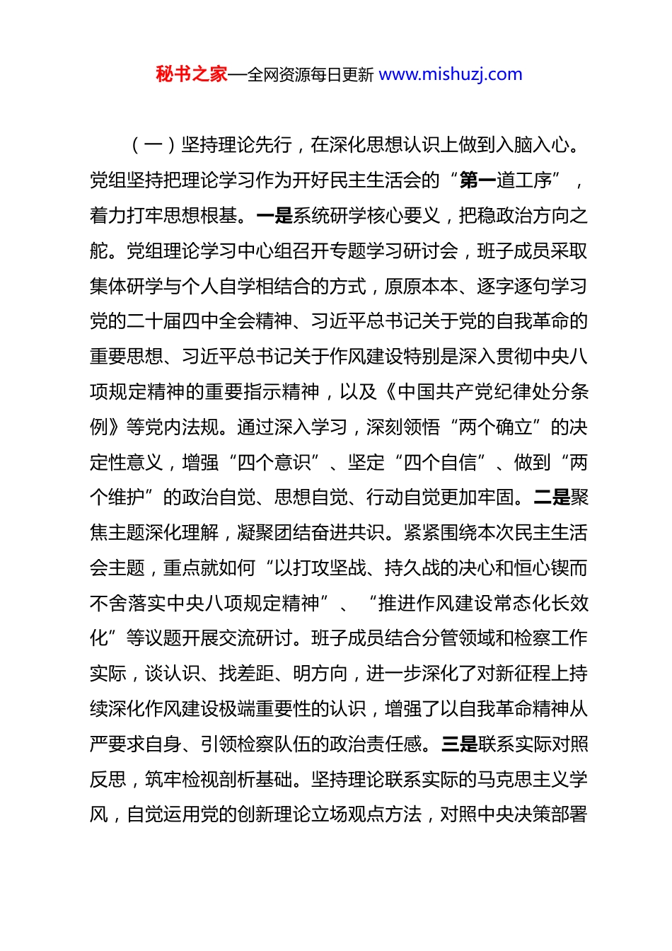 秘书之家—全网资源每日更新 www.mishuzj.com关于市检察院党组 2025 年度民主生活会召开情况的报告 市委、省人民检察院党组:根据中央、省委和市委的统一部署,在省院和市委督导组的悉心指导下,市检察院党组于近期召开了 2025 年度民主生活会。此次会议紧扣“深入学习贯彻习近平新时代中国特色社会主义思想,全面贯彻落实党的二十届四中全会精神,以打攻坚战、持久战的决心和恒心,锲而不舍落实中央八项规定精神,推进作风建设常态化长效化,以优良作风凝心聚力、真抓实干,奋力开创中国式现代化建设新局面”这一主题。党组班子及成员严格遵循“团结—批评—团结”的方针,紧密联系思想、工作和作风实际,深入进行对照检查、党性分析,严肃认真开展批评和自我批评,经历了一次深刻的政治体检、思想除尘和党性淬炼,达到了统一思想、增进团结、改进工作的预期目的。现将有关情况报告如下。一、深学细照、夯实根基:会前准备工作扎实充分为确保民主生活会开出高质量、好效果,市检察院党组坚持高标准、严要求,将扎实细致的准备工作贯穿始终,为会议顺利召开奠定了坚实的思想基础、组织基础和材料基础。秘书之家—全网资源每日更新 www.mishuzj.com(一)坚持理论先行,在深化思想认识上做到入脑入心。党组坚持把理论学习作为开好民主生活会的“第一道工序”,着力打牢思想根基。一是系统研学核心要义,把稳政治方向之舵。党组理论学习中心组召开专题学习研讨会,班子成员采取集体研学与个人自学相结合的方式,原原本本、逐字逐句学习党的二十届四中全会精神、习近平总书记关于党的自我革命的重要思想、习近平总书记关于作风建设特别是深入贯彻中央八项规定精神的重要指示精神,以及《中国共产党纪律处分条例》等党内法规。通过深入学习,深刻领悟“两个确立”的决定性意义,增强“四个意识”、坚定“四个自信”、做到“两个维护”的政治自觉、思想自觉、行动自觉更加牢固。二是聚焦主题深化理解,凝聚团结奋进共识。紧紧围绕本次民主生活会主题,重点就如何“以打攻坚战、持久战的决心和恒心锲而不舍落实中央八项规定精神”、“推进作风建设常态化长效化”等议题开展交流研讨。班子成员结合分管领域和检察工作实际,谈认识、找差距、明方向,进一步深化了对新征程上持续深化作风建设极端重要性的认识,增强了以自我革命精神从严要求自身、引领检察队伍的政治责任感。三是联系实际对照反思,筑牢检视剖析基础。坚持理论联系实际的马克思主义学风,自觉运用党的创新理论立场观点方法,对照中央决策部署秘书之家—全网资源每日更新 www.mishuzj.com和省委、市委工作要求,对照人民群众对公平正义的新期待,提前审视自身在政治素养、履职能力、工作作风等方面存在的不足,为后续深入查摆问题、深刻剖析根源做好了充分的理论和思想准备。(二)坚持广开言路,在征求意见建议上做到求深求实。党组秉持开门纳谏、闻过则喜的态度,多层次、多渠道广泛征求各方面意见。一是征求意见范围求“广”。采取发放征求意见函、设置意见箱、召开座谈会、个别访谈等多种形式,广泛听取上级检察机关、市级相关党政部门、人大代表、政协委员、人民监督员、律师代表以及本院各内设机构、基层检察院党员干警和群众代表的意见建议。确保征求意见覆盖“上下左右”,全方位收集对党组班子和成员在政治建设、履职尽责、作风建设、廉洁自律等方面的真实评价和期望。二是梳理反馈问题求“准”。对征集到的所有意见建议,由机关党委专人负责,进行原汁原味梳理、分门别类汇总,并原原本本反馈给党组班子和每位成员。党组召开专题会议,对反映集中的突出问题进行集体“会诊”,确保问题找得准、画像画得像,不回避矛盾、不遮掩问题。三是吸纳转化意见求“实”。将征求到的意见建议作为撰写对照检查材料和个人发言提纲的重要依据。班子成员主动认领涉及自身和分管领域的问题,将其融入自我剖析内秘书之家—全网资源每日更新 www.mishuzj.com容,确保查摆问题接地气、有针对性,使民主生活会真正成为倾听民意、汇聚民智、改进工作的重要途径。(三)坚持坦诚相见,在开展谈心谈话上做到见人见事。党组严格落...