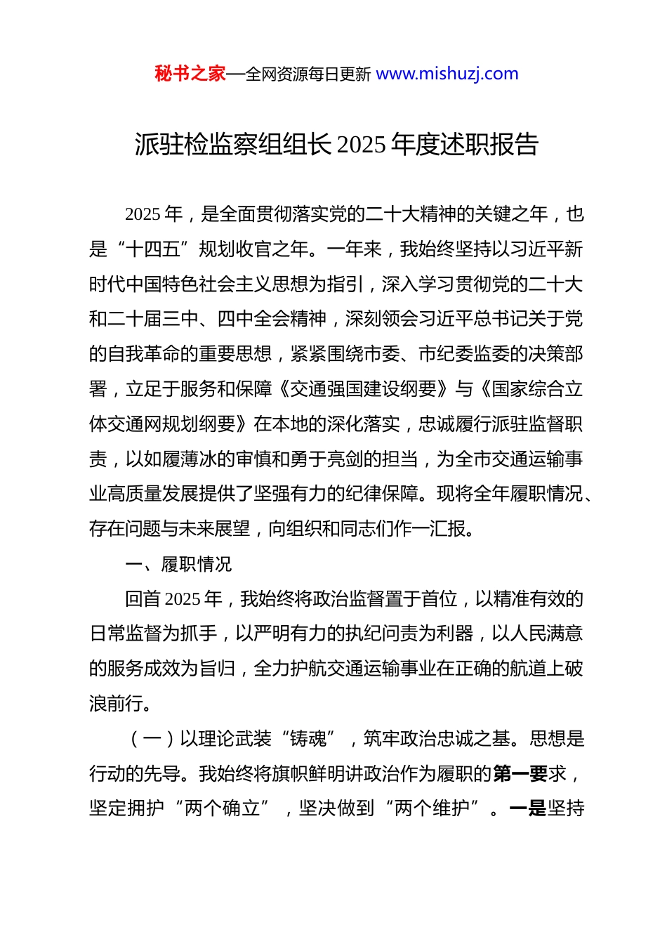 秘书之家—全网资源每日更新 www.mishuzj.com派驻检监察组组长 2025 年度述职报告 2025 年,是全面贯彻落实党的二十大精神的关键之年,也是“十四五”规划收官之年。一年来,我始终坚持以习近平新时代中国特色社会主义思想为指引,深入学习贯彻党的二十大和二十届三中、四中全会精神,深刻领会习近平总书记关于党的自我革命的重要思想,紧紧围绕市委、市纪委监委的决策部署,立足于服务和保障《交通强国建设纲要》与《国家综合立体交通网规划纲要》在本地的深化落实,忠诚履行派驻监督职责,以如履薄冰的审慎和勇于亮剑的担当,为全市交通运输事业高质量发展提供了坚强有力的纪律保障。现将全年履职情况、存在问题与未来展望,向组织和同志们作一汇报。一、履职情况回首 2025 年,我始终将政治监督置于首位,以精准有效的日常监督为抓手,以严明有力的执纪问责为利器,以人民满意的服务成效为旨归,全力护航交通运输事业在正确的航道上破浪前行。(一)以理论武装“铸魂”,筑牢政治忠诚之基。思想是行动的先导。我始终将旗帜鲜明讲政治作为履职的第一要求,坚定拥护“两个确立”,坚决做到“两个维护”。一是坚持秘书之家—全网资源每日更新 www.mishuzj.com“首课”引领,理论根基不断夯实。将学习习近平新时代中国特色社会主义思想作为首要政治任务和终身必修课,组织纪检监察组集中学习 25 次,带头参加局党组理论学习中心组学习 9次,撰写交流发言材料 4 篇,确保在思想上政治上行动上同以习近平同志为核心的党中央保持高度一致。二是深化学习教育,作风堤坝持续加固。扎实开展中央八项规定精神学习教育,深入研学习近平总书记关于作风建设的重要论述,按照“学查改一体推进”的要求,督促驻在单位开展专题学习研讨 4 次,以案为鉴,以案明纪,引导广大党员干部知敬畏、存戒惧、守底线。三是严守纪律规矩,政治本色更加鲜明。严格执行请示报告制度,对重大事项、重要工作第一时间向市纪委监委和局党组报告,确保监督执纪执法工作始终沿着正确的政治方向前进。(二)高悬监督“利剑”,保障决策部署落地生根。监督是纪检监察机关的第一职责。我聚焦“监督的再监督”定位,确保党中央政令畅通、令行禁止。一是政治监督精准化。紧盯“国之大者”,围绕交通强国建设、国家综合立体交通网规划实施等重大战略,对“十五五”交通规划编制、重大项目推进等关键环节开展专项监督 5 次,发现并督促整改问题 7 个,确保交通运输工作始终服务于国家发展大局。二是日常监督常态化。坚持抓早抓小、防微渐杜,全年列席局党组会议、局长办秘书之家—全网资源每日更新 www.mishuzj.com公会等重要会议 85 次,对涉及的 45 项“三重一大”事项进行专项监督,确保决策科学民主、权力规范运行。针对工程招投标、资金管理等高风险领域,制发纪检监察建议书 9 份,推动驻在单位完善相关制度机制 14 项,切实将监督融入日常、做在经常。三是执纪问责严肃化。坚持严的基调不动摇,精准运用“四种形态”处理 18 人次,其中第一种形态 11 人次,第二种形态 6 人次,第三种形态 1 人次,真正做到惩前毖后、治病救人。共处置问题线索 17 件,党纪政务立案 7 人,给予党纪政务处分 5 人,以零容忍的态度坚决惩治腐败。(三)力行“人民至上”,整治群众身边急难愁盼。我始终牢记江山就是人民、人民就是江山,坚决向群众身边的“微腐败”和不正之风亮剑。一是聚焦民生实事,靶向治理顽瘴痼疾。针对货车司机投诉处置效率不高、农村地区领取快件违规收费这两件群众反映强烈的民生实事,会同驻在部门召开专题推进会 14 次,下发监察建议书 1 份,督促出台针对性制度 5 项,推动解决问题 52 个,移送问题线索 4 件,让群众在交通领域的获得感、幸福感、安全感更加充实。二是畅通诉求渠道,严查快办信访举报。对反映富源大队协管人员利用执法便利私分罚没款的问题线索,迅速响应、果断出击,最终查实并收缴违纪违法款项 21 万余元,维护了执法队伍的纯洁性和人民群众的切秘书之家—全网资源每日更新 www.mishuzj.com身利益。三是强化警示震慑,持续净化行...