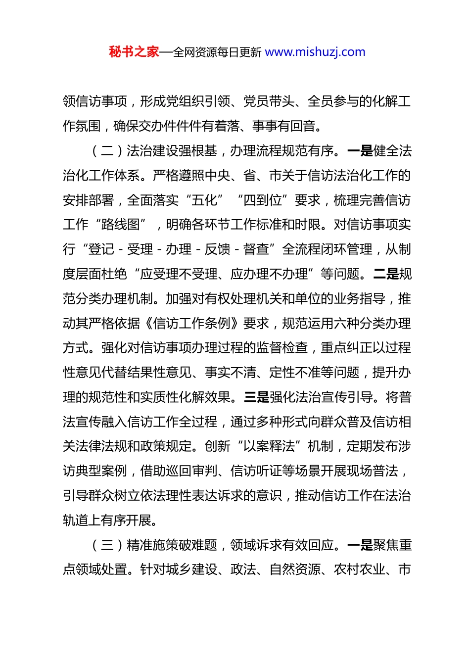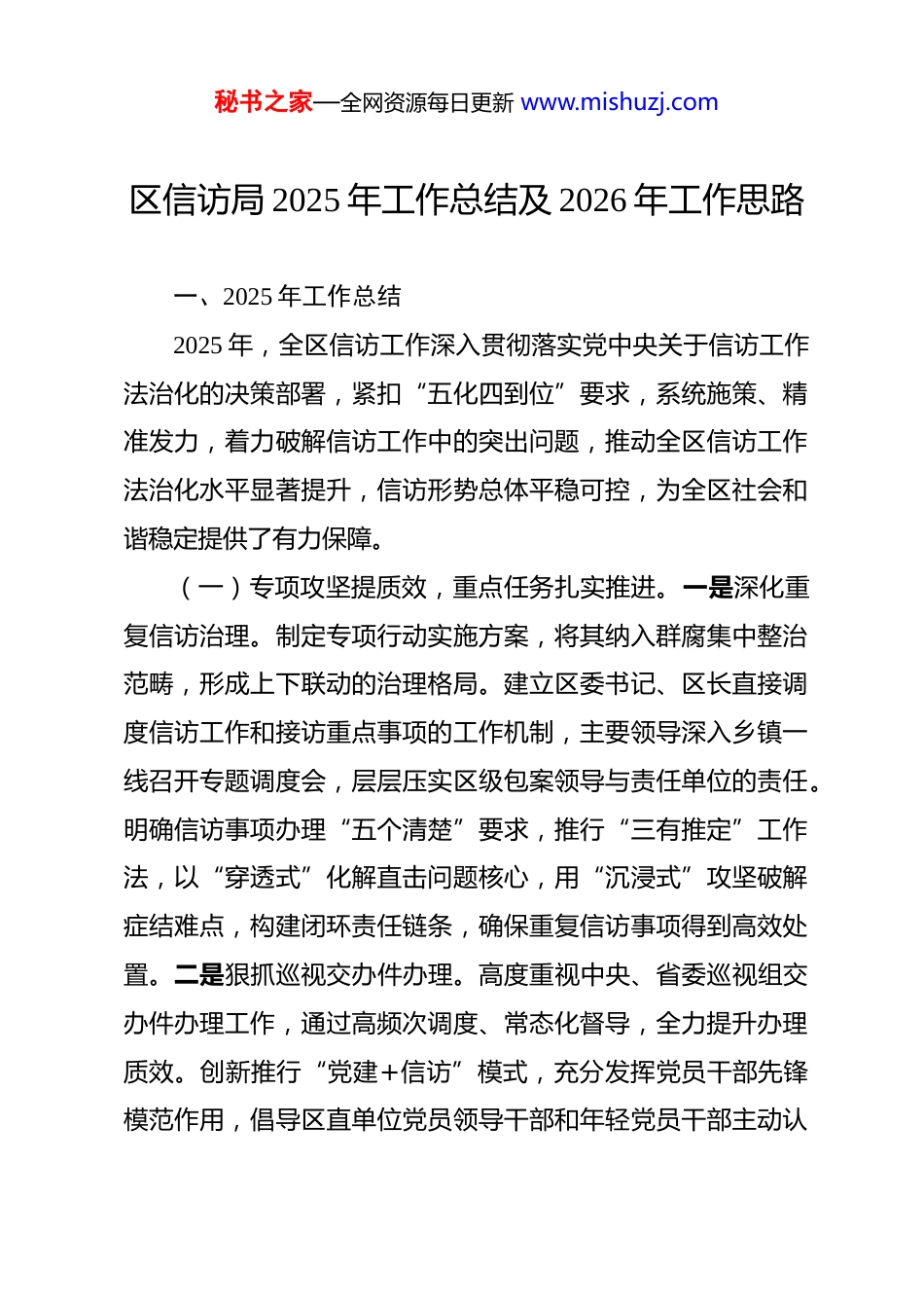 秘书之家—全网资源每日更新 www.mishuzj.com区信访局 2025 年工作总结及 2026 年工作思路 一、2025 年工作总结2025 年,全区信访工作深入贯彻落实党中央关于信访工作法治化的决策部署,紧扣“五化四到位”要求,系统施策、精准发力,着力破解信访工作中的突出问题,推动全区信访工作法治化水平显著提升,信访形势总体平稳可控,为全区社会和谐稳定提供了有力保障。(一)专项攻坚提质效,重点任务扎实推进。一是深化重复信访治理。制定专项行动实施方案,将其纳入群腐集中整治范畴,形成上下联动的治理格局。建立区委书记、区长直接调度信访工作和接访重点事项的工作机制,主要领导深入乡镇一线召开专题调度会,层层压实区级包案领导与责任单位的责任。明确信访事项办理“五个清楚”要求,推行“三有推定”工作法,以“穿透式”化解直击问题核心,用“沉浸式”攻坚破解症结难点,构建闭环责任链条,确保重复信访事项得到高效处置。二是狠抓巡视交办件办理。高度重视中央、省委巡视组交办件办理工作,通过高频次调度、常态化督导,全力提升办理质效。创新推行“党建+信访”模式,充分发挥党员干部先锋模范作用,倡导区直单位党员领导干部和年轻党员干部主动认秘书之家—全网资源每日更新 www.mishuzj.com领信访事项,形成党组织引领、党员带头、全员参与的化解工作氛围,确保交办件件件有着落、事事有回音。(二)法治建设强根基,办理流程规范有序。一是健全法治化工作体系。严格遵照中央、省、市关于信访法治化工作的安排部署,全面落实“五化”“四到位”要求,梳理完善信访工作“路线图”,明确各环节工作标准和时限。对信访事项实行“登记-受理-办理-反馈-督查”全流程闭环管理,从制度层面杜绝“应受理不受理、应办理不办理”等问题。二是规范分类办理机制。加强对有权处理机关和单位的业务指导,推动其严格依据《信访工作条例》要求,规范运用六种分类办理方式。强化对信访事项办理过程的监督检查,重点纠正以过程性意见代替结果性意见、事实不清、定性不准等问题,提升办理的规范性和实质性化解效果。三是强化法治宣传引导。将普法宣传融入信访工作全过程,通过多种形式向群众普及信访相关法律法规和政策规定。创新“以案释法”机制,定期发布涉访典型案例,借助巡回审判、信访听证等场景开展现场普法,引导群众树立依法理性表达诉求的意识,推动信访工作在法治轨道上有序开展。(三)精准施策破难题,领域诉求有效回应。一是聚焦重点领域处置。针对城乡建设、政法、自然资源、农村农业、市秘书之家—全网资源每日更新 www.mishuzj.com场监管、劳动和社会保障、纪检监察等诉求集中的七大领域,建立重点领域信访问题分析研判机制,定期梳理突出矛盾和共性问题。统筹协调相关职能部门,组建专项工作小组,开展联合处置,精准回应群众在征地拆迁、劳动保障、涉法涉诉等方面的合理诉求。二是强化矛盾源头排查。依托基层社会治理和城乡网格化服务管理体系,常态化开展矛盾纠纷排查工作。拓宽排查渠道,延伸排查触角,重点关注村级财务公开、邻里矛盾、土地承包流转等易引发信访问题的领域,及时发现潜在隐患,建立台账、动态跟踪,力争将矛盾化解在萌芽状态。三是优化多元化解路径。充分发挥“三调联动”作用,整合人民调解、行政调解、司法调解资源,将调解贯穿信访事项办理全过程。针对复杂疑难信访问题,邀请法律专家、人大代表、政协委员等参与调处,通过听证评议、评估评查等方式,拓宽化解思路,提升化解效果,最大限度减少“信转访”“初转重”“个转群”现象。(四)机制创新强保障,工作合力全面凝聚。一是完善统筹协调机制。强化信访工作联席会议的统筹协调职能,定期召开联席会议,研究解决跨部门、跨领域的复杂信访问题。建立信息共享、责任共担、联合处置的工作机制,打破部门壁垒,凝聚工作合力,提升信访问题化解效率。二是健全督导考核机秘书之家—全网资源每日更新 www.mishuzj.com制。建立健全信访工作督导考核体系,将信访事项办理质效、重复信访化解率、群众满意度等指标纳入年度考核。通过常态化督查、专项督办等方式,加强对责任单位的监...