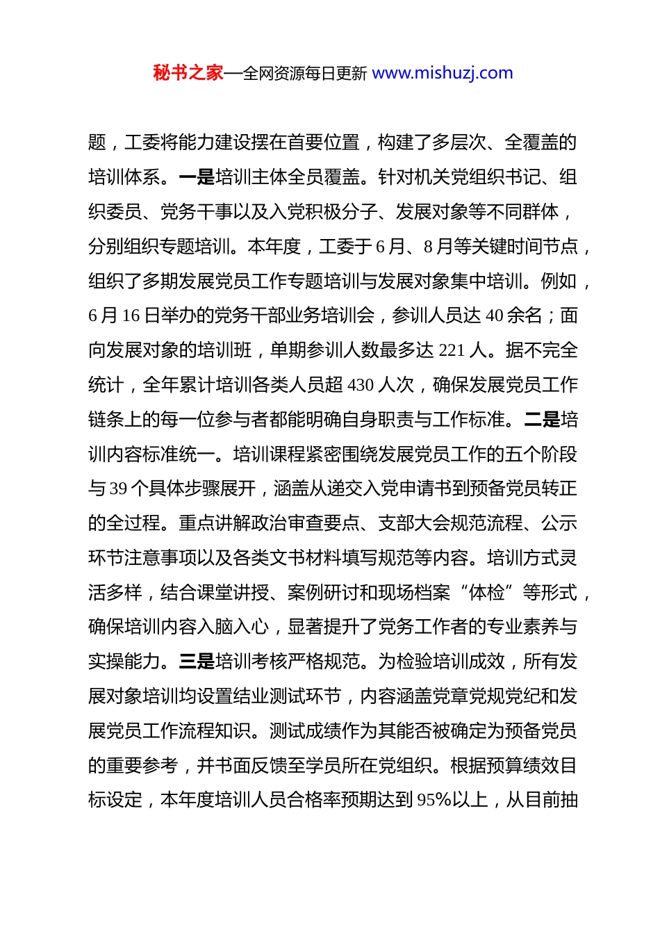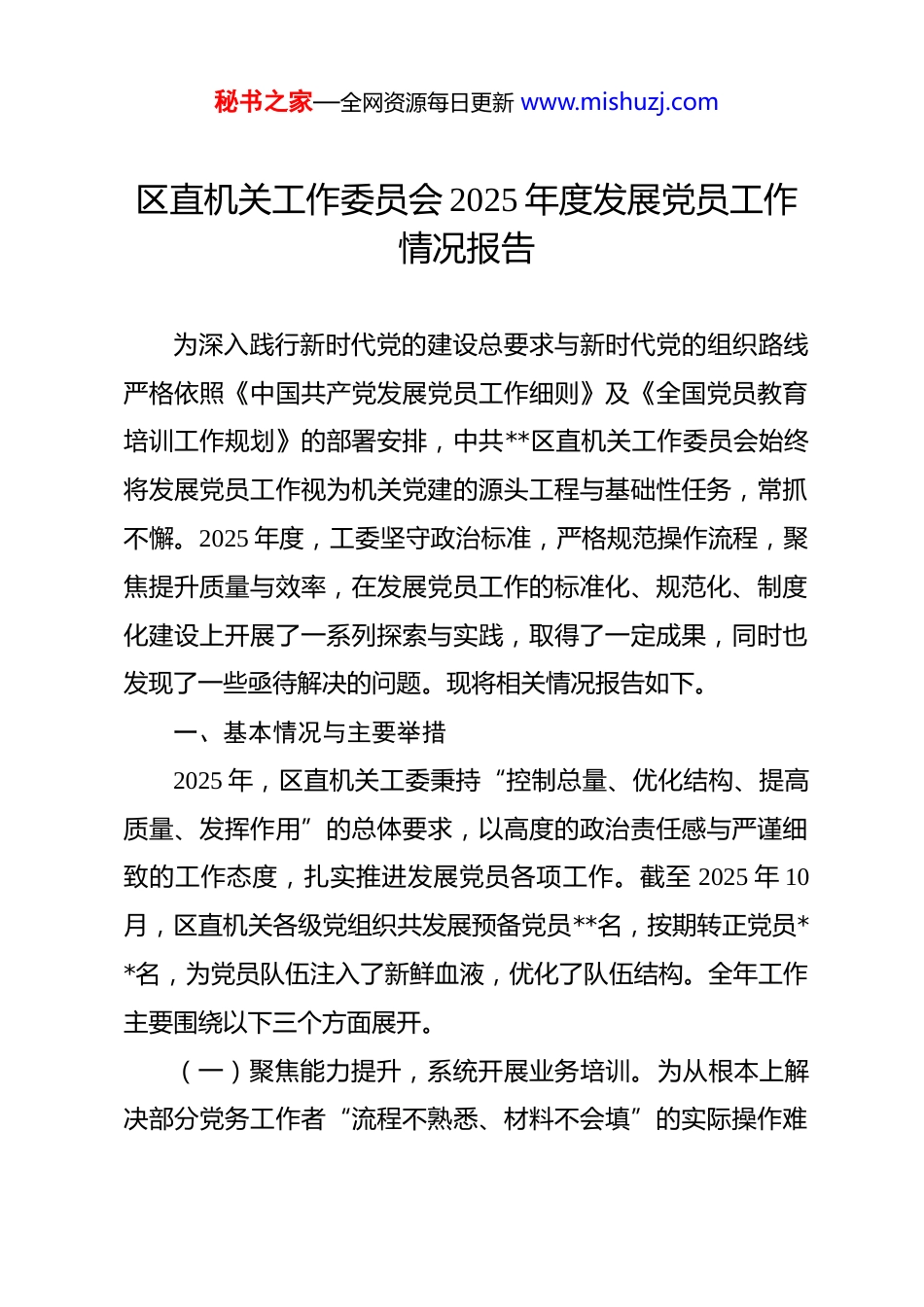 秘书之家—全网资源每日更新 www.mishuzj.com区直机关工作委员会 2025 年度发展党员工作情况报告 为深入践行新时代党的建设总要求与新时代党的组织路线严格依照《中国共产党发展党员工作细则》及《全国党员教育培训工作规划》的部署安排,中共**区直机关工作委员会始终将发展党员工作视为机关党建的源头工程与基础性任务,常抓不懈。2025 年度,工委坚守政治标准,严格规范操作流程,聚焦提升质量与效率,在发展党员工作的标准化、规范化、制度化建设上开展了一系列探索与实践,取得了一定成果,同时也发现了一些亟待解决的问题。现将相关情况报告如下。一、基本情况与主要举措2025 年,区直机关工委秉持“控制总量、优化结构、提高质量、发挥作用”的总体要求,以高度的政治责任感与严谨细致的工作态度,扎实推进发展党员各项工作。截至 2025 年 10月,区直机关各级党组织共发展预备党员**名,按期转正党员**名,为党员队伍注入了新鲜血液,优化了队伍结构。全年工作主要围绕以下三个方面展开。(一)聚焦能力提升,系统开展业务培训。为从根本上解决部分党务工作者“流程不熟悉、材料不会填”的实际操作难秘书之家—全网资源每日更新 www.mishuzj.com题,工委将能力建设摆在首要位置,构建了多层次、全覆盖的培训体系。一是培训主体全员覆盖。针对机关党组织书记、组织委员、党务干事以及入党积极分子、发展对象等不同群体,分别组织专题培训。本年度,工委于 6 月、8 月等关键时间节点,组织了多期发展党员工作专题培训与发展对象集中培训。例如,6 月 16 日举办的党务干部业务培训会,参训人员达 40 余名;面向发展对象的培训班,单期参训人数最多达 221 人。据不完全统计,全年累计培训各类人员超 430 人次,确保发展党员工作链条上的每一位参与者都能明确自身职责与工作标准。二是培训内容标准统一。培训课程紧密围绕发展党员工作的五个阶段与 39 个具体步骤展开,涵盖从递交入党申请书到预备党员转正的全过程。重点讲解政治审查要点、支部大会规范流程、公示环节注意事项以及各类文书材料填写规范等内容。培训方式灵活多样,结合课堂讲授、案例研讨和现场档案“体检”等形式,确保培训内容入脑入心,显著提升了党务工作者的专业素养与实操能力。三是培训考核严格规范。为检验培训成效,所有发展对象培训均设置结业测试环节,内容涵盖党章党规党纪和发展党员工作流程知识。测试成绩作为其能否被确定为预备党员的重要参考,并书面反馈至学员所在党组织。根据预算绩效目标设定,本年度培训人员合格率预期达到 95%以上,从目前抽秘书之家—全网资源每日更新 www.mishuzj.com查情况看,基本达成预期目标,有效巩固了培训成果。(二)聚焦程序严明,全流程精准指导。发展党员工作的政治性与严肃性,决定了必须严格按规定程序执行。工委坚持关口前移、全程监督,着力构建环环相扣、无缝衔接的责任闭环。一是严守政治审查“第一道关口”。工委反复强调,政治标准是发展党员的首要标准。要求各党组织必须对发展对象及其直系亲属和主要社会关系进行严肃、全面、深入的政治审查,坚决杜绝以简单证明材料替代综合政审报告的做法。工委通过培训和日常指导,明确政治审查的“两审两查”标准动作,确保将政治上不过关的人员坚决挡在门外。二是严把支部决议“关键环节”。针对支部大会讨论接收预备党员等关键会议,工委明确要求必须严格遵守程序,如会前充分酝酿、会上逐一讨论、无记名投票表决、决议内容规范完整等。工委组织委员或兼职组织员对部分重点单位的发展党员支部大会进行列席指导,及时纠正程序不规范、讨论不充分等问题,确保决议过程的民主性、严肃性和规范性。三是严抓全程监督“责任链条”。工委建立发展党员预审和备案制度,要求各单位在确定发展对象、接收预备党员等重要节点前,必须将相关材料报工委预审。工委对材料的规范性、程序的合规性进行严格把关,对发现的问题及时提出整改意见。这种“工委全程跟踪指导、基层党组秘书之家—全网资源每日更新 www.mishuzj.com织具体落实”的模式,有效压实了各级党组织的政治责任,避免了“程序空转”...