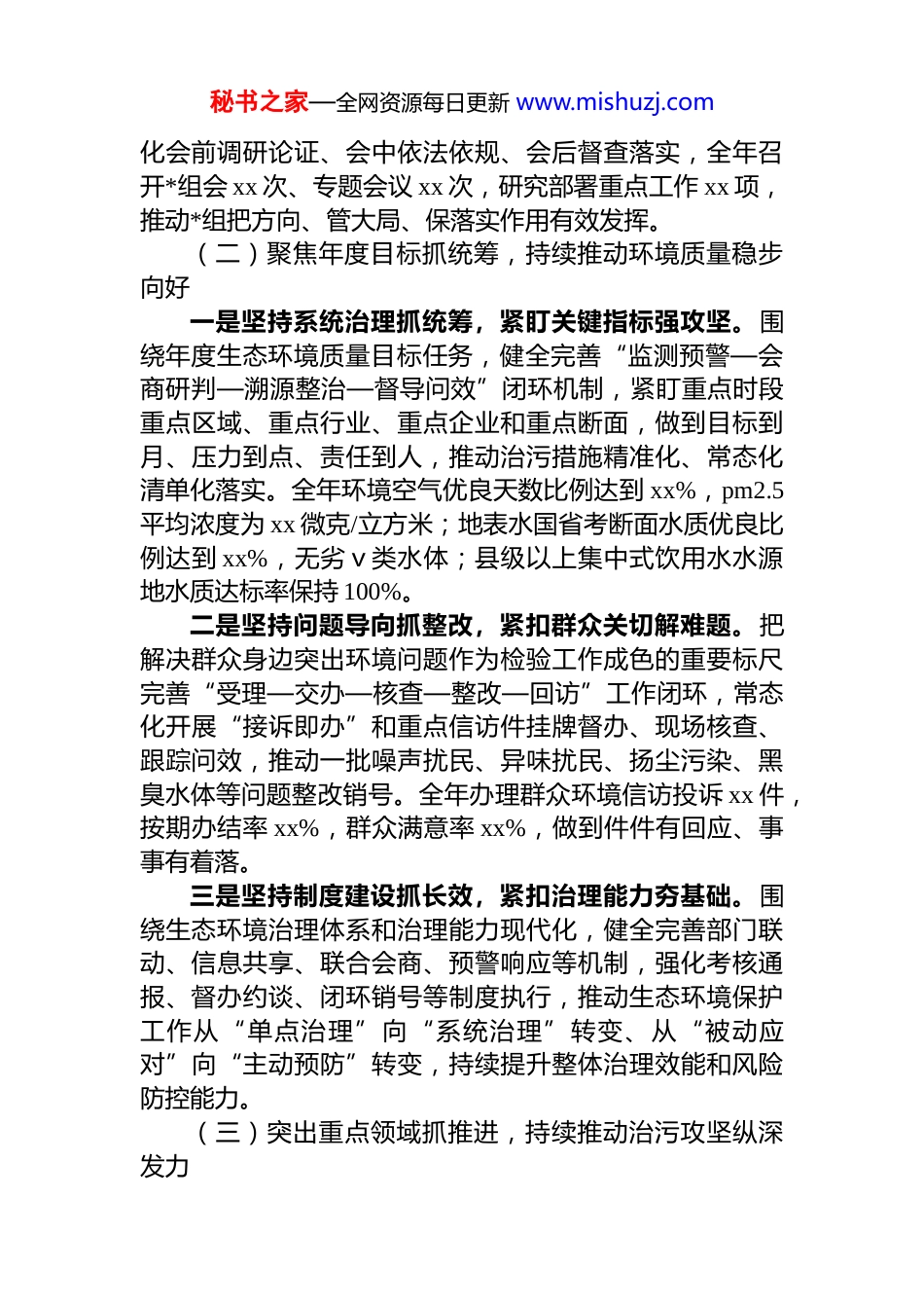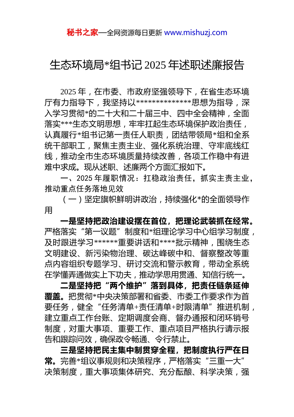 秘书之家—全网资源每日更新 www.mishuzj.com生态环境局*组书记 2025 年述职述廉报告2025 年,在市委、市政府坚强领导下,在省生态环境厅有力指导下,我坚持以**************思想为指导,深入学习贯彻*的二十大和二十届三中、四中全会精神,全面落实***生态文明思想,牢牢扛起生态环境保护政治责任,认真履行*组书记第一责任人职责,团结带领局*组和全系统干部职工,聚焦主责主业、强化系统治理、守牢底线红线,推动全市生态环境质量持续改善,各项工作稳中有进难中求成。现从述职、述廉两个方面汇报如下。一、2025 年履职情况:扛稳政治责任,抓实主责主业,推动重点任务落地见效(一)坚定旗帜鲜明讲政治,持续强化*的全面领导作用一是坚持把政治建设摆在首位,把理论武装抓在经常。严格落实“第一议题”制度和*组理论学习中心组学习制度,及时跟进学习******重要讲话和****批示精神,围绕生态文明建设、新污染物治理、碳达峰碳中和、督察整改等重点内容组织专题学习、研讨交流和警示教育,带动全系统在学懂弄通做实上下功夫,推动学思用贯通、知信行统一。二是坚持把“两个维护”落到具体,把责任链条延伸覆盖。把贯彻*中央决策部署和省委、市委工作要求作为首要任务,健全“任务清单+责任清单+时限清单”推进机制,建立重点工作台账、定期调度会商、督办通报和闭环销号制度,对重大事项、重要工作、重点项目严格执行请示报告和跟踪问效,确保政令畅通、令行禁止。三是坚持把民主集中制贯穿全程,把制度执行严在日常。完善*组议事规则和决策程序,严格落实“三重一大”决策制度,重大事项集体研究、充分酝酿、科学决策,强秘书之家—全网资源每日更新 www.mishuzj.com化会前调研论证、会中依法依规、会后督查落实,全年召开*组会 xx 次、专题会议 xx 次,研究部署重点工作 xx 项,推动*组把方向、管大局、保落实作用有效发挥。(二)聚焦年度目标抓统筹,持续推动环境质量稳步向好一是坚持系统治理抓统筹,紧盯关键指标强攻坚。围绕年度生态环境质量目标任务,健全完善“监测预警—会商研判—溯源整治—督导问效”闭环机制,紧盯重点时段重点区域、重点行业、重点企业和重点断面,做到目标到月、压力到点、责任到人,推动治污措施精准化、常态化清单化落实。全年环境空气优良天数比例达到 xx%,pm2.5平均浓度为 xx 微克/立方米;地表水国省考断面水质优良比例达到 xx%,无劣ⅴ类水体;县级以上集中式饮用水水源地水质达标率保持 100%。二是坚持问题导向抓整改,紧扣群众关切解难题。把解决群众身边突出环境问题作为检验工作成色的重要标尺完善“受理—交办—核查—整改—回访”工作闭环,常态化开展“接诉即办”和重点信访件挂牌督办、现场核查、跟踪问效,推动一批噪声扰民、异味扰民、扬尘污染、黑臭水体等问题整改销号。全年办理群众环境信访投诉 xx 件,按期办结率 xx%,群众满意率 xx%,做到件件有回应、事事有着落。三是坚持制度建设抓长效,紧扣治理能力夯基础。围绕生态环境治理体系和治理能力现代化,健全完善部门联动、信息共享、联合会商、预警响应等机制,强化考核通报、督办约谈、闭环销号等制度执行,推动生态环境保护工作从“单点治理”向“系统治理”转变、从“被动应对”向“主动预防”转变,持续提升整体治理效能和风险防控能力。(三)突出重点领域抓推进,持续推动治污攻坚纵深发力秘书之家—全网资源每日更新 www.mishuzj.com一是守好碧水底线,提升水生态环境治理水平。持续推进水污染防治行动,统筹水资源、水环境、水生态治理压实属地责任和行业监管责任。推进入河排污口排查整治和规范化建设,2025 年完成入河排污口分类整治 xx 个;推动城镇污水处理厂提质增效及配套管网建设,完成改造提升项目 xx 个;强化饮用水水源地风险排查和规范化管理,完成风险隐患整改 xx 项。二是守住净土安全,强化土壤与固废污染防控。严格建设用地准入管理,完善污染地块再开发利用联动监管机制,确保“净土收储、净土供应”;推进重点行业企业用地调查和风险管控修复,完成土壤污染状况调查评估 xx 个地块,实施风险管控或修复工程 xx...