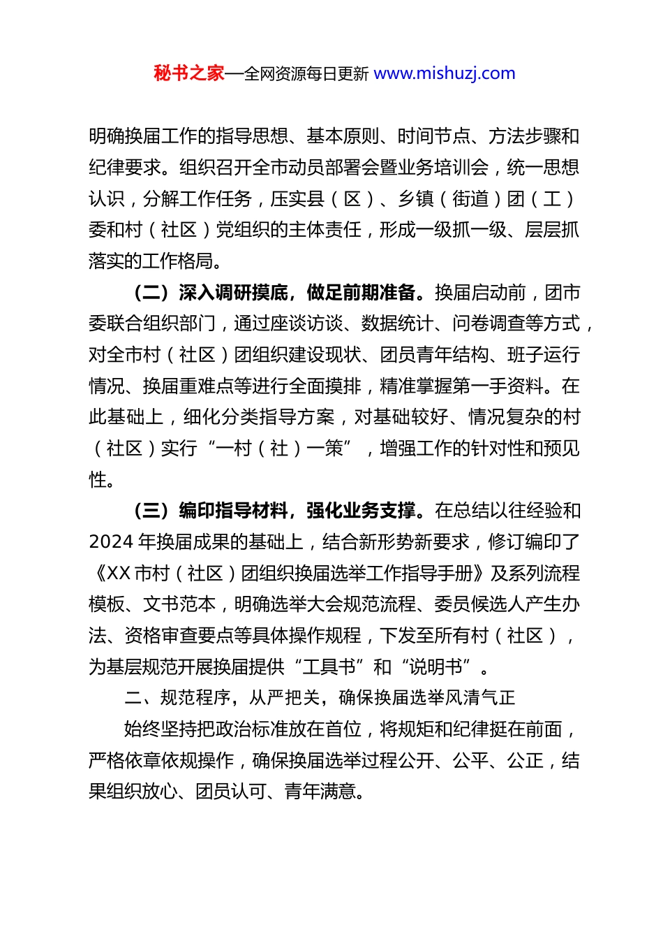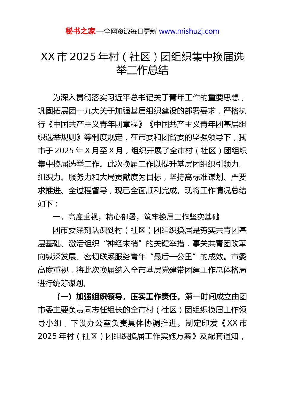 秘书之家—全网资源每日更新 www.mishuzj.comXX 市 2025 年村(社区)团组织集中换届选举工作总结为深入贯彻落实习近平总书记关于青年工作的重要思想,巩固拓展团十九大关于加强基层组织建设的部署要求,严格执行《中国共产主义青年团章程》《中国共产主义青年团基层组织选举规则》等制度规定,在市委和团省委的坚强领导下,我市于 2025 年 X 月至 X 月,组织开展了全市村(社区)团组织集中换届选举工作。此次换届工作以提升基层团组织引领力、组织力、服务力和大局贡献度为目标,坚持高标准谋划、严要求推进、全过程督导,现已全面顺利完成。现将工作情况总结如下:一、高度重视,精心部署,筑牢换届工作坚实基础团市委深刻认识到村(社区)团组织换届是夯实共青团基层基础、激活组织“神经末梢”的关键举措,事关共青团改革向纵深发展、密切联系服务青年“最后一公里”的成效。市委高度重视,将此次换届纳入全市基层党建带团建工作总体格局进行统筹谋划。(一)加强组织领导,压实工作责任。第一时间成立由团市委主要负责同志任组长的全市村(社区)团组织换届工作领导小组,下设办公室负责具体协调推进。制定印发《 XX 市2025 年村(社区)团组织换届工作实施方案》及配套通知,秘书之家—全网资源每日更新 www.mishuzj.com明确换届工作的指导思想、基本原则、时间节点、方法步骤和纪律要求。组织召开全市动员部署会暨业务培训会,统一思想认识,分解工作任务,压实县(区)、乡镇(街道)团(工)委和村(社区)党组织的主体责任,形成一级抓一级、层层抓落实的工作格局。(二)深入调研摸底,做足前期准备。换届启动前,团市委联合组织部门,通过座谈访谈、数据统计、问卷调查等方式,对全市村(社区)团组织建设现状、团员青年结构、班子运行情况、换届重难点等进行全面摸排,精准掌握第一手资料。在此基础上,细化分类指导方案,对基础较好、情况复杂的村(社区)实行“一村(社)一策”,增强工作的针对性和预见性。(三)编印指导材料,强化业务支撑。在总结以往经验和2024 年换届成果的基础上,结合新形势新要求,修订编印了《XX 市村(社区)团组织换届选举工作指导手册》及系列流程模板、文书范本,明确选举大会规范流程、委员候选人产生办法、资格审查要点等具体操作规程,下发至所有村(社区),为基层规范开展换届提供“工具书”和“说明书”。二、规范程序,从严把关,确保换届选举风清气正始终坚持把政治标准放在首位,将规矩和纪律挺在前面,严格依章依规操作,确保换届选举过程公开、公平、公正,结果组织放心、团员认可、青年满意。秘书之家—全网资源每日更新 www.mishuzj.com(一)严把“入口关”,优化班子结构。突出政治标准和道德品行,严格候选人资格条件审查。联合纪检、公安、信访等部门,对初步人选进行联审,坚决防止“带病参选”。注重从优秀青年党员、返乡创业青年、高校毕业生、退役军人、乡村好青年、社会组织骨干等群体中选拔人才,着力优化班子年龄、学历、来源结构。本次换届后,新一届村(社区)团组织班子呈现出“一升一降一优化”的特点:一是整体素质显著提升。全市共选举产生新一届村(社区)团组织委员 XX 名,其中书记 XX 名。团组织书记中,中共党员(含预备党员)占比XX%,较上届提升 X 个百分点;兼任村(社区)“两委”委员的 XX 人,占比 XX%(参考 2024 年数据并略有提升),进一步强化了党建带团建机制。二是年龄结构更加年轻。团组织书记平均年龄 XX 岁,35 岁以下的 XX 人,占比 XX%(较 2024年提升);团组织委员中 35 岁以下的占比 XX%(较 2024 年提升),年轻化趋势明显,队伍活力进一步增强。三是学历层次持续优化。团组织书记具有大专及以上学历的 XX 人,占比XX%(较 2024 年提升);团组织委员大专及以上学历占比XX%(较 2024 年提升),知识化、专业化水平不断提高。(二)严把“程序关”,规范选举流程。督导各基层单位严格按照《选举规则》和实施方案要求,不折不扣履行请示报告、民主推荐、组织考察、公示公告、大会选举、结果报批等程序。重点加强对团员身份认...