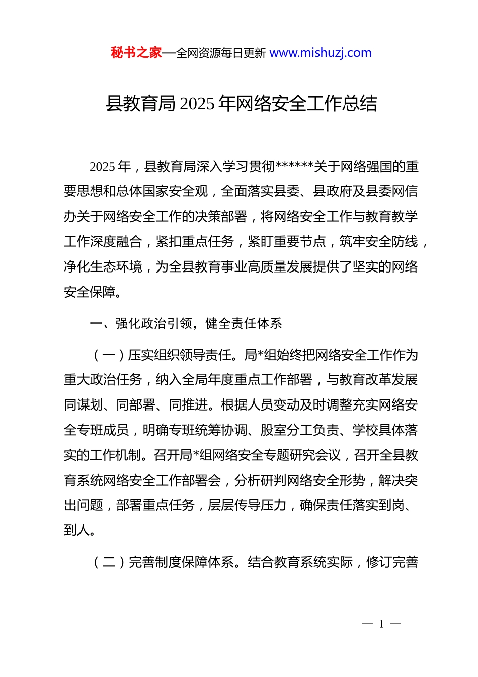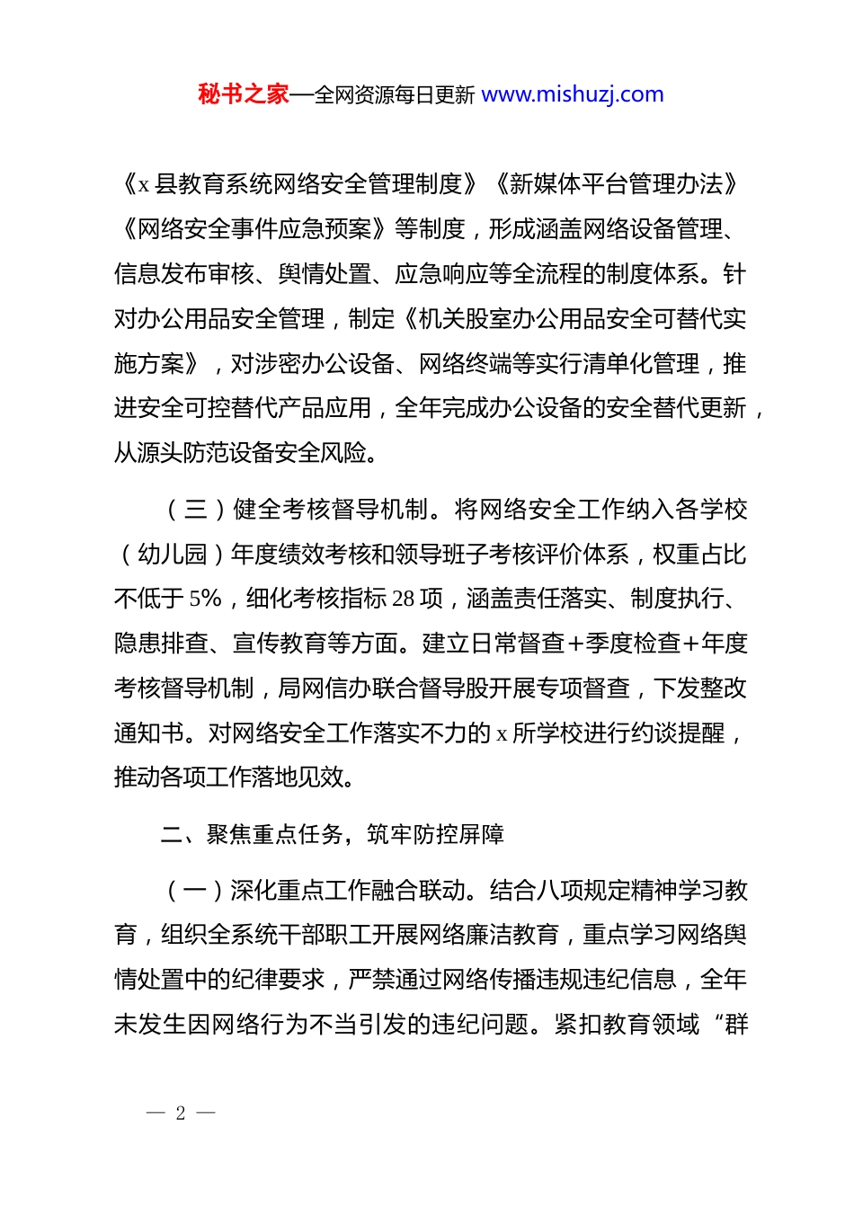 秘书之家—全网资源每日更新 www.mishuzj.com县教育局 2025 年网络安全工作总结2025 年,县教育局深入学习贯彻******关于网络强国的重要思想和总体国家安全观,全面落实县委、县政府及县委网信办关于网络安全工作的决策部署,将网络安全工作与教育教学工作深度融合,紧扣重点任务,紧盯重要节点,筑牢安全防线,净化生态环境,为全县教育事业高质量发展提供了坚实的网络安全保障。一、强化政治引领,健全责任体系(一)压实组织领导责任。局*组始终把网络安全工作作为重大政治任务,纳入全局年度重点工作部署,与教育改革发展同谋划、同部署、同推进。根据人员变动及时调整充实网络安全专班成员,明确专班统筹协调、股室分工负责、学校具体落实的工作机制。召开局*组网络安全专题研究会议,召开全县教育系统网络安全工作部署会,分析研判网络安全形势,解决突出问题,部署重点任务,层层传导压力,确保责任落实到岗、到人。(二)完善制度保障体系。结合教育系统实际,修订完善— 1 —秘书之家—全网资源每日更新 www.mishuzj.com《x 县教育系统网络安全管理制度》《新媒体平台管理办法》《网络安全事件应急预案》等制度,形成涵盖网络设备管理、信息发布审核、舆情处置、应急响应等全流程的制度体系。针对办公用品安全管理,制定《机关股室办公用品安全可替代实施方案》,对涉密办公设备、网络终端等实行清单化管理,推进安全可控替代产品应用,全年完成办公设备的安全替代更新,从源头防范设备安全风险。(三)健全考核督导机制。将网络安全工作纳入各学校(幼儿园)年度绩效考核和领导班子考核评价体系,权重占比不低于 5%,细化考核指标 28 项,涵盖责任落实、制度执行、隐患排查、宣传教育等方面。建立日常督查+季度检查+年度考核督导机制,局网信办联合督导股开展专项督查,下发整改通知书。对网络安全工作落实不力的 x 所学校进行约谈提醒,推动各项工作落地见效。二、聚焦重点任务,筑牢防控屏障(一)深化重点工作融合联动。结合八项规定精神学习教育,组织全系统干部职工开展网络廉洁教育,重点学习网络舆情处置中的纪律要求,严禁通过网络传播违规违纪信息,全年未发生因网络行为不当引发的违纪问题。紧扣教育领域“群— 2 —秘书之家—全网资源每日更新 www.mishuzj.com腐”集中整治工作,建立网络举报平台管理制度,规范 12345政务服务热线、网络留言等举报渠道的线索处置流程,对涉及教育乱收费、违规招生、师德失范等问题的网络举报,实行 24小时签收、3 个工作日核查、7 个工作日反馈,查处典型案例并及时公开通报,形成有力震慑。围绕规范办学行为,加强对学校招生录取、作业布置、课后服务等工作的网络舆情监测,提前制定风险防控预案,及时回应社会关切,全年未发生因办学行为不规范引发的重大网络舆情。(二)强化重要节点安全管控。针对 9 月份秋季开学,提前开展校园网络设施排查检修,完成学校校园网升级改造,保障新生注册、学籍录入等工作顺利推进;通过公众号、家长群推送开学季网络安全提示,防范开学季网络诈骗、个人信息泄露等风险。围绕国庆假期,制定专项网络安全保障方案,实行双人双岗 24 小时应急值守,对教育系统关键信息基础设施开展漏洞扫描,封堵安全漏洞;加强对爱国主义教育活动的网络宣传引导,发布正能量内容,营造浓厚节日氛围。聚焦二十届四中全会召开等重要政治节点,成立舆情专项工作组,建立监测-研判-处置-反馈闭环机制,重点监测涉及教育政策调整、民生保障等方面的网络舆情,累计监测信息,处置苗头性倾向性问— 3 —秘书之家—全网资源每日更新 www.mishuzj.com题,确保网络舆情平稳可控。(三)加强网络软硬件安全排查。积极配合县委网信办开展网络安全专项检查和“净网护网”系列行动,全年联合开展拉网式排查 x 次,重点检查学校网站、教育管理平台、校园监控系统等关键信息基础设施。对全系统网络设备进行安全检测,发现并整改弱口令、未及时更新补丁等问题;升级部署防火墙、入侵检测系统等安全设备,实现校园网络安全防护全覆盖。建立网络安全隐患台账,实现发现-登记-整改-销号闭环,消除...