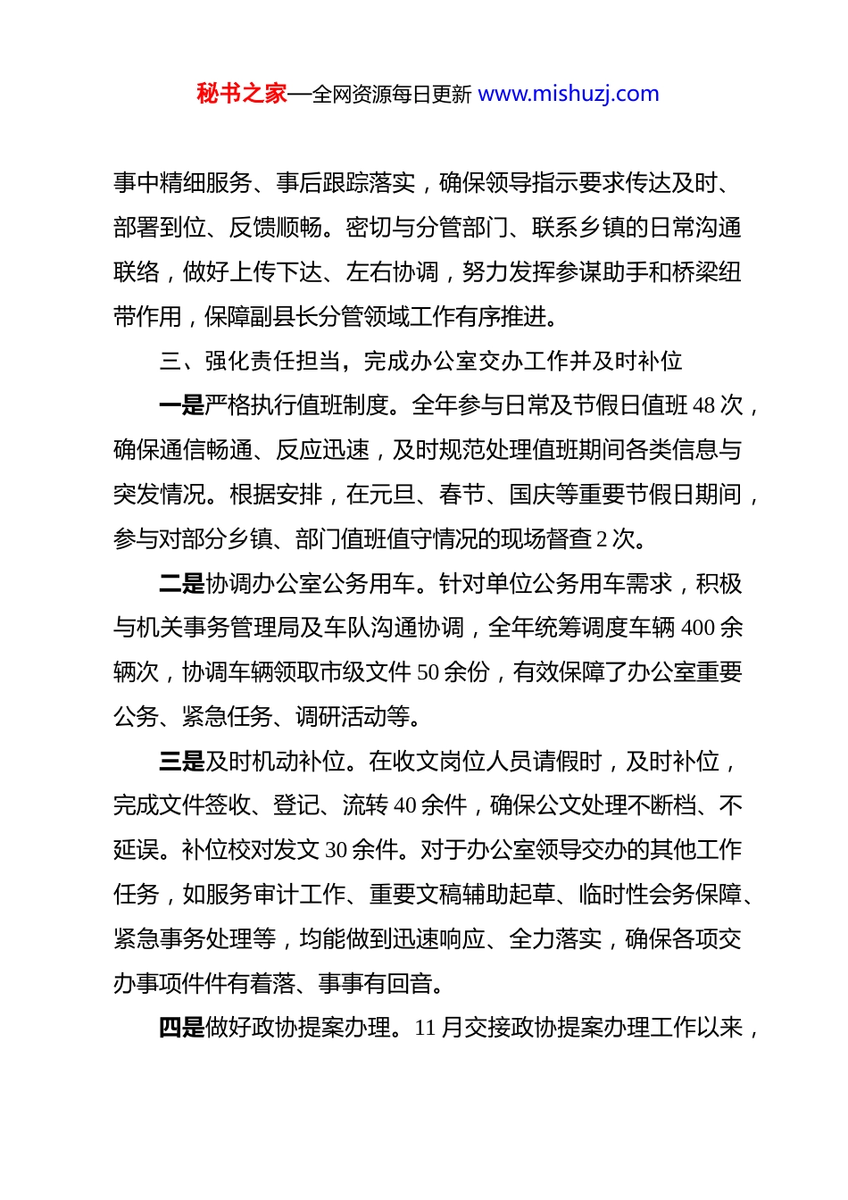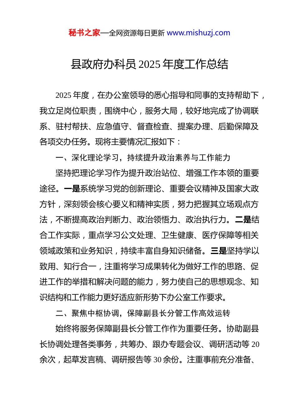 秘书之家—全网资源每日更新 www.mishuzj.com县政府办科员 2025 年度工作总结 2025 年度,在办公室领导的悉心指导和同事的支持帮助下,我立足岗位职责,围绕中心,服务大局,较好地完成了协调联系、驻村帮扶、应急值守、督查检查、提案办理、后勤保障及各项交办任务。现将主要情况汇报如下:一、深化理论学习,持续提升政治素养与工作能力坚持把理论学习作为提升政治站位、增强工作本领的重要途径。一是系统学习党的创新理论、重要会议精神及国家大政方针,深刻领会核心要义和精神实质,努力把握其立场观点方法,不断提高政治判断力、政治领悟力、政治执行力。二是结合工作实际,重点学习公文处理、卫生健康、医疗保障等相关领域政策和业务知识,持续丰富自身知识储备。三是坚持学以致用、知行合一,注重将学习成果转化为做好工作的思路、促进工作的举措和解决问题的能力,努力使自己的思想观念、知识结构和工作能力更好适应新形势下办公室工作要求。二、聚焦中枢协调,保障副县长分管工作高效运转始终将服务保障副县长分管工作作为重要任务。协助副县长协调处理各类事务,共筹办、跟办专题会议、调研活动等 20余次,起草发言稿、调研报告等 30 余份。注重事前充分准备、秘书之家—全网资源每日更新 www.mishuzj.com事中精细服务、事后跟踪落实,确保领导指示要求传达及时、部署到位、反馈顺畅。密切与分管部门、联系乡镇的日常沟通联络,做好上传下达、左右协调,努力发挥参谋助手和桥梁纽带作用,保障副县长分管领域工作有序推进。三、强化责任担当,完成办公室交办工作并及时补位一是严格执行值班制度。全年参与日常及节假日值班 48 次,确保通信畅通、反应迅速,及时规范处理值班期间各类信息与突发情况。根据安排,在元旦、春节、国庆等重要节假日期间,参与对部分乡镇、部门值班值守情况的现场督查 2 次。二是协调办公室公务用车。针对单位公务用车需求,积极与机关事务管理局及车队沟通协调,全年统筹调度车辆 400 余辆次,协调车辆领取市级文件 50 余份,有效保障了办公室重要公务、紧急任务、调研活动等。三是及时机动补位。在收文岗位人员请假时,及时补位,完成文件签收、登记、流转 40 余件,确保公文处理不断档、不延误。补位校对发文 30 余件。对于办公室领导交办的其他工作任务,如服务审计工作、重要文稿辅助起草、临时性会务保障、紧急事务处理等,均能做到迅速响应、全力落实,确保各项交办事项件件有着落、事事有回音。四是做好政协提案办理。11 月交接政协提案办理工作以来,秘书之家—全网资源每日更新 www.mishuzj.com及时与县政协及县政府承办部门对接联系,起草撰写县政府提案办理工作情况通报,审核承接县政协十届五次会议的委员提案。四、聚力乡村振兴,扎实推进驻村帮扶工作按照办公室领导安排,积极投身驻村工作。深入田间地头与村民家中,收集社情民意,帮助解决困难问题。协助村“两委”落实各项惠民政策,参与谋划乡村产业发展、人居环境整治、基层治理等具体事务项。通过驻村实践,进一步加深了对基层情况的了解,提升了做群众工作和解决实际问题的能力。五、存在不足及下一步工作计划回顾一年工作,虽取得一定进步,但也清醒认识到自身存在不足和差距:一是面对多重角色转换和繁杂任务时,统筹兼顾和超前谋划能力有待进一步提升;二是深入系统学习理论政策和业务知识不够,参谋服务的深度和精度需加强;三是驻村工作中,参与乡村治理的积极性、主动性不够,自觉为民服务的宗旨意识还需强化。新的一年,我将继续在办公室领导的带领下,进一步加强学习,提升综合素养;进一步优化工作方法,提高统筹协调与执行效率;进一步聚焦重点,在服务领导决策、深化驻村帮扶、做好日常保障等方面持续用力;进一步改进作风,恪尽职守,秘书之家—全网资源每日更新 www.mishuzj.com扎实工作,努力将自己打造成为办文办会办事的“多面手”,更加出色完成各项工作任务。