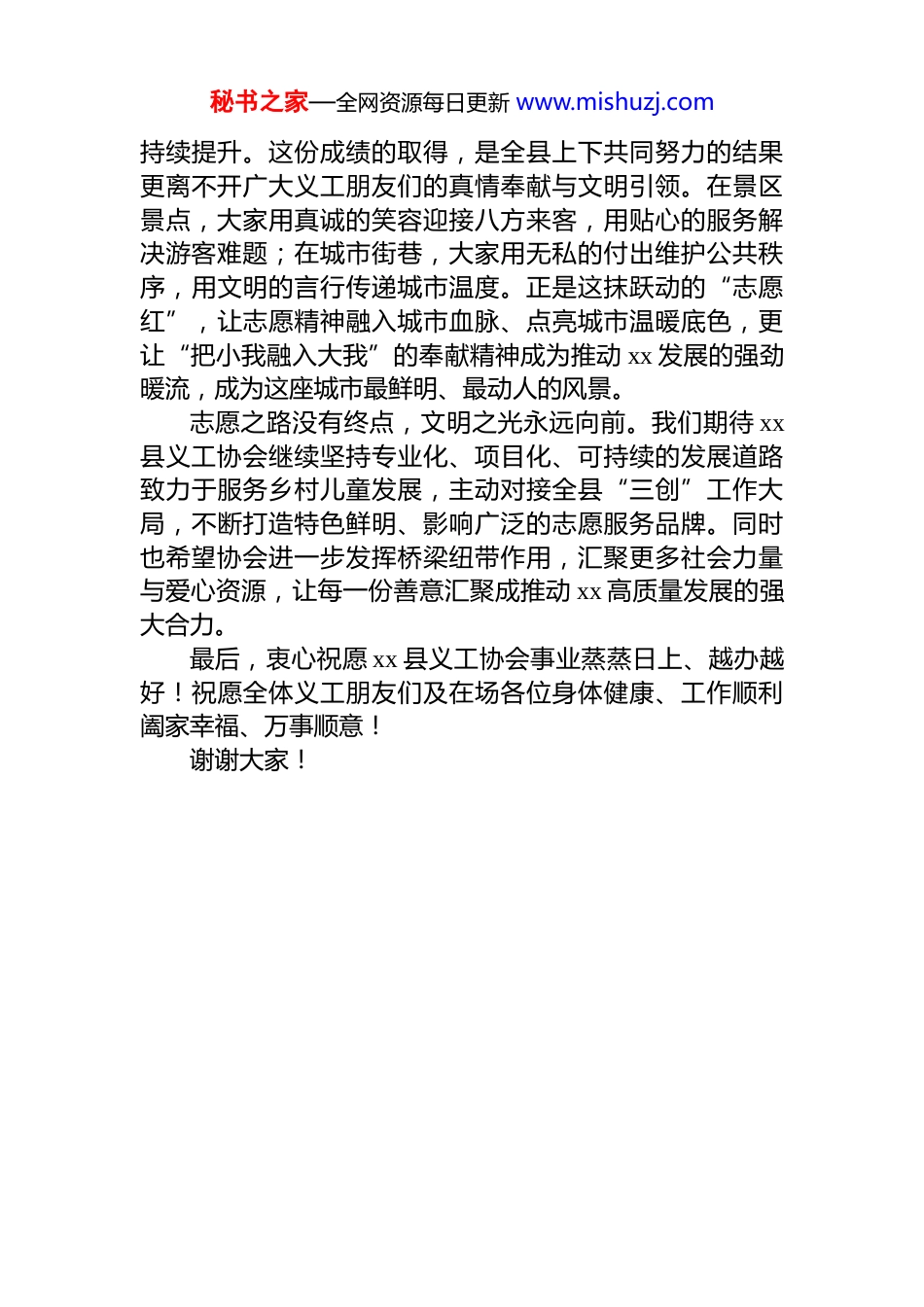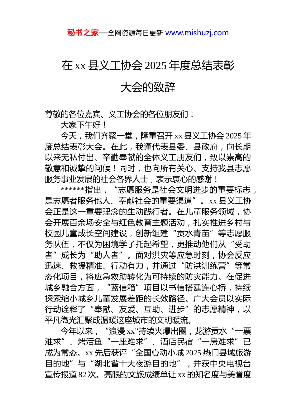 秘书之家—全网资源每日更新 www.mishuzj.com在 xx 县义工协会 2025 年度总结表彰大会的致辞尊敬的各位嘉宾、义工协会的各位朋友们:大家下午好!今天,我们齐聚一堂,隆重召开 xx 县义工协会 2025 年度总结表彰大会。在此,我谨代表县委、县政府,向长期以来无私付出、辛勤奉献的全体义工朋友们,致以崇高的敬意和诚挚的问候!同时,也向所有关心、支持我县志愿服务事业发展的社会各界人士,表示衷心的感谢!******指出,“志愿服务是社会文明进步的重要标志,是志愿者服务他人、奉献社会的重要渠道”。xx 县义工协会正是这一重要理念的生动践行者。在儿童服务领域,协会开展百余场安全与红色教育主题活动,扎实推进乡村与校园儿童成长空间建设,创新组建“贡水青苗”等志愿服务队伍,不仅为困境学子托起希望,更推动他们从“受助者”成长为“助人者”。面对洪灾等应急时刻,协会反应迅速、救援精准、行动有力,并通过“防洪训练营”等常态化项目,将应急救助转化为可持续的防灾能力。在促进城乡融合方面,“蓝信箱”项目以书信搭建连心桥,持续探索缩小城乡儿童发展差距的长效路径。广大会员以实际行动诠释了“奉献、友爱、互助、进步”的志愿精神,以平凡微光汇聚成温暖这座城市的文明暖流。今年以来,“浪漫 xx”持续火爆出圈,龙游贡水“一票难求”、烤活鱼“一座难求”、酒店民宿“一房难求”已成为常态。xx 先后获评“全国心动小城 2025 热门县域旅游目的地”与“湖北省十大夜游目的地”,并获中央电视台宣传报道 82 次。亮眼的文旅成绩单让 xx 的知名度与美誉度秘书之家—全网资源每日更新 www.mishuzj.com持续提升。这份成绩的取得,是全县上下共同努力的结果更离不开广大义工朋友们的真情奉献与文明引领。在景区景点,大家用真诚的笑容迎接八方来客,用贴心的服务解决游客难题;在城市街巷,大家用无私的付出维护公共秩序,用文明的言行传递城市温度。正是这抹跃动的“志愿红”,让志愿精神融入城市血脉、点亮城市温暖底色,更让“把小我融入大我”的奉献精神成为推动 xx 发展的强劲暖流,成为这座城市最鲜明、最动人的风景。志愿之路没有终点,文明之光永远向前。我们期待 xx县义工协会继续坚持专业化、项目化、可持续的发展道路致力于服务乡村儿童发展,主动对接全县“三创”工作大局,不断打造特色鲜明、影响广泛的志愿服务品牌。同时也希望协会进一步发挥桥梁纽带作用,汇聚更多社会力量与爱心资源,让每一份善意汇聚成推动 xx 高质量发展的强大合力。最后,衷心祝愿 xx 县义工协会事业蒸蒸日上、越办越好!祝愿全体义工朋友们及在场各位身体健康、工作顺利阖家幸福、万事顺意!谢谢大家!