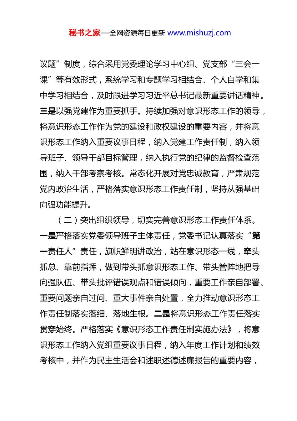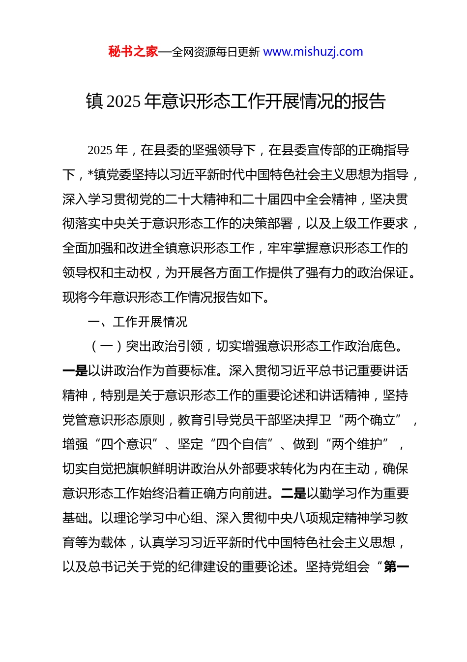 秘书之家—全网资源每日更新 www.mishuzj.com镇 2025 年意识形态工作开展情况的报告 2025 年,在县委的坚强领导下,在县委宣传部的正确指导下,*镇党委坚持以习近平新时代中国特色社会主义思想为指导,深入学习贯彻党的二十大精神和二十届四中全会精神,坚决贯彻落实中央关于意识形态工作的决策部署,以及上级工作要求,全面加强和改进全镇意识形态工作,牢牢掌握意识形态工作的领导权和主动权,为开展各方面工作提供了强有力的政治保证。现将今年意识形态工作情况报告如下。一、工作开展情况(一)突出政治引领,切实增强意识形态工作政治底色。一是以讲政治作为首要标准。深入贯彻习近平总书记重要讲话精神,特别是关于意识形态工作的重要论述和讲话精神,坚持党管意识形态原则,教育引导党员干部坚决捍卫“两个确立”,增强“四个意识”、坚定“四个自信”、做到“两个维护”,切实自觉把旗帜鲜明讲政治从外部要求转化为内在主动,确保意识形态工作始终沿着正确方向前进。二是以勤学习作为重要基础。以理论学习中心组、深入贯彻中央八项规定精神学习教育等为载体,认真学习习近平新时代中国特色社会主义思想,以及总书记关于党的纪律建设的重要论述。坚持党组会“第一秘书之家—全网资源每日更新 www.mishuzj.com议题”制度,综合采用党委理论学习中心组、党支部“三会一课”等有效形式,系统学习和专题学习相结合、个人自学和集中学习相结合,及时跟进学习习近平总书记最新重要讲话精神。三是以强党建作为重要抓手。持续加强对意识形态工作的领导,将意识形态工作作为党的建设和政权建设的重要内容,并将意识形态工作纳入重要议事日程,纳入党建工作责任制,纳入领导班子、领导干部目标管理,纳入执行党的纪律的监督检查范围,纳入干部考察考核。常态化开展对党忠诚教育,严肃规范党内政治生活,严格落实意识形态工作责任制,坚持从强基础向强功能提升。(二)突出组织领导,切实完善意识形态工作责任体系。一是严格落实党委领导班子主体责任,党委书记认真落实“第一责任人”责任,旗帜鲜明讲政治,站在意识形态一线,牵头抓总、靠前指挥,做到带头抓意识形态工作、带头管阵地把导向强队伍、带头批评错误观点和错误倾向,重要工作亲自部署、重要问题亲自过问、重大事件亲自处置,全力推动意识形态工作责任制落实落细、落地生根。二是将意识形态工作责任落实贯穿始终。严格落实《意识形态工作责任制实施办法》,将意识形态工作纳入党组重要议事日程,纳入年度工作计划和绩效考核中,并作为民主生活会和述职述德述廉报告的重要内容,秘书之家—全网资源每日更新 www.mishuzj.com与工作同部署、同落实、同考核。三是严格落实审查制度绷紧安全之弦。严格执行信息发布审批程序,宣传工作由分管领导审批把关。始终坚持正确的政治方向,确保每一篇稿件经过分管领导审批,规范美篇、微信公众号等新媒体阵地信息发布审批程序。(四)突出管理实效,切实固牢意识形态工作阵地基础。一是积极稳固宣传阵地。抓好舆论宣传工作,不断提升正向舆论的传播力、引导力、影响力和公信力。积极在微信、抖音等宣传阵地做好正面宣传和引导,着力守好网络新媒体阵地。二是强化网络舆情管控。强化日常管理,全面落实工作机制,加强对抖音、微信等意识形态网络阵地的舆情监管,制定实时舆情监测制度,牢牢把握意识形态话语权,确保意识形态领域绝对安全。三是做实做细宣传工作。认真贯彻落实意识形态工作责任制,将宣传工作落实到日常工作,推动宣传工作落地落实。注重用好相关活动宣传宣讲,把宣传活动融入群众生活。(五)突出载体运用,切实强化学习效果,践行社会主义核心价值观。一是运用好各类学习平台。认真落实中心组学习《规则》和《实施办法》,制定 2025 年全年学习计划,将习近平新时代中国特色社会主义思想作为学习的重中之重,认真贯彻落实中央八项规定及其实施细则精神。今年,共完成集中学秘书之家—全网资源每日更新 www.mishuzj.com习 17 次,交流研讨 6 次。用好网络学习平台,实现在职人员全覆盖,及时更新各支部党员学习人员,切实发挥平台作用。二是积极践行社会主...