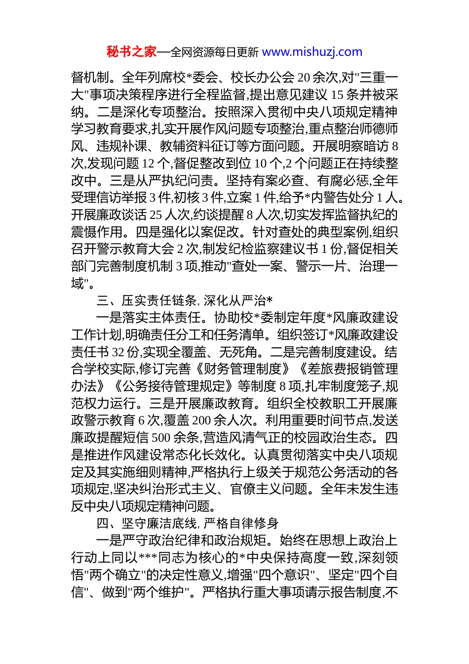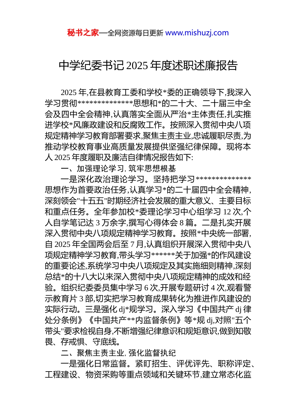 秘书之家—全网资源每日更新 www.mishuzj.com中学纪委书记 2025 年度述职述廉报告2025 年,在县教育工委和学校*委的正确领导下,我深入学习贯彻**************思想和*的二十大、二十届三中全会及四中全会精神,认真落实全面从严治*主体责任,扎实推进学校*风廉政建设和反腐败工作。按照深入贯彻中央八项规定精神学习教育部署要求,聚焦主责主业,忠诚履职尽责,为推动学校教育事业高质量发展提供坚强纪律保障。现将本人 2025 年度履职及廉洁自律情况报告如下:一、加强理论学习,筑牢思想根基一是深化政治理论学习。坚持把学习**************思想作为首要政治任务,认真学习*的二十届四中全会精神,深刻领会"十五五"时期经济社会发展的重大意义、主要目标和重点任务。全年参加校*委理论学习中心组学习 12 次,个人自学笔记达 3 万余字,撰写心得体会 8 篇。二是扎实开展深入贯彻中央八项规定精神学习教育。按照*中央统一部署,自 2025 年全国两会后至 7 月,认真组织开展深入贯彻中央八项规定精神学习教育,带头学习******关于加强*的作风建设的重要论述,系统学习中央八项规定及其实施细则精神,深刻总结*的十八大以来深入贯彻中央八项规定精神的成效和经验。组织纪委委员集中学习 6 次,开展专题研讨 4 次,观看警示教育片 3 部,切实把学习教育成果转化为推进作风建设的实际行动。三是强化 dj*规学习。深入学习《中国共产 dj 律处分条例》《中国共产**内监督条例》等*规 dj,对照"五个带头"要求检视自身,不断增强纪律意识和规矩意识,做到知敬畏、存戒惧、守底线。二、聚焦主责主业,强化监督执纪一是强化日常监督。紧盯招生、评优评先、职称评定、工程建设、物资采购等重点领域和关键环节,建立常态化监秘书之家—全网资源每日更新 www.mishuzj.com督机制。全年列席校*委会、校长办公会 20 余次,对"三重一大"事项决策程序进行全程监督,提出意见建议 15 条并被采纳。二是深化专项整治。按照深入贯彻中央八项规定精神学习教育要求,扎实开展作风问题专项整治,重点整治师德师风、违规补课、教辅资料征订等方面问题。开展明察暗访 8次,发现问题 12 个,督促整改到位 10 个,2 个问题正在持续整改中。三是从严执纪问责。坚持有案必查、有腐必惩,全年受理信访举报 3 件,初核 3 件,立案 1 件,给予*内警告处分 1 人。开展廉政谈话 25 人次,约谈提醒 8 人次,切实发挥监督执纪的震慑作用。四是强化以案促改。针对查处的典型案例,组织召开警示教育大会 2 次,制发纪检监察建议书 1 份,督促相关部门完善制度机制 3 项,推动"查处一案、警示一片、治理一域"。三、压实责任链条,深化从严治*一是落实主体责任。协助校*委制定年度*风廉政建设工作计划,明确责任分工和任务清单。组织签订*风廉政建设责任书 32 份,实现全覆盖、无死角。二是完善制度建设。结合学校实际,修订完善《财务管理制度》《差旅费报销管理办法》《公务接待管理规定》等制度 8 项,扎牢制度笼子,规范权力运行。三是开展廉政教育。组织全校教职工开展廉政警示教育 6 次,覆盖 200 余人次。利用重要时间节点,发送廉政提醒短信 500 余条,营造风清气正的校园政治生态。四是推进作风建设常态化长效化。认真贯彻落实中央八项规定及其实施细则精神,严格执行上级关于规范公务活动的各项规定,坚决纠治形式主义、官僚主义问题。全年未发生违反中央八项规定精神问题。四、坚守廉洁底线,严格自律修身一是严守政治纪律和政治规矩。始终在思想上政治上行动上同以***同志为核心的*中央保持高度一致,深刻领悟"两个确立"的决定性意义,增强"四个意识"、坚定"四个自信"、做到"两个维护"。严格执行重大事项请示报告制度,不秘书之家—全网资源每日更新 www.mishuzj.com折不扣贯彻落实上级决策部署。二是严格执行廉洁自律规定。认真落实中央八项规定及其实施细则精神,不接受可能影响公正执行公务的宴请、礼品和安排,不利用职务之便为亲属和身边人谋取私利。按规定如实报告个人有关事项,自觉接受组织监督。三是坚持艰苦朴素、勤俭节约。严格遵守公务用车、差旅费报销等规定,带头厉行节约、反对浪费,以自身的廉洁...
