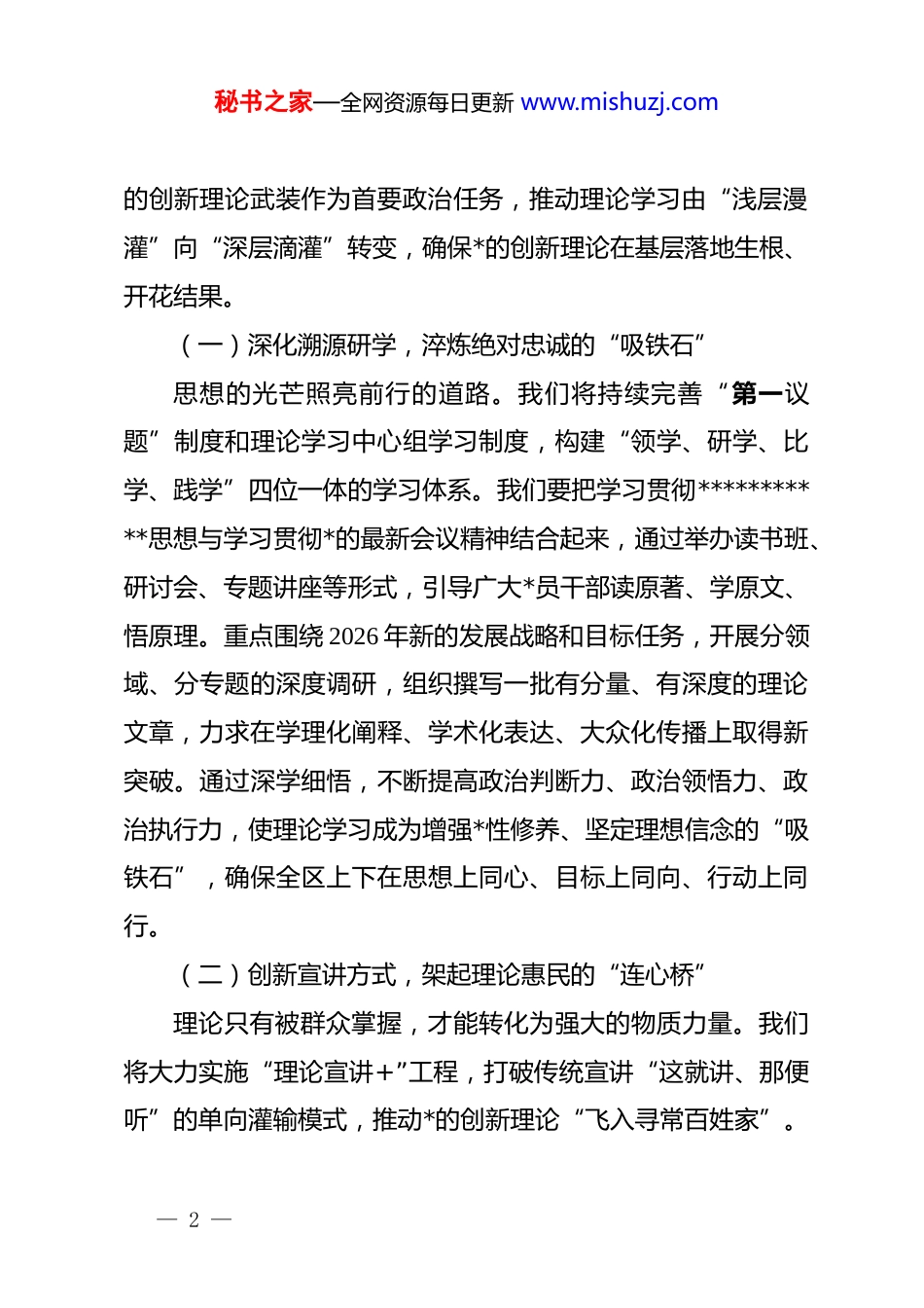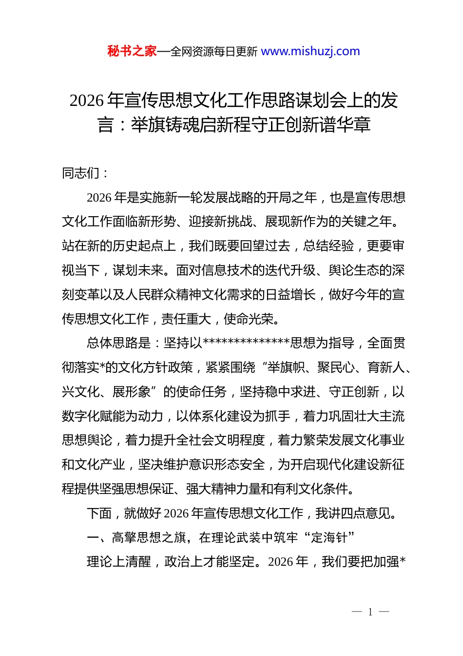秘书之家—全网资源每日更新 www.mishuzj.com2026 年宣传思想文化工作思路谋划会上的发言:举旗铸魂启新程守正创新谱华章同志们:2026 年是实施新一轮发展战略的开局之年,也是宣传思想文化工作面临新形势、迎接新挑战、展现新作为的关键之年。站在新的历史起点上,我们既要回望过去,总结经验,更要审视当下,谋划未来。面对信息技术的迭代升级、舆论生态的深刻变革以及人民群众精神文化需求的日益增长,做好今年的宣传思想文化工作,责任重大,使命光荣。总体思路是:坚持以**************思想为指导,全面贯彻落实*的文化方针政策,紧紧围绕“举旗帜、聚民心、育新人、兴文化、展形象”的使命任务,坚持稳中求进、守正创新,以数字化赋能为动力,以体系化建设为抓手,着力巩固壮大主流思想舆论,着力提升全社会文明程度,着力繁荣发展文化事业和文化产业,坚决维护意识形态安全,为开启现代化建设新征程提供坚强思想保证、强大精神力量和有利文化条件。下面,就做好 2026 年宣传思想文化工作,我讲四点意见。一、高擎思想之旗,在理论武装中筑牢“定海针”理论上清醒,政治上才能坚定。2026 年,我们要把加强*— 1 —秘书之家—全网资源每日更新 www.mishuzj.com的创新理论武装作为首要政治任务,推动理论学习由“浅层漫灌”向“深层滴灌”转变,确保*的创新理论在基层落地生根、开花结果。(一)深化溯源研学,淬炼绝对忠诚的“吸铁石”思想的光芒照亮前行的道路。我们将持续完善“第一议题”制度和理论学习中心组学习制度,构建“领学、研学、比学、践学”四位一体的学习体系。我们要把学习贯彻***********思想与学习贯彻*的最新会议精神结合起来,通过举办读书班、研讨会、专题讲座等形式,引导广大*员干部读原著、学原文、悟原理。重点围绕 2026 年新的发展战略和目标任务,开展分领域、分专题的深度调研,组织撰写一批有分量、有深度的理论文章,力求在学理化阐释、学术化表达、大众化传播上取得新突破。通过深学细悟,不断提高政治判断力、政治领悟力、政治执行力,使理论学习成为增强*性修养、坚定理想信念的“吸铁石”,确保全区上下在思想上同心、目标上同向、行动上同行。(二)创新宣讲方式,架起理论惠民的“连心桥”理论只有被群众掌握,才能转化为强大的物质力量。我们将大力实施“理论宣讲+”工程,打破传统宣讲“这就讲、那便听”的单向灌输模式,推动*的创新理论“飞入寻常百姓家”。— 2 —秘书之家—全网资源每日更新 www.mishuzj.com组建“百姓名嘴”、“青年讲师团”、“文艺轻骑兵”等特色宣讲队伍 xx 支,深入田间地头、工厂车间、校园课堂、社区广场,用“乡音”传“*音”,用“小切口”讲“大道理”。依托新时代文明实践中心(所、站),广泛开展对象化、分众化、互动化宣讲,针对不同群体需求,量身定制宣讲菜单。同时,我们要充分利用短视频、直播等新媒体手段,打造“指尖上的微课堂”,推出一批短小精悍、通俗易懂的理论微视频,让理论宣讲既有高度又有温度,既接地气又聚人气。二、奏响时代强音,在舆论引导中把好“方向盘”舆论导向正确,是*和人民之福;舆论导向错误,是*和人民之祸。2026 年,我们要牢牢掌握舆论工作主动权,坚持团结稳定鼓劲、正面宣传为主,做大做强主流舆论,让正能量更强劲、主旋律更高昂。(一)聚焦主题主线,唱响昂扬向上的“主旋律”围绕中心、服务大局是宣传工作的基本职责。我们将紧扣“开局 2026”这一主题,精心策划开展系列重大主题宣传活动。聚焦经济建设主战场,深入报道全区上下推进高质量发展的生动实践和显著成效,大力宣传重点项目建设、营商环境优化、科技创新突破等方面的典型经验。聚焦乡村振兴一线,生动讲述广大干部群众在产业发展、环境整治、基层治理等方面的奋— 3 —秘书之家—全网资源每日更新 www.mishuzj.com斗故事。我们将开设“新局·新篇”、“奋斗者正青春”、“一线实录”等专题专栏,通过通讯、综述、评论、图片、视频等多种形式,全方位、多角度、立体化展示发展成就。通过有声有色的正面宣传,提振精气神,凝聚正能量,在全社会营造“开局就是决战、起步就是冲...