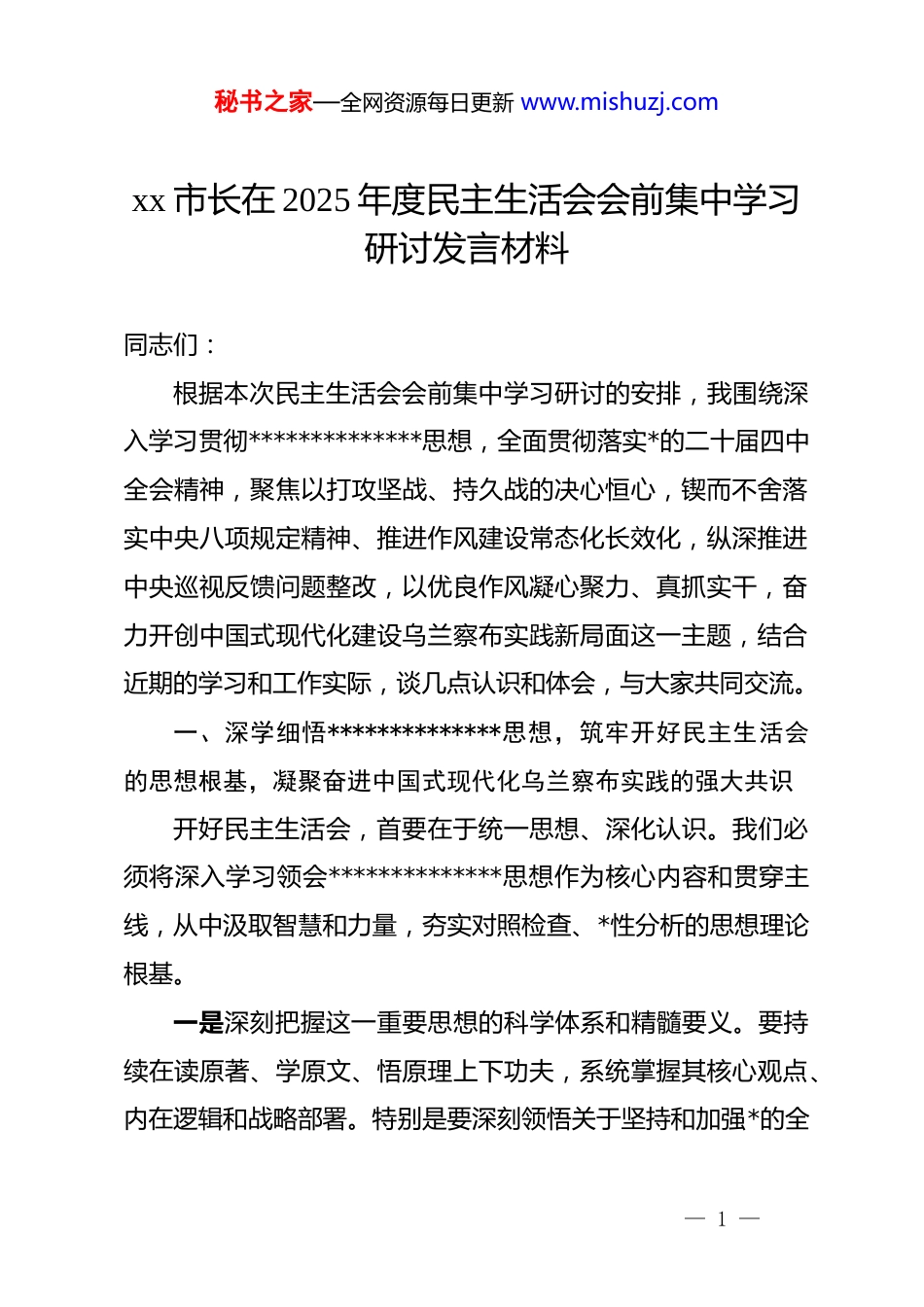 秘书之家—全网资源每日更新 www.mishuzj.comxx 市长在 2025 年度民主生活会会前集中学习研讨发言材料同志们:根据本次民主生活会会前集中学习研讨的安排,我围绕深入学习贯彻**************思想,全面贯彻落实*的二十届四中全会精神,聚焦以打攻坚战、持久战的决心恒心,锲而不舍落实中央八项规定精神、推进作风建设常态化长效化,纵深推进中央巡视反馈问题整改,以优良作风凝心聚力、真抓实干,奋力开创中国式现代化建设乌兰察布实践新局面这一主题,结合近期的学习和工作实际,谈几点认识和体会,与大家共同交流。一、深学细悟**************思想,筑牢开好民主生活会的思想根基,凝聚奋进中国式现代化乌兰察布实践的强大共识开好民主生活会,首要在于统一思想、深化认识。我们必须将深入学习领会**************思想作为核心内容和贯穿主线,从中汲取智慧和力量,夯实对照检查、*性分析的思想理论根基。一是深刻把握这一重要思想的科学体系和精髓要义。要持续在读原著、学原文、悟原理上下功夫,系统掌握其核心观点、内在逻辑和战略部署。特别是要深刻领悟关于坚持和加强*的全— 1 —秘书之家—全网资源每日更新 www.mishuzj.com面领导、推进*的自我革命、以中国式现代化全面推进中华民族伟大复兴等一系列原创性治国理政新理念新思想新战略,不断提高政治判断力、政治领悟力、政治执行力,自觉做*的创新理论的坚定信仰者和忠实实践者,确保乌兰察布各项工作始终沿着正确方向前进。二是紧密结合*的二十届四中全会精神深化理解。*的二十届四中全会就坚持和完善中国特色社会主义制度、推进国家治理体系和治理能力现代化作出战略部署。我们必须将学习贯彻全会精神与深化对**************思想的理解贯通起来,深刻认识制度建设在*和国家事业全局中的根本性、全局性、稳定性、长期性作用。要思考如何将全会精神转化为提升我市治理效能、完善发展体制机制的具体实践,为中国式现代化乌兰察布篇章提供坚实制度保障。三是着力转化为推动发展的具体思路和务实举措。学习的成效最终要体现在推动工作上。要坚持理论联系实际的马克思主义学风,紧密结合我市建设国家重要能源和战略资源基地、农畜产品生产基地,发展新能源、数字经济、枢纽经济等实际,深入思考如何运用*的创新理论破解发展难题、激发动力活力、防范化解风险。要通过学习研讨,进一步明确乌兰察布在服务全国全区大局中的定位和责任,凝聚起全市上下团结奋斗、干— 2 —秘书之家—全网资源每日更新 www.mishuzj.com事创业的强大合力,切实把学习成果转化为谋划发展的科学思路、促进发展的政策举措、领导发展的实际能力。二、以打攻坚战、持久战的决心恒心,锲而不舍落实中央八项规定精神,推进作风建设常态化长效化作风建设关系人心向背,关系*的执政基础。中央八项规定是长期有效的铁规矩、硬杠杠。我们必须清醒认识到,作风问题具有顽固性、反复性,纠治“四风”不能止步,必须常抓不懈、久久为功,以“永远在路上”的清醒和坚定,将好作风弘扬在新时代。一是坚持严字当头,保持高压态势。要深刻认识“四风”问题的政治本质和政治危害,坚决克服“疲劳厌战”情绪和“歇脚松劲”想法。对享乐主义、奢靡之风等歪风陋习要露头就打、反复敲打,特别是要紧盯隐形变异新动向,深挖细查,防止反弹回潮。要聚焦形式主义、官僚主义这一*和人民事业的大敌,着力纠治影响*中央决策部署和自治区*委、市委工作要求贯彻落实、加重基层负担、权力观扭曲政绩观错位等问题,引导*员干部把心思用在干事业上,把功夫下到察实情、出实招、办实事、求实效上。二是健全长效机制,深化标本兼治。推进作风建设常态化长效化,关键在制度。要坚持纠“四风”与树新风并举,在严— 3 —秘书之家—全网资源每日更新 www.mishuzj.com厉惩治不正之风的同时,大力弘扬*的光荣传统和优良作风,倡导清正廉洁、担当作为的时代新风。要不断完善落实中央八项规定精神的具体措施,细化和规范相关制度规定,增强制度的针对性、可操作性和约束力。要强化制度执行,加强对制度落实情况的监督检查,对顶风违纪、违反制度的行为“零容忍”,让铁规发力、禁令...