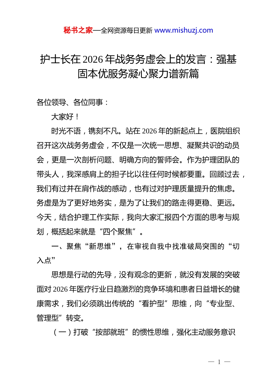 秘书之家—全网资源每日更新 www.mishuzj.com护士长在 2026 年战务务虚会上的发言:强基固本优服务凝心聚力谱新篇各位领导、各位同事:大家好!时光不语,镌刻不凡。站在 2026 年的新起点上,医院组织召开这次战务务虚会,不仅是一次统一思想、凝聚共识的动员会,更是一次剖析问题、明确方向的誓师会。作为护理团队的带头人,我深感肩上的担子比以往任何时候都要重。回顾过去,我们有过并在肩作战的感动,也有过对护理质量提升的焦虑。务虚是为了更好地务实,是为了让我们的路走得更稳、更远。今天,结合护理工作实际,我向大家汇报四个方面的思考与规划,概括起来就是“四个聚焦”。一、聚焦“新思维”,在审视自我中找准破局突围的“切入点”思想是行动的先导,没有观念的更新,就没有发展的突破面对 2026 年医疗行业日趋激烈的竞争环境和患者日益增长的健康需求,我们必须跳出传统的“看护型”思维,向“专业型、管理型”转变。(一)打破“按部就班”的惯性思维,强化主动服务意识— 1 —秘书之家—全网资源每日更新 www.mishuzj.com长期以来,部分护理人员习惯于执行医嘱,缺乏主动思考和超前服务的意识。在 2026 年,我们必须推动护理工作从“被动响应”向“主动干预”转变。这要求我们不仅要准确无误地完成打针输液等基础操作,更要学会“想在医生前面,做在患者开口之前”。我们要建立风险预警机制,通过细致观察提前发现病情变化的蛛丝马迹,把并发症消除在萌芽状态,用我们的专业敏锐度为患者的安全筑起第一道防线。(二)摒弃“单打独斗”的狭隘观念,深化医护一体化协作护理不是孤立的战场,而是整个医疗救治体系中的重要一环。我们要进一步打破医护之间的壁垒,构建“医护患命运共同体”。在日常查房、病例讨论、疑难危重症救治中,护理人员要敢于发声,从护理专业的角度提供有价值的建议。我们将探索建立医护联合查房、联合随访的新模式,让医疗方案与护理计划无缝对接,确保诊疗效果的最大化,让医生治得放心,让患者住得安心。(三)克服“只重技术”的片面认识,树立全面质量管理观技术操作固然重要,但它不是护理质量的全部。我们必须认识到,护理质量不仅体现在穿刺的成功率上,更体现在流程— 2 —秘书之家—全网资源每日更新 www.mishuzj.com的科学性、环境的舒适性以及管理的精细化上。2026 年,我们将引入现代管理工具,对护理流程进行全要素、全流程的再造。我们要敢于向低效流程“开刀”,向管理漏洞“亮剑”,通过数据分析找准质量短板,用科学的方法解决实际问题,真正实现护理管理从“经验型”向“科学型”的跨越。二、聚焦“硬实力”,在精益求精中筑牢质量安全的“压舱石”质量与安全是医院的生命线,更是护理工作的底线和红线新的一年,我们将以等级医院评审标准为准绳,严抓细管,确保护理安全万无一失。(一)夯实基础护理,让规范成为一种“肌肉记忆”基础不牢,地动山摇。我们将持续开展基础护理质量提升行动,对照最新的行业标准,对每一项护理操作流程进行梳理和修订。通过开展岗位练兵、技能比武等形式,强化全员的基本功训练,确保护理人员在关键时刻拉得出、冲得上、打得赢。我们要让标准成为习惯,让规范融入血液,坚决杜绝随意性和盲目性,确保每一项操作都经得起检验,每一个环节都符合规范。(二)严控关键环节,为患者织密一张“安全网”安全管理重在预防,胜在细节。我们将重点加强对重点环— 3 —秘书之家—全网资源每日更新 www.mishuzj.com节、重点时段、重点人群的管理。特别是对于交接班、药品管理、输血输液、危重患者转运等高风险环节,实施清单式管理,推行“双人核对、双重把关”制度。我们将建立不良事件无惩罚上报与根本原因分析机制,鼓励大家说真话、报实情,从失败中汲取教训,从隐患中发现漏洞,通过闭环管理堵塞安全黑洞,坚决遏制重特大护理安全事故的发生。(三)深耕专科内涵,打造学科发展的“新引擎”专科护理水平是衡量护理实力的重要标尺。2026 年,我们将根据科室发展规划,选拔一批业务骨干进行定向培养,鼓励其深造专科护士资质。我们将组建伤口造口、静脉治疗、重症监护等专科护理...