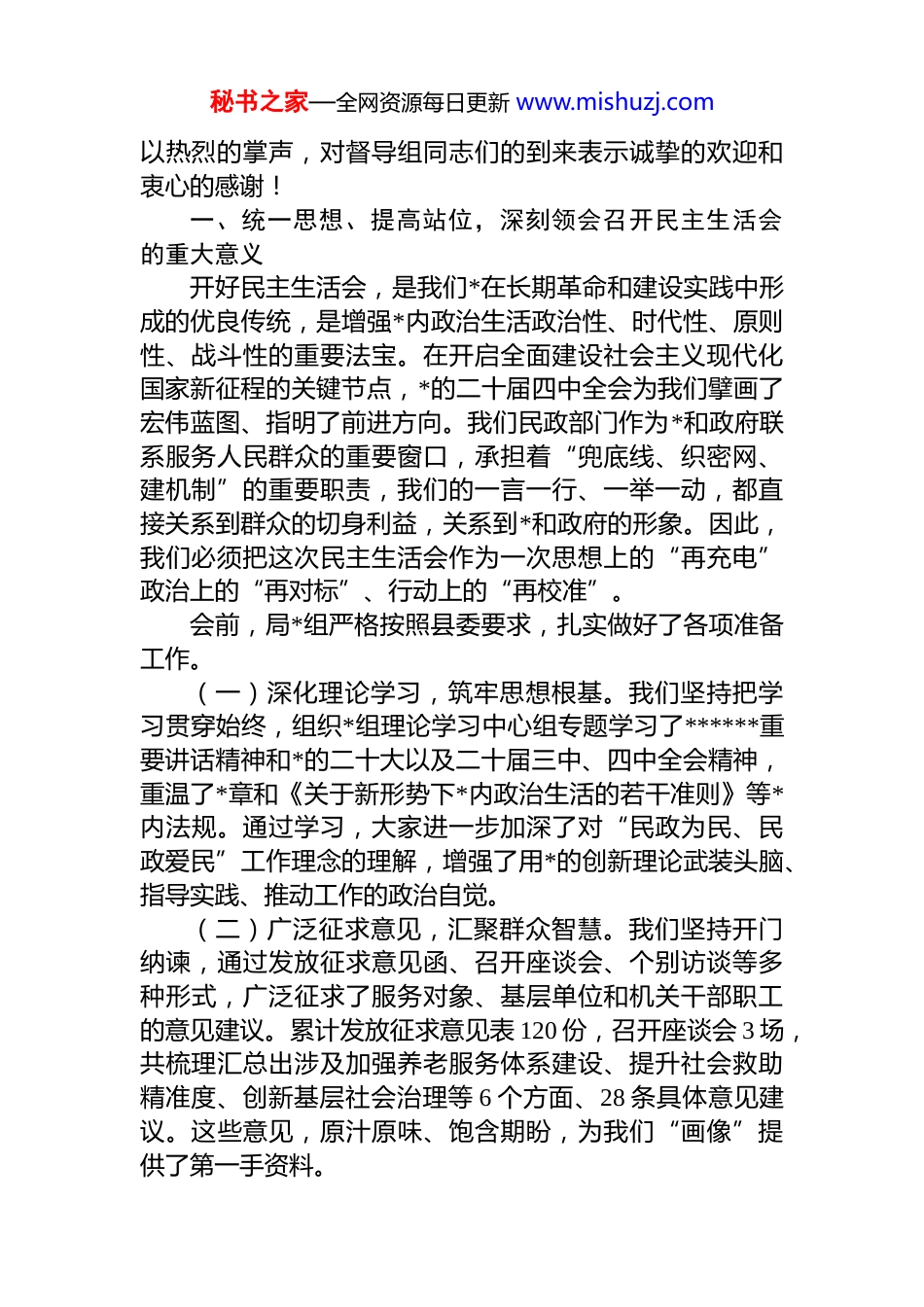 秘书之家—全网资源每日更新 www.mishuzj.com在 2025 年民主生活会上的主持讲话材料汇编(3 篇)目录1.局党组书记在 2025 年民主生活会上的主持讲话...................22.在 2025 年民主生活会上的主持讲话...................................103.在 2025 年民主生活会上的主持讲话...................................18局*组书记在 2025 年民主生活会上的主持讲话同志们:今天,我们在这里召开局*组 2025 年度民主生活会,这既是一次深刻的“政治体检”,也是一场严肃的思想洗礼开好这次会议,对于我们深入学习贯彻*的二十届四中全会精神,进一步统一思想、统一意志、统一行动,团结带领全局*员干部奋力谱写新时代民政事业高质量发展新篇章,具有十分重要的意义。县委对我们这次民主生活会高度重视,县委第督导组组长同志一行亲临会场全程指导。在此,我提议,让我们秘书之家—全网资源每日更新 www.mishuzj.com以热烈的掌声,对督导组同志们的到来表示诚挚的欢迎和衷心的感谢!一、统一思想、提高站位,深刻领会召开民主生活会的重大意义开好民主生活会,是我们*在长期革命和建设实践中形成的优良传统,是增强*内政治生活政治性、时代性、原则性、战斗性的重要法宝。在开启全面建设社会主义现代化国家新征程的关键节点,*的二十届四中全会为我们擘画了宏伟蓝图、指明了前进方向。我们民政部门作为*和政府联系服务人民群众的重要窗口,承担着“兜底线、织密网、建机制”的重要职责,我们的一言一行、一举一动,都直接关系到群众的切身利益,关系到*和政府的形象。因此,我们必须把这次民主生活会作为一次思想上的“再充电”政治上的“再对标”、行动上的“再校准”。会前,局*组严格按照县委要求,扎实做好了各项准备工作。(一)深化理论学习,筑牢思想根基。我们坚持把学习贯穿始终,组织*组理论学习中心组专题学习了******重要讲话精神和*的二十大以及二十届三中、四中全会精神,重温了*章和《关于新形势下*内政治生活的若干准则》等*内法规。通过学习,大家进一步加深了对“民政为民、民政爱民”工作理念的理解,增强了用*的创新理论武装头脑、指导实践、推动工作的政治自觉。(二)广泛征求意见,汇聚群众智慧。我们坚持开门纳谏,通过发放征求意见函、召开座谈会、个别访谈等多种形式,广泛征求了服务对象、基层单位和机关干部职工的意见建议。累计发放征求意见表 120 份,召开座谈会 3 场,共梳理汇总出涉及加强养老服务体系建设、提升社会救助精准度、创新基层社会治理等 6 个方面、28 条具体意见建议。这些意见,原汁原味、饱含期盼,为我们“画像”提供了第一手资料。秘书之家—全网资源每日更新 www.mishuzj.com(三)深入谈心谈话,营造良好氛围。我带头与班子每位成员、班子成员相互之间、班子成员与分管股室负责人之间,都开展了深入的谈心谈话。大家敞开心扉、坦诚交流,既谈工作也谈思想,既肯定成绩也指出不足,把问题谈开、把思想谈通,为开展批评和自我批评营造了“团结—批评—团结”的良好氛围。(四)认真撰写材料,深刻检视剖析。在以上工作基础上,我主持起草了*组班子对照检查材料,班子成员认真撰写了个人发言提纲,都做到了紧扣主题、正视问题、深挖根源,为开好这次高质量的民主生活会奠定了坚实基础可以说,会前准备工作是充分的、扎实的。希望同志们能以对*、对事业、对同志、对自己高度负责的态度,拿起批评和自我批评的武器,打扫思想上和政治上的灰尘,共同经历一次严格的*内政治生活锻炼。二、聚焦主题、直面问题,严肃认真开展批评和自我批评开展批评和自我批评,是我们*强身治病、保持肌体健康的锐利武器。***同志曾将其比作“扫帚”和“镜子”,是抵御政治灰尘和政治微生物侵袭的有效方式。今天的会议,就是要让大家“红红脸、出出汗”,达到“排毒治病加油鼓劲”的效果。为确保会议质量,我提几点要求:一是自我批评要“深”。要敢于向自己“开炮”,主动把自己摆进去、把职责摆进去、把工作摆进去。要以“揭短亮丑”的勇气、“刮骨疗毒”的决心,深刻剖析自身在政治、思想、能力、作风、纪律等方面存在的突出问...