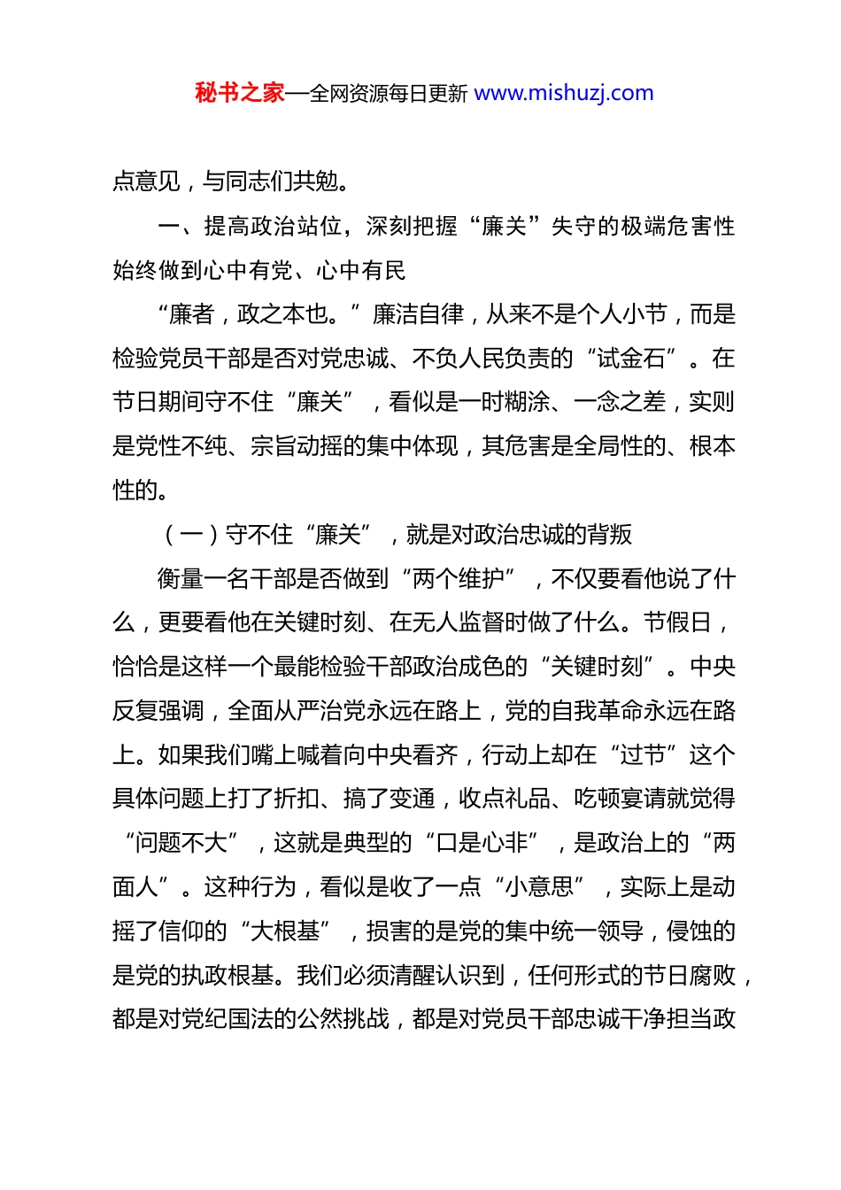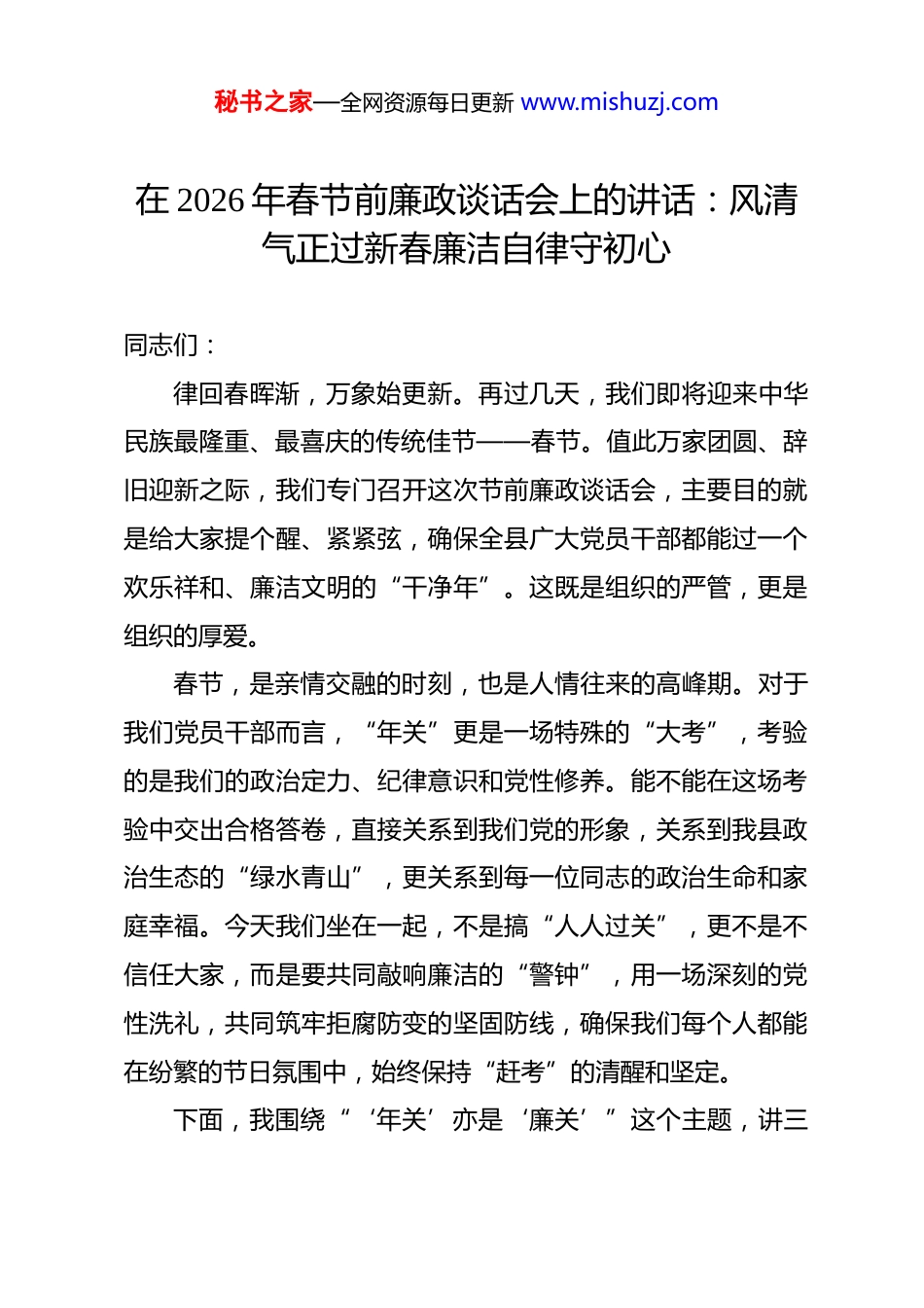秘书之家—全网资源每日更新 www.mishuzj.com在 2026 年春节前廉政谈话会上的讲话:风清气正过新春廉洁自律守初心 同志们:律回春晖渐,万象始更新。再过几天,我们即将迎来中华民族最隆重、最喜庆的传统佳节——春节。值此万家团圆、辞旧迎新之际,我们专门召开这次节前廉政谈话会,主要目的就是给大家提个醒、紧紧弦,确保全县广大党员干部都能过一个欢乐祥和、廉洁文明的“干净年”。这既是组织的严管,更是组织的厚爱。春节,是亲情交融的时刻,也是人情往来的高峰期。对于我们党员干部而言,“年关”更是一场特殊的“大考”,考验的是我们的政治定力、纪律意识和党性修养。能不能在这场考验中交出合格答卷,直接关系到我们党的形象,关系到我县政治生态的“绿水青山”,更关系到每一位同志的政治生命和家庭幸福。今天我们坐在一起,不是搞“人人过关”,更不是不信任大家,而是要共同敲响廉洁的“警钟”,用一场深刻的党性洗礼,共同筑牢拒腐防变的坚固防线,确保我们每个人都能在纷繁的节日氛围中,始终保持“赶考”的清醒和坚定。下面,我围绕“‘年关’亦是‘廉关’”这个主题,讲三秘书之家—全网资源每日更新 www.mishuzj.com点意见,与同志们共勉。一、提高政治站位,深刻把握“廉关”失守的极端危害性始终做到心中有党、心中有民“廉者,政之本也。”廉洁自律,从来不是个人小节,而是检验党员干部是否对党忠诚、不负人民负责的“试金石”。在节日期间守不住“廉关”,看似是一时糊涂、一念之差,实则是党性不纯、宗旨动摇的集中体现,其危害是全局性的、根本性的。(一)守不住“廉关”,就是对政治忠诚的背叛衡量一名干部是否做到“两个维护”,不仅要看他说了什么,更要看他在关键时刻、在无人监督时做了什么。节假日,恰恰是这样一个最能检验干部政治成色的“关键时刻”。中央反复强调,全面从严治党永远在路上,党的自我革命永远在路上。如果我们嘴上喊着向中央看齐,行动上却在“过节”这个具体问题上打了折扣、搞了变通,收点礼品、吃顿宴请就觉得“问题不大”,这就是典型的“口是心非”,是政治上的“两面人”。这种行为,看似是收了一点“小意思”,实际上是动摇了信仰的“大根基”,损害的是党的集中统一领导,侵蚀的是党的执政根基。我们必须清醒认识到,任何形式的节日腐败,都是对党纪国法的公然挑战,都是对党员干部忠诚干净担当政秘书之家—全网资源每日更新 www.mishuzj.com治品格的严重亵渎。(二)守不住“廉关”,就是对发展成果的践踏过去一年,我们全县上下凝心聚力、攻坚克难,经济社会发展取得了来之不易的成绩。地区生产总值预计突破*亿元大关,一批重大项目落地生根,城乡面貌日新月异,民生福祉持续改善。这些成绩的取得,是全县人民共同奋斗的结果,也凝聚着在座各位同志的心血和汗ت。然而,我们要时刻警惕,腐败是发展的最大毒瘤。一个贪腐案例,就可能毁掉一个团队多年的努力;一桌不该吃的饭,就可能带坏一个单位的风气;一份不该收的礼,就可能让一项惠民政策在执行中变了味。人民群众最痛恨的就是腐败现象,如果我们不能在廉洁问题上做出表率,就会严重挫伤干部群众干事创业的积极性,就会让我们辛辛苦苦取得的发展成果付诸东流。守护好发展成果,就必须先守护好我们自身的廉洁底线,用我们的清廉指数,换取人民的幸福指数和信任指数。(三)守不住“廉关”,就是对家庭幸福的透支党员干部也是普通人,也有家庭、有亲人。过节,图的就是家庭和睦、幸福团圆。但我们必须明白,廉洁才是家庭最稳固的“幸福基石”,纪法才是家人最可靠的“护身符”。很多落马干部的忏悔录中,都充满了对家庭的愧疚。他们曾经也想秘书之家—全网资源每日更新 www.mishuzj.com为家庭创造更好的条件,却因为一时的贪念,最终不仅毁了自己,也毁了整个家庭,让亲人蒙羞、抬不起头。同志们,我们一定要算好人生“七笔账”——政治账、经济账、名誉账、家庭账、亲情账、自由账、健康账。任何时候都不要抱有侥幸心理,不要以为自己的“小动作”神不知鬼不觉。天网恢恢,疏而不漏。为了自己和家人的长久幸福,我们必须时刻自重、自省、自警、自励,用清...