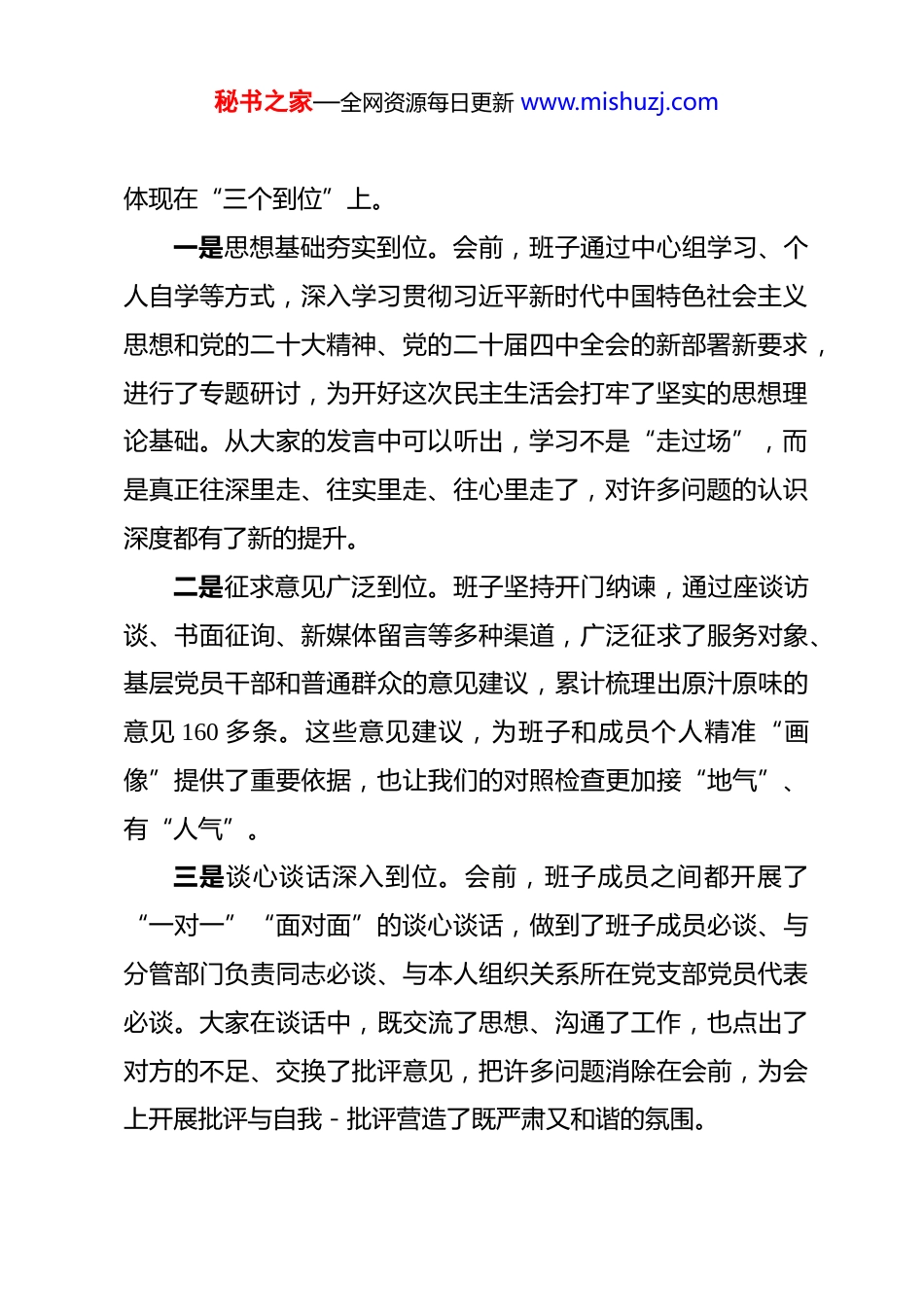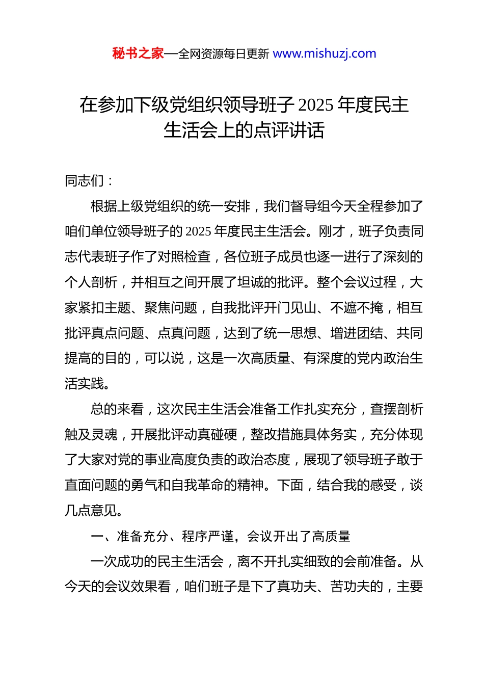 秘书之家—全网资源每日更新 www.mishuzj.com在参加下级党组织领导班子 2025 年度民主生活会上的点评讲话 同志们:根据上级党组织的统一安排,我们督导组今天全程参加了咱们单位领导班子的 2025 年度民主生活会。刚才,班子负责同志代表班子作了对照检查,各位班子成员也逐一进行了深刻的个人剖析,并相互之间开展了坦诚的批评。整个会议过程,大家紧扣主题、聚焦问题,自我批评开门见山、不遮不掩,相互批评真点问题、点真问题,达到了统一思想、增进团结、共同提高的目的,可以说,这是一次高质量、有深度的党内政治生活实践。总的来看,这次民主生活会准备工作扎实充分,查摆剖析触及灵魂,开展批评动真碰硬,整改措施具体务实,充分体现了大家对党的事业高度负责的政治态度,展现了领导班子敢于直面问题的勇气和自我革命的精神。下面,结合我的感受,谈几点意见。一、准备充分、程序严谨,会议开出了高质量一次成功的民主生活会,离不开扎实细致的会前准备。从今天的会议效果看,咱们班子是下了真功夫、苦功夫的,主要秘书之家—全网资源每日更新 www.mishuzj.com体现在“三个到位”上。一是思想基础夯实到位。会前,班子通过中心组学习、个人自学等方式,深入学习贯彻习近平新时代中国特色社会主义思想和党的二十大精神、党的二十届四中全会的新部署新要求,进行了专题研讨,为开好这次民主生活会打牢了坚实的思想理论基础。从大家的发言中可以听出,学习不是“走过场”,而是真正往深里走、往实里走、往心里走了,对许多问题的认识深度都有了新的提升。二是征求意见广泛到位。班子坚持开门纳谏,通过座谈访谈、书面征询、新媒体留言等多种渠道,广泛征求了服务对象、基层党员干部和普通群众的意见建议,累计梳理出原汁原味的意见 160 多条。这些意见建议,为班子和成员个人精准“画像”提供了重要依据,也让我们的对照检查更加接“地气”、有“人气”。三是谈心谈话深入到位。会前,班子成员之间都开展了“一对一”“面对面”的谈心谈话,做到了班子成员必谈、与分管部门负责同志必谈、与本人组织关系所在党支部党员代表必谈。大家在谈话中,既交流了思想、沟通了工作,也点出了对方的不足、交换了批评意见,把许多问题消除在会前,为会上开展批评与自我-批评营造了既严肃又和谐的氛围。秘书之家—全网资源每日更新 www.mishuzj.com二、直面问题、深挖根源,批评和自我批评有“辣味”检验民主生活会成效的一个重要标准,就是看批评和自我批评是否真正“红脸出汗”。今天,大家放下了思想包袱,体现了刀刃向内的勇气。一方面,自我批评勇于“揭短亮丑”。大家的发言,都紧密联系自己的思想、工作、生活和作风实际,主动把自己摆进去、把职责摆进去、把工作摆进去。比如,有同志谈到,在推动重点项目建设中,存在“重部署、轻督导”的问题,习惯于开了会、发了文就算落实了,对项目推进过程中的难点堵点,跟踪问效不够,导致一些工作“雷声大、雨点小”。还有同志反思,面对新形势新任务,知识储备和能力本领出现“赤字”,存在一定的“本领恐慌”,在运用数字化手段提升治理效能上,思路不清、办法不多。这些问题找得准、挖得深,体现了正视问题的自觉。另一方面,相互批评敢于“真刀真枪”。大家本着对同志对事业负责的态度,提出的批评意见开门见山、直截了当,很有“辣味”。例如,有同志对班子主要负责同志提出,“希望您在决策时能更多听取不同意见,有时感觉您决策定得快,留给班子成员酝酿讨论的时间不够充分”。也有同志在批评班子成员时指出,“您抓工作魄力很足,但有时性子比较急,对下秘书之家—全网资源每日更新 www.mishuzj.com属要求高、批评多,暖心鼓励少,影响了干部积极性”。这些批评意见,点到了具体事、点到了关键处,既有思想交锋,又有感情交流,是真正的“团结—批评—团结”。三、肯定成绩,也要清醒看到存在的不足总体上,这次民主生活会是成功的。但我们也要坚持高标准、严要求,客观地看,还存在一些可以进一步深化和提升的地方。一是在剖析问题根源的深度上还可以再“下探”。部分同志在分析问题根源时,谈工作层面、现象层面的多...