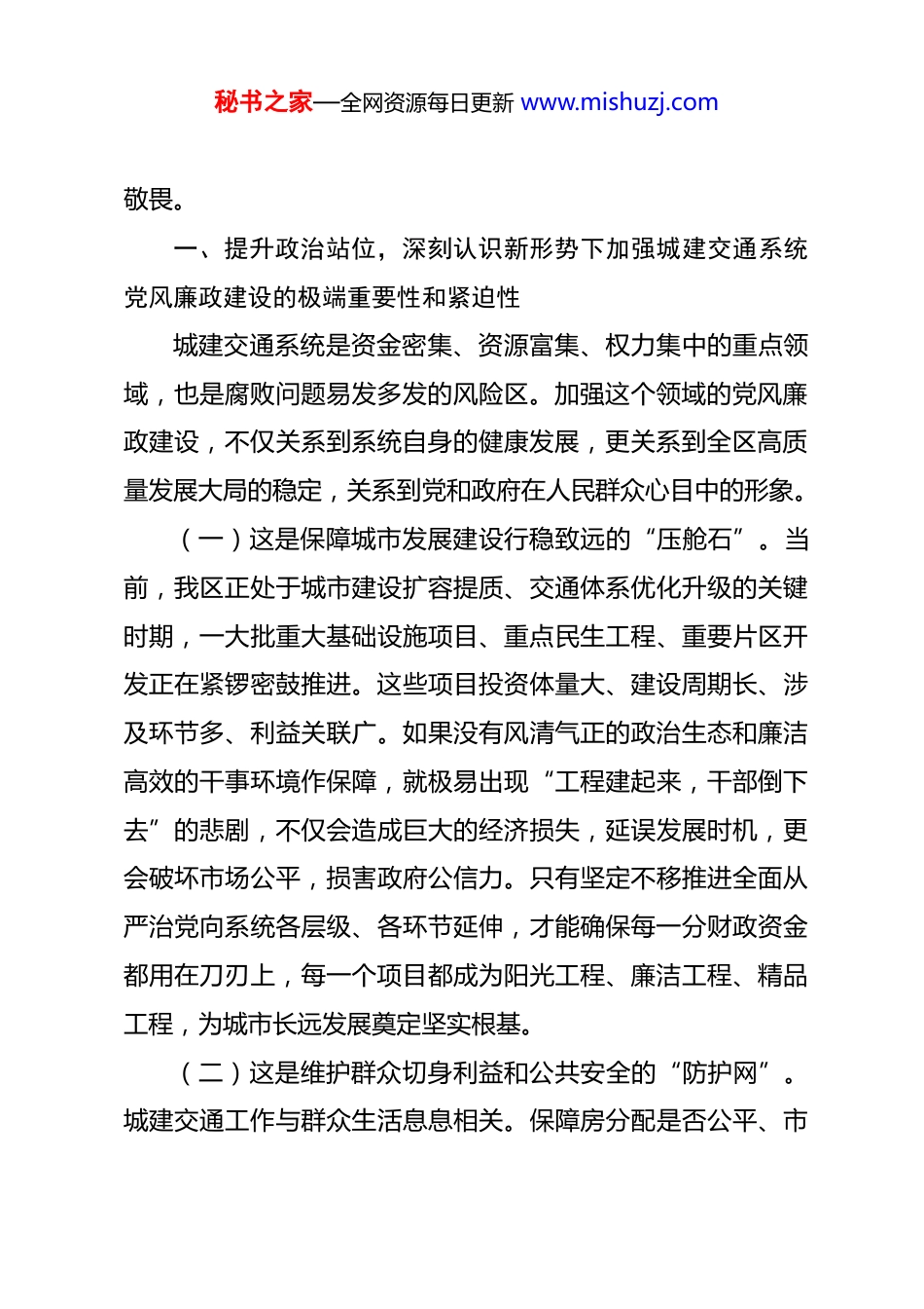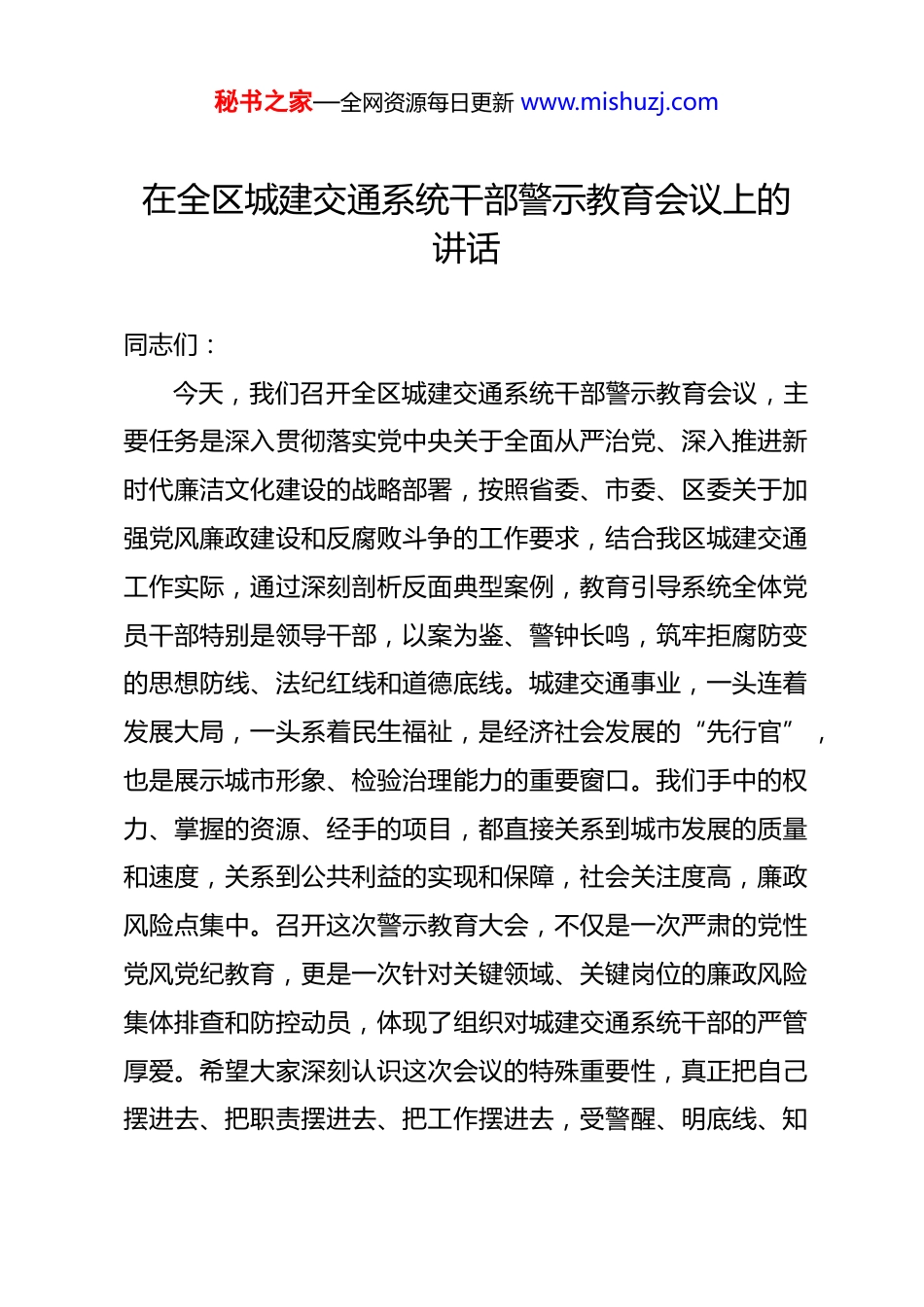 秘书之家—全网资源每日更新 www.mishuzj.com在全区城建交通系统干部警示教育会议上的讲话 同志们:今天,我们召开全区城建交通系统干部警示教育会议,主要任务是深入贯彻落实党中央关于全面从严治党、深入推进新时代廉洁文化建设的战略部署,按照省委、市委、区委关于加强党风廉政建设和反腐败斗争的工作要求,结合我区城建交通工作实际,通过深刻剖析反面典型案例,教育引导系统全体党员干部特别是领导干部,以案为鉴、警钟长鸣,筑牢拒腐防变的思想防线、法纪红线和道德底线。城建交通事业,一头连着发展大局,一头系着民生福祉,是经济社会发展的“先行官”,也是展示城市形象、检验治理能力的重要窗口。我们手中的权力、掌握的资源、经手的项目,都直接关系到城市发展的质量和速度,关系到公共利益的实现和保障,社会关注度高,廉政风险点集中。召开这次警示教育大会,不仅是一次严肃的党性党风党纪教育,更是一次针对关键领域、关键岗位的廉政风险集体排查和防控动员,体现了组织对城建交通系统干部的严管厚爱。希望大家深刻认识这次会议的特殊重要性,真正把自己摆进去、把职责摆进去、把工作摆进去,受警醒、明底线、知秘书之家—全网资源每日更新 www.mishuzj.com敬畏。一、提升政治站位,深刻认识新形势下加强城建交通系统党风廉政建设的极端重要性和紧迫性城建交通系统是资金密集、资源富集、权力集中的重点领域,也是腐败问题易发多发的风险区。加强这个领域的党风廉政建设,不仅关系到系统自身的健康发展,更关系到全区高质量发展大局的稳定,关系到党和政府在人民群众心目中的形象。(一)这是保障城市发展建设行稳致远的“压舱石”。当前,我区正处于城市建设扩容提质、交通体系优化升级的关键时期,一大批重大基础设施项目、重点民生工程、重要片区开发正在紧锣密鼓推进。这些项目投资体量大、建设周期长、涉及环节多、利益关联广。如果没有风清气正的政治生态和廉洁高效的干事环境作保障,就极易出现“工程建起来,干部倒下去”的悲剧,不仅会造成巨大的经济损失,延误发展时机,更会破坏市场公平,损害政府公信力。只有坚定不移推进全面从严治党向系统各层级、各环节延伸,才能确保每一分财政资金都用在刀刃上,每一个项目都成为阳光工程、廉洁工程、精品工程,为城市长远发展奠定坚实根基。(二)这是维护群众切身利益和公共安全的“防护网”。城建交通工作与群众生活息息相关。保障房分配是否公平、市秘书之家—全网资源每日更新 www.mishuzj.com政设施是否完善、道路桥梁是否安全、行政审批是否高效、行政执法是否公正,这些都直接关乎群众的获得感、幸福感、安全感。发生在城建交通领域的腐败问题和作风顽疾,往往直接侵害群众利益,在征地拆迁中优亲厚友、在工程质量监管中吃拿卡要、在公用事业管理中谋取私利等。这些问题啃食的是群众利益,透支的是群众信任。加强党风廉政建设,就是要坚决斩断伸向群众利益的“黑手”,堵住公共资源流失的“漏洞”,以清正廉洁的实际行动守护好民心这个最大的政治,确保城市建设发展的成果真正惠及全体人民。(三)这是锻造忠诚干净担当城建交通铁军的“必修课”事业的成败,关键在人。锻造一支政治强、业务精、作风硬、纪律严的城建交通干部队伍,是完成繁重艰巨改革发展任务的根本保证。警示教育如同“清醒剂”和“防疫针”,目的是帮助干部在纷繁复杂的诱惑面前保持定力,在权力行使过程中恪守边界。面对项目建设、审批监管、行政执法中的各种围猎和诱惑,只有常怀律己之心、常思贪欲之害,不断筑牢思想防线,才能避免从“看片人”沦为“片中人”。加强系统党风廉政建设,就是要把严的要求贯穿干部教育管理监督全过程,督促干部在严管下成长、在磨砺中成才,成为可堪大用、能担重任的栋梁之材。秘书之家—全网资源每日更新 www.mishuzj.com二、坚持问题导向,清醒正视当前城建交通系统存在的突出廉政风险与作风积弊近年来,在区委的坚强领导和区纪委监委的严格监督下,全区城建交通系统党风廉政建设和反腐败斗争取得了积极进展,但我们必须清醒看到,系统内反腐败斗争形势依然严峻复杂,一些深层次问题尚未根治,...