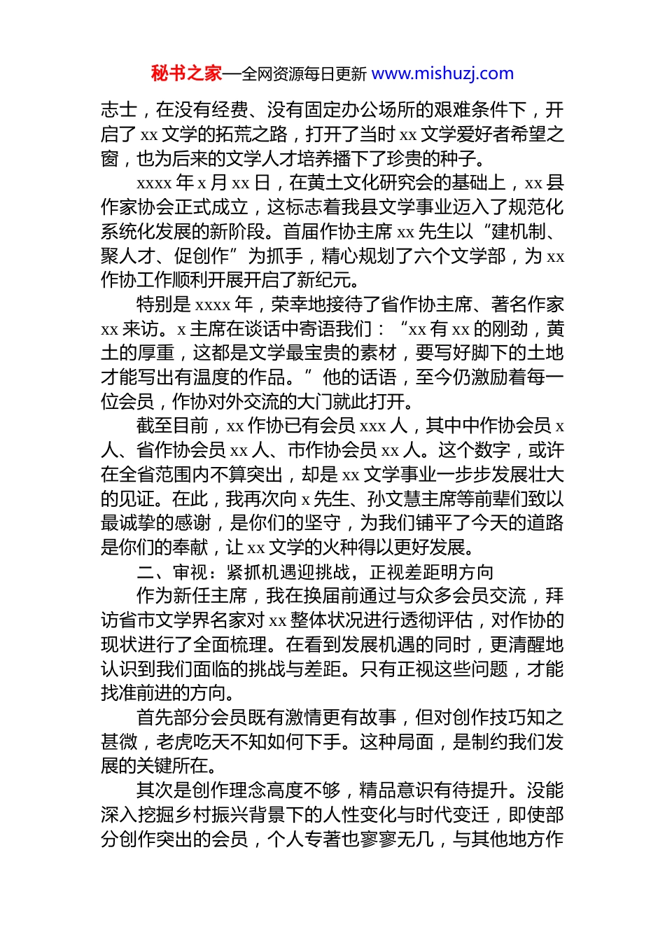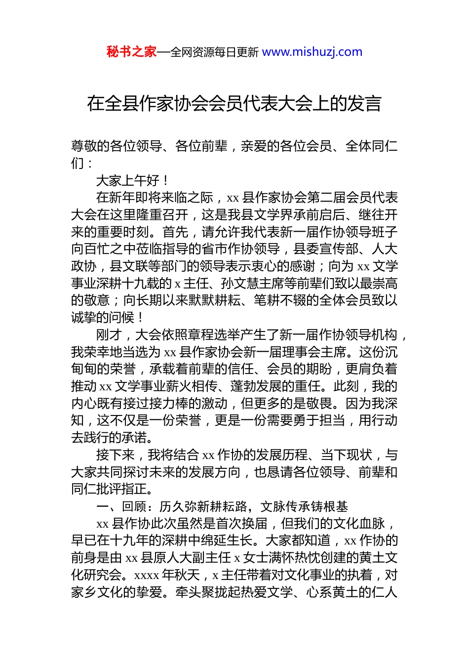 秘书之家—全网资源每日更新 www.mishuzj.com在全县作家协会会员代表大会上的发言尊敬的各位领导、各位前辈,亲爱的各位会员、全体同仁们:大家上午好!在新年即将来临之际,xx 县作家协会第二届会员代表大会在这里隆重召开,这是我县文学界承前启后、继往开来的重要时刻。首先,请允许我代表新一届作协领导班子向百忙之中莅临指导的省市作协领导,县委宣传部、人大政协,县文联等部门的领导表示衷心的感谢;向为 xx 文学事业深耕十九载的 x 主任、孙文慧主席等前辈们致以最崇高的敬意;向长期以来默默耕耘、笔耕不辍的全体会员致以诚挚的问候!刚才,大会依照章程选举产生了新一届作协领导机构,我荣幸地当选为 xx 县作家协会新一届理事会主席。这份沉甸甸的荣誉,承载着前辈的信任、会员的期盼,更肩负着推动 xx 文学事业薪火相传、蓬勃发展的重任。此刻,我的内心既有接过接力棒的激动,但更多的是敬畏。因为我深知,这不仅是一份荣誉,更是一份需要勇于担当,用行动去践行的承诺。接下来,我将结合 xx 作协的发展历程、当下现状,与大家共同探讨未来的发展方向,也恳请各位领导、前辈和同仁批评指正。一、回顾:历久弥新耕耘路,文脉传承铸根基xx 县作协此次虽然是首次换届,但我们的文化血脉,早已在十九年的深耕中绵延生长。大家都知道,xx 作协的前身是由 xx 县原人大副主任 x 女士满怀热忱创建的黄土文化研究会。xxxx 年秋天,x 主任带着对文化事业的执着,对家乡文化的挚爱。牵头聚拢起热爱文学、心系黄土的仁人秘书之家—全网资源每日更新 www.mishuzj.com志士,在没有经费、没有固定办公场所的艰难条件下,开启了 xx 文学的拓荒之路,打开了当时 xx 文学爱好者希望之窗,也为后来的文学人才培养播下了珍贵的种子。xxxx 年 x 月 xx 日,在黄土文化研究会的基础上,xx 县作家协会正式成立,这标志着我县文学事业迈入了规范化系统化发展的新阶段。首届作协主席 xx 先生以“建机制、聚人才、促创作”为抓手,精心规划了六个文学部,为 xx作协工作顺利开展开启了新纪元。特别是 xxxx 年,荣幸地接待了省作协主席、著名作家xx 来访。x 主席在谈话中寄语我们:“xx 有 xx 的刚劲,黄土的厚重,这都是文学最宝贵的素材,要写好脚下的土地才能写出有温度的作品。”他的话语,至今仍激励着每一位会员,作协对外交流的大门就此打开。截至目前,xx 作协已有会员 xxx 人,其中中作协会员 x人、省作协会员 xx 人、市作协会员 xx 人。这个数字,或许在全省范围内不算突出,却是 xx 文学事业一步步发展壮大的见证。在此,我再次向 x 先生、孙文慧主席等前辈们致以最诚挚的感谢,是你们的坚守,为我们铺平了今天的道路是你们的奉献,让 xx 文学的火种得以更好发展。二、审视:紧抓机遇迎挑战,正视差距明方向作为新任主席,我在换届前通过与众多会员交流,拜访省市文学界名家对 xx 整体状况进行透彻评估,对作协的现状进行了全面梳理。在看到发展机遇的同时,更清醒地认识到我们面临的挑战与差距。只有正视这些问题,才能找准前进的方向。首先部分会员既有激情更有故事,但对创作技巧知之甚微,老虎吃天不知如何下手。这种局面,是制约我们发展的关键所在。其次是创作理念高度不够,精品意识有待提升。没能深入挖掘乡村振兴背景下的人性变化与时代变迁,即使部分创作突出的会员,个人专著也寥寥无几,与其他地方作秘书之家—全网资源每日更新 www.mishuzj.com家“一年一部集子、两年一部专著”的创作节奏相比,还有差距。再者对创作资源挖掘不深,特色优势未能凸显。xx 是xx 文化、长城文化、边塞文化、中原文化、农耕文化、草原文化交融的独特区域,我们的作品尚未能形成 xx 的地标性文学品牌。最后是服务保障体系不够完善,支撑作用有待加强。在人才培养上,培训活动多以“讲座式”为主,缺乏“系统的专业培训”与对口精准指导;在作品传播上,过度依赖传统刊物,对微信公众号、短视频等新媒体平台运用不足,很多优秀作品“藏在深闺人未识”。当然,我们更要看到发展的机遇。当前,国家高度重视文化建设,***文化思想为...