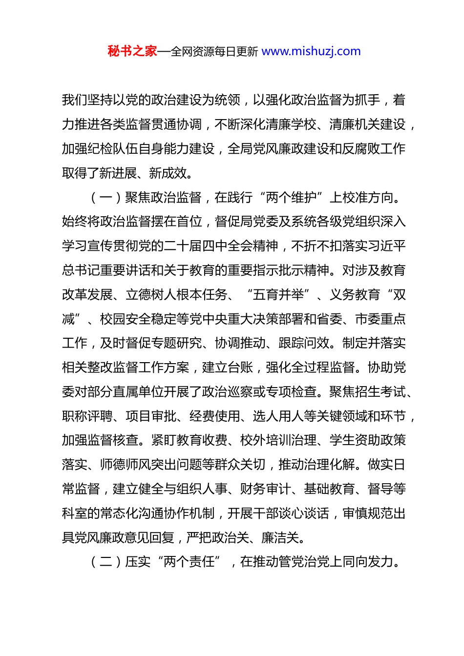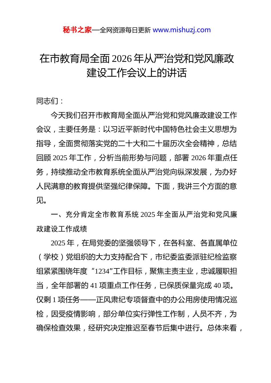 秘书之家—全网资源每日更新 www.mishuzj.com在市教育局全面 2026 年从严治党和党风廉政建设工作会议上的讲话 同志们:今天我们召开市教育局全面从严治党和党风廉政建设工作会议,主要任务是:以习近平新时代中国特色社会主义思想为指导,全面贯彻落实党的二十大和二十届历次全会精神,总结回顾 2025 年工作,分析当前形势与问题,部署 2026 年重点任务,持续推动全市教育系统全面从严治党向纵深发展,为办好人民满意的教育提供坚强纪律保障。下面,我讲三个方面的意见。一、充分肯定全市教育系统 2025 年全面从严治党和党风廉政建设工作成绩2025 年,在局党委的坚强领导下,在各科室、各直属单位(学校)党组织的大力支持配合下,市纪委监委派驻纪检监察组紧紧围绕年度“1234”工作目标,聚焦主责主业,忠诚履职担当,全年部署的 41 项重点工作任务,已保质保量完成 40 项。仅剩 1 项任务——正风肃纪专项督查中的办公用房使用情况巡检,因受疫情影响,部分单位实行弹性工作制,人员不齐,为确保检查效果,经研究决定推迟至春节后集中进行。总体来看,秘书之家—全网资源每日更新 www.mishuzj.com我们坚持以党的政治建设为统领,以强化政治监督为抓手,着力推进各类监督贯通协调,不断深化清廉学校、清廉机关建设,加强纪检队伍自身能力建设,全局党风廉政建设和反腐败工作取得了新进展、新成效。(一)聚焦政治监督,在践行“两个维护”上校准方向。始终将政治监督摆在首位,督促局党委及系统各级党组织深入学习宣传贯彻党的二十届四中全会精神,不折不扣落实习近平总书记重要讲话和关于教育的重要指示批示精神。对涉及教育改革发展、立德树人根本任务、“五育并举”、义务教育“双减”、校园安全稳定等党中央重大决策部署和省委、市委重点工作,及时督促专题研究、协调推动、跟踪问效。制定并落实相关整改监督工作方案,建立台账,强化全过程监督。协助党委对部分直属单位开展了政治巡察或专项检查。聚焦招生考试、职称评聘、项目审批、经费使用、选人用人等关键领域和环节,加强监督核查。紧盯教育收费、校外培训治理、学生资助政策落实、师德师风突出问题等群众关切,推动治理化解。做实日常监督,建立健全与组织人事、财务审计、基础教育、督导等科室的常态化沟通协作机制,开展干部谈心谈话,审慎规范出具党风廉政意见回复,严把政治关、廉洁关。(二)压实“两个责任”,在推动管党治党上同向发力。秘书之家—全网资源每日更新 www.mishuzj.com协助局党委召开年度全面从严治党工作会议,分解制定重点工作计划,推动党委主体责任和纪委监督责任贯通联动、一体落实。组织开展与各科室、单位的常态化联系走访活动,加强信息沟通,掌握基层实情。探索推动建立与市属高校纪委、区县教育部门纪检机构的联动工作机制,召开专题座谈会,汇聚监督合力,共同研判教育领域廉政风险,协同推进问题整改。(三)深化正风肃纪,在维护纪律刚性上清障护航。督促协助局党委深入开展形式主义、官僚主义突出问题整治,会同相关部门开展违反中央八项规定精神典型问题专项治理,以及教育领域可能存在的“微腐败”、利用职务影响谋利等问题的专项整治。督促开展规范津补贴发放、公款使用等情况的自查自纠。协助党委对审计、检查中发现的问题进行问责追责。持续规范信访举报和问题线索的受理处置。推动将师德师风建设、规范教育收费等要求纳入对学校年度考核和督导评估体系。(四)筑牢思想堤坝,在培育清廉文化上润心护航。加强廉洁教育,通过纪委书记讲廉政党课、新入职教师和干部岗前廉政谈话、观看警示教育片《失守的防线》等形式,强化年轻干部和教师的纪法意识。开展经常性纪律教育,用好教育系统违纪违法案例通报,以案明纪、以案说法。举办“清风校园·廉润心田”系列主题活动,开展廉洁文化作品征集、家风故事分秘书之家—全网资源每日更新 www.mishuzj.com享等,推动清廉理念融入校园文化、渗入师生日常。推进清廉学校建设,印发指导意见,选树示范点,营造风清气正的育人环境。与部分高校开展廉洁教育共建,加强对师范生的职业伦理和廉洁从教教育。(五)加强自身...