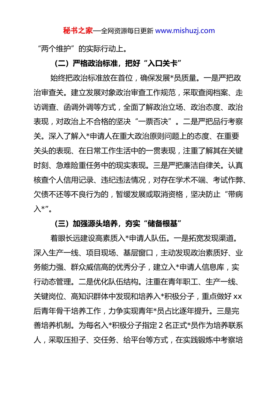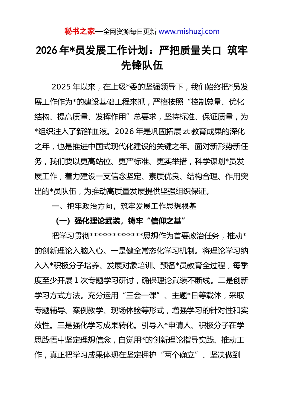 秘书之家—全网资源每日更新 www.mishuzj.com2026 年*员发展工作计划:严把质量关口 筑牢先锋队伍2025 年以来,在上级*委的坚强领导下,我们始终把*员发展工作作为*的建设基础工程来抓,严格按照“控制总量、优化结构、提高质量、发挥作用”总要求,坚持标准、保证质量,为*组织注入了新鲜血液。2026 年是巩固拓展 zt 教育成果的深化之年,也是推进中国式现代化建设的关键之年。面对新形势新任务,我们要以更高站位、更严标准、更实举措,科学谋划*员发展工作,着力建设一支信念坚定、素质优良、结构合理、作用突出的*员队伍,为推动高质量发展提供坚强组织保证。一、把牢政治方向,筑牢发展工作思想根基(一)强化理论武装,铸牢“信仰之基”把学习贯彻**************思想作为首要政治任务,推动*的创新理论入脑入心。一是健全常态化学习机制。将理论学习纳入入*积极分子培养、发展对象培训、预备*员教育全过程,每季度至少开展 1 次专题学习研讨,确保理论武装不断线。二是创新学习方式方法。充分运用“三会一课”、主题*日等载体,采取专题辅导、案例教学、现场体验等形式,增强学习的针对性和实效性。三是强化学习成果转化。引导入*申请人、积极分子在学思践悟中坚定理想信念,自觉用*的创新理论指导实践、推动工作,真正把学习成果体现在坚定拥护“两个确立”、坚决做到秘书之家—全网资源每日更新 www.mishuzj.com“两个维护”的实际行动上。(二)严格政治标准,把好“入口关卡”始终把政治标准放在首位,确保发展*员质量。一是严把政治审查关。建立发展对象政治审查工作规范,采取查阅档案、走访调查、函调外调等方式,全面了解政治立场、政治态度、政治表现,对政治上不合格的坚决“一票否决”。二是严把品行考察关。深入了解入*申请人在重大政治原则问题上的态度、在重要关头的表现、在日常工作生活中的一贯表现,注重了解其在关键时刻、急难险重任务中的现实表现。三是严把廉洁自律关。认真核查个人信用记录、违纪违法情况,对存在学术不端、考试作弊、欠债不还等不良行为的,暂缓发展或取消资格,坚决防止“带病入*”。(三)加强源头培养,夯实“储备根基”着眼长远建设高素质入*申请人队伍。一是拓宽发现渠道。深入生产一线、项目现场、基层窗口,主动发现政治素质好、业务能力强、群众威信高的优秀分子,建立入*申请人信息库,实行动态管理。二是优化队伍结构。注重在青年职工、生产一线、关键岗位、高知识群体中发现和培养入*积极分子,重点做好 xx后青年骨干培养工作,力争实现青年*员占比逐年提升。三是完善培养机制。为每名入*积极分子指定 2 名正式*员作为培养联系人,采取压担子、交任务、给平台等方式,在实践锻炼中考察培秘书之家—全网资源每日更新 www.mishuzj.com养,确保成熟一个发展一个。二、规范发展程序,确保工作全程严谨规范(一)严格执行程序,织密“制度笼子”坚持按章办事、依规发展。一是认真落实发展*员工作细则。严格执行“五个阶段二十五个步骤”,做到程序不减、步骤不少、标准不降,每个环节都有据可查、有迹可循。二是完善工作制度体系。制定《*员发展工作实施办法》《发展对象政治审查工作规范》等配套制度,明确时限要求、责任主体、工作标准,形成环环相扣的制度链条。三是强化全程纪实管理。建立*员发展工作台账,对申请入*、确定积极分子、列为发展对象、预备*员转正等关键环节进行全程记实,确保每个细节经得起检验。(二)落实培训教育,淬炼“*性修养”把教育培训贯穿发展*员全过程。一是分层分类开展培训。对入*申请人开展*的基本知识启蒙教育,培训时间不少于 xx 学时;对入*积极分子进行系统培训,时间不少于 xx 学时;对发展对象进行集中培训,时间不少于 xx 天。二是丰富培训内容形式。综合运用专题讲座、研讨交流、实践体验、案例教学等方式,增强培训的吸引力和感染力,让学员在潜移默化中接受*性锤炼。三是严格培训考核管理。实行培训结业考试制度,未经培训或培训考核不合格的,不得发展入*,确保培训质量和效果。(三)严肃发展纪律,守住“廉洁底线”秘书之家—全网资源每日更新 www.mishuzj...