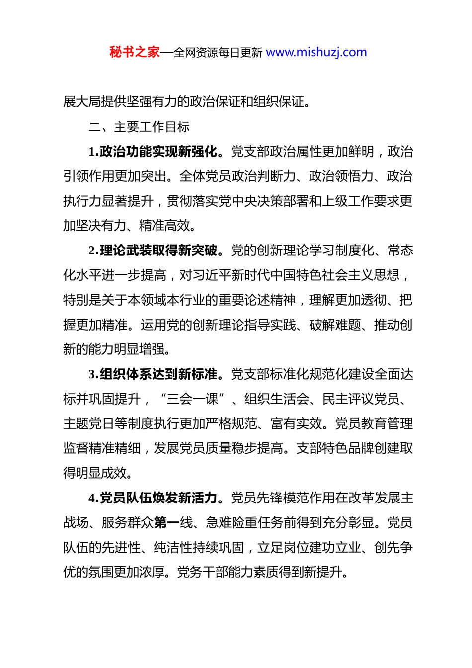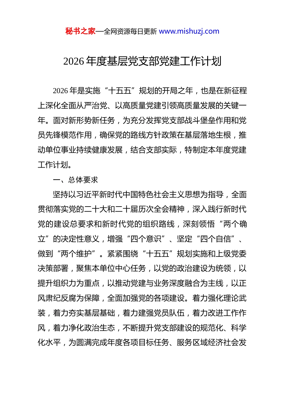 秘书之家—全网资源每日更新 www.mishuzj.com2026 年度基层党支部党建工作计划 2026 年是实施“十五五”规划的开局之年,也是在新征程上深化全面从严治党、以高质量党建引领高质量发展的关键一年。面对新形势新任务,为充分发挥党支部战斗堡垒作用和党员先锋模范作用,确保党的路线方针政策在基层落地生根,推动单位事业持续健康发展,结合支部实际,特制定本年度党建工作计划。一、总体要求坚持以习近平新时代中国特色社会主义思想为指导,全面贯彻落实党的二十大和二十届历次全会精神,深入践行新时代党的建设总要求和新时代党的组织路线,深刻领悟“两个确立”的决定性意义,增强“四个意识”、坚定“四个自信”、做到“两个维护”。紧紧围绕“十五五”规划实施和上级党委决策部署,聚焦本单位中心任务,以党的政治建设为统领,以提升组织力为重点,以推动党建与业务深度融合为主线,以正风肃纪反腐为保障,全面加强党的各项建设。着力强化理论武装,着力夯实基层基础,着力建强党员队伍,着力改进工作作风,着力净化政治生态,不断提升党支部建设的规范化、科学化水平,为圆满完成年度各项目标任务、服务区域经济社会发秘书之家—全网资源每日更新 www.mishuzj.com展大局提供坚强有力的政治保证和组织保证。二、主要工作目标1.政治功能实现新强化。党支部政治属性更加鲜明,政治引领作用更加突出。全体党员政治判断力、政治领悟力、政治执行力显著提升,贯彻落实党中央决策部署和上级工作要求更加坚决有力、精准高效。2.理论武装取得新突破。党的创新理论学习制度化、常态化水平进一步提高,对习近平新时代中国特色社会主义思想,特别是关于本领域本行业的重要论述精神,理解更加透彻、把握更加精准。运用党的创新理论指导实践、破解难题、推动创新的能力明显增强。3.组织体系达到新标准。党支部标准化规范化建设全面达标并巩固提升,“三会一课”、组织生活会、民主评议党员、主题党日等制度执行更加严格规范、富有实效。党员教育管理监督精准精细,发展党员质量稳步提高。支部特色品牌创建取得明显成效。4.党员队伍焕发新活力。党员先锋模范作用在改革发展主战场、服务群众第一线、急难险重任务前得到充分彰显。党员队伍的先进性、纯洁性持续巩固,立足岗位建功立业、创先争优的氛围更加浓厚。党务干部能力素质得到新提升。秘书之家—全网资源每日更新 www.mishuzj.com5.融合发展开创新格局。党建与业务工作同谋划、同部署、同落实、同考核的机制更加健全,融合载体更加丰富多样,融合成效更加务实显著。党建工作在引领方向、服务中心、建设队伍、凝聚人心方面的作用充分发挥。6.政治生态呈现新面貌。全面从严治党要求落实到支部“神经末梢”,党风廉政建设责任制压紧压实。纪律教育、廉政教育、警示教育深入开展,中央八项规定精神化风成俗,形式主义、官僚主义得到有效遏制,崇廉尚实、风清气正的良好政治生态持续优化。三、重点任务与实施举措(一)旗帜鲜明讲政治,持续筑牢对党忠诚的思想根基始终把党的政治建设摆在首位,教育引导全体党员不断提高政治站位,强化政治担当。1.严明政治纪律规矩。严格执行“第一议题”制度,及时跟进学习习近平总书记最新重要讲话、重要指示批示精神和党中央重大决策部署,确保学习传达及时准确、贯彻落实不折不扣。常态化开展政治纪律和政治规矩教育,引导党员干部深刻认识“两个确立”的决定性意义,自觉在思想上政治上行动上同以习近平同志为核心的党中央保持高度一致,坚决反对“七个有之”,做到“五个必须”。秘书之家—全网资源每日更新 www.mishuzj.com2.严肃党内政治生活。严格执行《关于新形势下党内政治生活的若干准则》,高质量开好民主生活会、组织生活会,认真落实“三会一课”、民主评议党员、谈心谈话等制度。用好批评和自我批评武器,增强党内政治生活的政治性、时代性、原则性、战斗性,让党员干部在严肃认真的党内政治生活中锤炼党性。3.提升政治能力素养。加强党员干部政治能力训练和实践锻炼,注重在贯彻落实上级决策部署、应对重大风险挑战、完成急难险重任务中考察识别干部的政治素质。建立重要工作落实督...