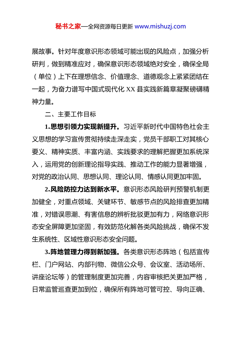秘书之家—全网资源每日更新 www.mishuzj.com2026 年度县局意识形态工作计划 2026 年是实施“十四五”规划的冲刺之年,也是谋划“十五五”发展的奠基之年,更是全面贯彻落实党的二十大及二十届历次全会精神、纵深推进中国式现代化县域实践的关键一年。面对新形势新任务新要求,意识形态领域面临的风险挑战更为复杂,做好意识形态工作意义重大、责任重大。为牢牢掌握意识形态工作领导权、管理权、话语权,巩固壮大奋进新时代的主流思想舆论,为全局高质量发展提供坚强思想保证和强大精神力量,结合工作实际,特制定本计划。一、总体要求坚持以习近平新时代中国特色社会主义思想为指导,全面贯彻落实党的二十大和二十届历次全会精神,深入学习贯彻习近平文化思想,深刻领悟“两个确立”的决定性意义,增强“四个意识”、坚定“四个自信”、做到“两个维护”。紧紧围绕举旗帜、聚民心、育新人、兴文化、展形象的使命任务,聚焦县委、县政府中心工作和局党组决策部署,以巩固壮大主流思想舆论为核心,以防范化解意识形态风险为重点,以落实意识形态工作责任制为抓手,着力强化理论武装,着力加强阵地管理,着力壮大主流舆论,着力培育时代新人,着力讲好发秘书之家—全网资源每日更新 www.mishuzj.com展故事。针对年度意识形态领域可能出现的风险点,加强分析研判,做到精准应对,确保意识形态领域绝对安全,确保全局(单位)上下在理想信念、价值理念、道德观念上紧紧团结在一起,为奋力谱写中国式现代化 XX 县实践新篇章凝聚磅礴精神力量。二、主要工作目标1.思想引领力实现新提升。习近平新时代中国特色社会主义思想的学习宣传贯彻持续走深走实,党员干部职工对其核心要义、精神实质、丰富内涵、实践要求的理解把握更加系统深入,运用党的创新理论指导实践、推动工作的能力显著增强,对党的政治认同、思想认同、理论认同、情感认同更加牢固。2.风险防控力达到新水平。意识形态风险研判预警机制更加健全,对重点领域、关键环节、敏感节点的风险排查更加精准,对错误思潮、有害信息的辨析批驳更加有力,网络意识形态安全屏障更加坚固,有效防范化解各类风险挑战,确保不发生系统性、区域性意识形态安全问题。3.阵地管理力得到新加强。各类意识形态阵地(包括宣传栏、门户网站、内部刊物、微信公众号、会议室、活动场所、讲座论坛等)的管理制度更加完善,内容审核把关更加严格,日常监管巡查更加到位,确保所有阵地可管可控、导向正确、秘书之家—全网资源每日更新 www.mishuzj.com内容健康。4.舆论引导力取得新成效。围绕中心、服务大局的新闻宣传和舆论引导工作更加主动有效,重大主题宣传、形势政策宣传、成就亮点宣传的声势更强、效果更佳。突发事件和热点敏感问题的舆论引导能力明显提升,及时回应社会关切,有效疏导公众情绪,牢牢掌握舆论主导权。5.价值塑造力展现新作为。社会主义核心价值观培育践行融入日常、抓在经常,先进典型选树宣传影响广泛,职业道德、社会公德、家庭美德、个人品德建设深入推进,单位内部文明创建活动扎实开展,干部职工思想道德素质和文明素养普遍提高。6.责任落实力形成新格局。意识形态工作责任制层层压实,党组织主体责任、书记第一责任人责任、班子成员“一岗双责”和职能部门具体责任清晰明确、落实到位。分析研判、督查考核、追责问责机制有效运行,形成齐抓共管、协同联动的工作合力。三、重点任务与实施举措(一)高举思想旗帜,持续深化党的创新理论武装坚持用习近平新时代中国特色社会主义思想统一思想、统一意志、统一行动,筑牢团结奋斗的共同思想基础。秘书之家—全网资源每日更新 www.mishuzj.com1.健全理论学习体系。严格落实“第一议题”制度,及时跟进学习习近平总书记最新重要讲话、重要指示批示精神和党中央重大决策部署。制定并落实年度理论学习中心组学习计划、党员干部职工理论学习安排,综合运用专题学习、辅导报告、研讨交流、个人自学、线上学习等多种形式,推动理论学习制度化、规范化、常态化。2.聚焦重点深化理解。持续深入学习党的二十大及历次全会精神,深刻把握中国式现代化的理论体系和实践要求。结合我县...