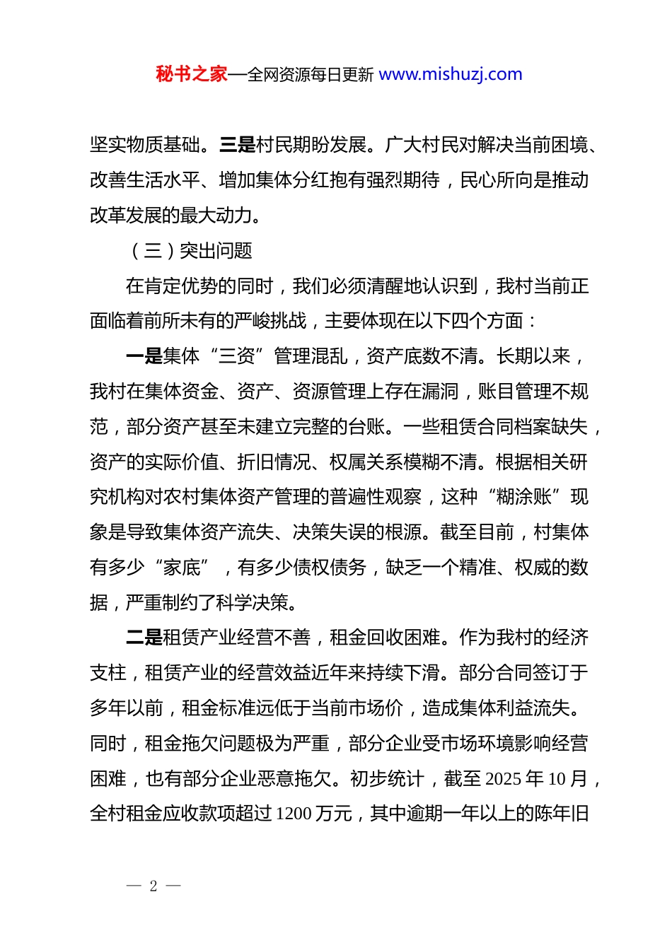 秘书之家—全网资源每日更新 www.mishuzj.comxx 村未来五年工作计划为全面贯彻落实乡村振兴战略,破解当前我村发展面临的突出矛盾和问题,推动村集体经济实现根本性好转和高质量发展,经村“两委”班子、*员和村民代表大会充分讨论,结合我村实际,特制定本工作计划,规划期限为 2026 年至 2030 年。一、基本情况与主要问题(一)村情概况xx 村位于 xx 镇中心区域,是全镇地域面积最大、人口最多的行政村。全村下辖 12 个村民小组,总户数约 2800 户,常住人口近 9000 人。我村地理位置优越,紧邻 xx 工业园区和 xx 城区,交通便利。多年来,依托区位优势,村集体经济逐步形成了以工业厂房、商业铺面、标准仓库等物业租赁为主导的产业模式。截至 2025 年 11 月,村集体名下共持有各类可租赁物业资产约 15 万平方米,是村集体收入和村民分红的主要来源。(二)发展优势一是区位优势明显。我村地处经济活跃地带,承接城区和工业区外溢的产业需求,租赁市场具有天然的稳定性和发展潜力。二是资产基础雄厚。经过多年积累,村集体形成了一批具有稳定价值的固定资产,这是我们走出困境、实现再次发展的— 1 —秘书之家—全网资源每日更新 www.mishuzj.com坚实物质基础。三是村民期盼发展。广大村民对解决当前困境、改善生活水平、增加集体分红抱有强烈期待,民心所向是推动改革发展的最大动力。(三)突出问题在肯定优势的同时,我们必须清醒地认识到,我村当前正面临着前所未有的严峻挑战,主要体现在以下四个方面:一是集体“三资”管理混乱,资产底数不清。长期以来,我村在集体资金、资产、资源管理上存在漏洞,账目管理不规范,部分资产甚至未建立完整的台账。一些租赁合同档案缺失,资产的实际价值、折旧情况、权属关系模糊不清。根据相关研究机构对农村集体资产管理的普遍性观察,这种“糊涂账”现象是导致集体资产流失、决策失误的根源。截至目前,村集体有多少“家底”,有多少债权债务,缺乏一个精准、权威的数据,严重制约了科学决策。二是租赁产业经营不善,租金回收困难。作为我村的经济支柱,租赁产业的经营效益近年来持续下滑。部分合同签订于多年以前,租金标准远低于当前市场价,造成集体利益流失。同时,租金拖欠问题极为严重,部分企业受市场环境影响经营困难,也有部分企业恶意拖欠。初步统计,截至 2025 年 10 月,全村租金应收款项超过 1200 万元,其中逾期一年以上的陈年旧— 2 —秘书之家—全网资源每日更新 www.mishuzj.com账占比高达 40%,租金回收率不足 60%,极大影响了村集体的现金流和正常运转。三是集体经济负债严重,财务风险高企。由于前期部分项目投资决策失误、管理成本高企以及大量租金无法收回,村集体财务状况持续恶化。为维持日常开支和支付银行贷款利息,村集体不得不举新债还旧债。截至 2025 年 10 月底,村集体各类负债总额已攀升至 4500 万元,资产负债率估算已超过 65%。沉重的债务负担不仅吞噬了大部分集体收入,也使我村失去了进一步发展的融资能力,财务状况已濒临“爆雷”边缘。四是基层治理能力不足,历史遗留问题多。当前村“两委”班子的管理方式和专业能力,已无法适应现代化的资产运营和复杂的经济纠纷处理。面对棘手的债务和法律问题,缺乏有效的应对策略和专业人才。同时,由于历史原因,部分不规范的合同和承诺导致了诸多矛盾纠纷,处理难度大,牵扯精力多,形成了恶性循环。二、指导思想、基本原则与发展目标(一)指导思想以**************思想为指导,全面贯彻*的二十大精神及历次全会精神和中央关于实施乡村振兴战略的决策部署,坚持把解决好“三资”问题作为总抓手。以加强基层*组织建设为引— 3 —秘书之家—全网资源每日更新 www.mishuzj.com领,以化解历史遗留问题为突破口,以盘活存量资产、实现产业升级为核心任务,彻底扭转我村集体经济的被动局面,建立权责清晰、管理科学、运营高效、监督有力的现代集体经济治理体系,不断增强村民的获得感、幸福感和安全感。(二)基本原则一是坚持*的领导,确保正确方向。把*的全面领导贯穿于工作计划实施的全过程,发挥村*组...