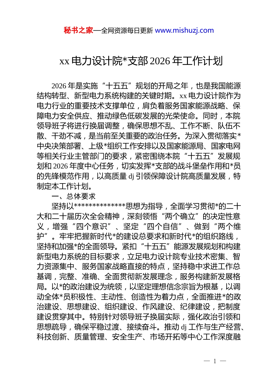 秘书之家—全网资源每日更新 www.mishuzj.comxx 电力设计院*支部 2026 年工作计划2026 年是实施“十五五”规划的开局之年,也是我国能源结构转型、新型电力系统构建的关键时期。xx 电力设计院作为电力行业的重要技术支撑单位,肩负着服务国家能源战略、保障电力安全供应、推动绿色低碳发展的光荣使命。同时,本院领导班子将进行换届调整,确保思想不乱、工作不断、队伍不散、干劲不减,是当前至关重要的政治任务。为深入贯彻落实*中央决策部署、上级*组织工作安排以及国家能源局、国家电网等相关行业主管部门的要求,紧密围绕本院“十五五”发展规划和 2026 年度中心任务,切实发挥*支部的战斗堡垒作用和*员的先锋模范作用,以高质量 dj 引领保障设计院高质量发展,特制定本工作计划。一、总体要求坚持以**************思想为指导,全面学习贯彻*的二十大和二十届历次全会精神,深刻领悟“两个确立”的决定性意义,增强“四个意识”、坚定“四个自信”、做到“两个维护”。牢牢把握新时代*的建设总要求和新时代*的组织路线,坚持和加强*的全面领导。紧扣“十五五”能源发展规划和构建新型电力系统的目标要求,立足电力设计院专业技术密集、智力资源集中、服务国家战略直接的特点,坚持稳中求进工作总基调,完整、准确、全面贯彻新发展理念,服务构建新发展格局。以*的政治建设为统领,以坚定理想信念宗旨为根基,以调动全体*员积极性、主动性、创造性为着力点,全面推进*的政治建设、思想建设、组织建设、作风建设、纪律建设,把制度建设贯穿其中。特别针对领导班子换届实际,强化政治引领和思想疏导,确保平稳过渡、接续奋斗。推动 dj 工作与生产经营、科技创新、质量管理、安全生产、市场开拓等中心工作深度融— 1 —秘书之家—全网资源每日更新 www.mishuzj.com合、同频共振,切实把 dj 优势转化为发展优势、创新优势、竞争优势,为把 xx 电力设计院建设成为国内领先、国际知名的能源电力工程咨询设计企业提供坚强政治保证和组织保证,为保障国家能源安全、推动能源绿色转型、助力实现“双碳”目标贡献智慧和力量。二、主要工作目标1.政治统领作用更加坚实。*支部的政治功能和组织功能显著增强,全体*员职工的政治判断力、政治领悟力、政治执行力持续提升。*中央关于能源电力发展的方针政策和上级*组织的决策部署在设计院得到不折不扣的贯彻落实,确保设计院改革发展始终沿着正确政治方向前进。2.思想理论武装更加深入。学习*的创新理论体系化、常态化机制进一步完善。*员干部职工对“十五五”时期能源电力发展形势任务、新型电力系统内涵特征、新质生产力在能源领域的实践要求等理解更加透彻,运用科学理论指导工程设计、技术攻关、管理创新的能力明显增强。3.组织体系建设更加规范。*支部标准化规范化建设水平全面提升,力争达到行业乃至地方示范*支部标准。圆满完成支部换届选举,产生一个政治强、业务精、作风正、结构优的新一届支部委员会。*的组织生活严肃认真、富有实效,“三会一课”、主题*日等质量进一步提高。结合电力设计业务特点,打造具有行业特色和院本特色的 dj 品牌。4.*员队伍活力更加充沛。*员教育管理监督制度有效落实,发展*员质量不断提高。*员在重大工程设计、关键技术研发、急难险重任务、海外项目开拓、安全生产保障中的先锋模范作用突出,涌现出一批标杆典型,形成一支忠诚干净担当、技术精湛、勇于创新的*员骨干队伍。5.dj 业务融合更加紧密。“围绕发展抓 dj,抓好 dj 促发展”的机制更加成熟定型。dj 工作有效嵌入重大项目全过程、— 2 —秘书之家—全网资源每日更新 www.mishuzj.com科技创新各环节、经营管理各方面,在服务国家重大战略工程、攻克“卡脖子”技术难题、提升勘察设计质量、拓展新兴业务市场中展现 dj 价值,形成一批可量化、可评估的融合成果。6.政治生态氛围更加清朗。全面从严治*主体责任和监督责任压紧压实,*风廉政建设向纵深发展。中央八项规定及其实施细则精神落地生根,形式主义、官僚主义等“四风”问题得到有效纠治。廉洁风险防控体系健全,廉洁文化建设深入人心,设计院风清气正、务实高...