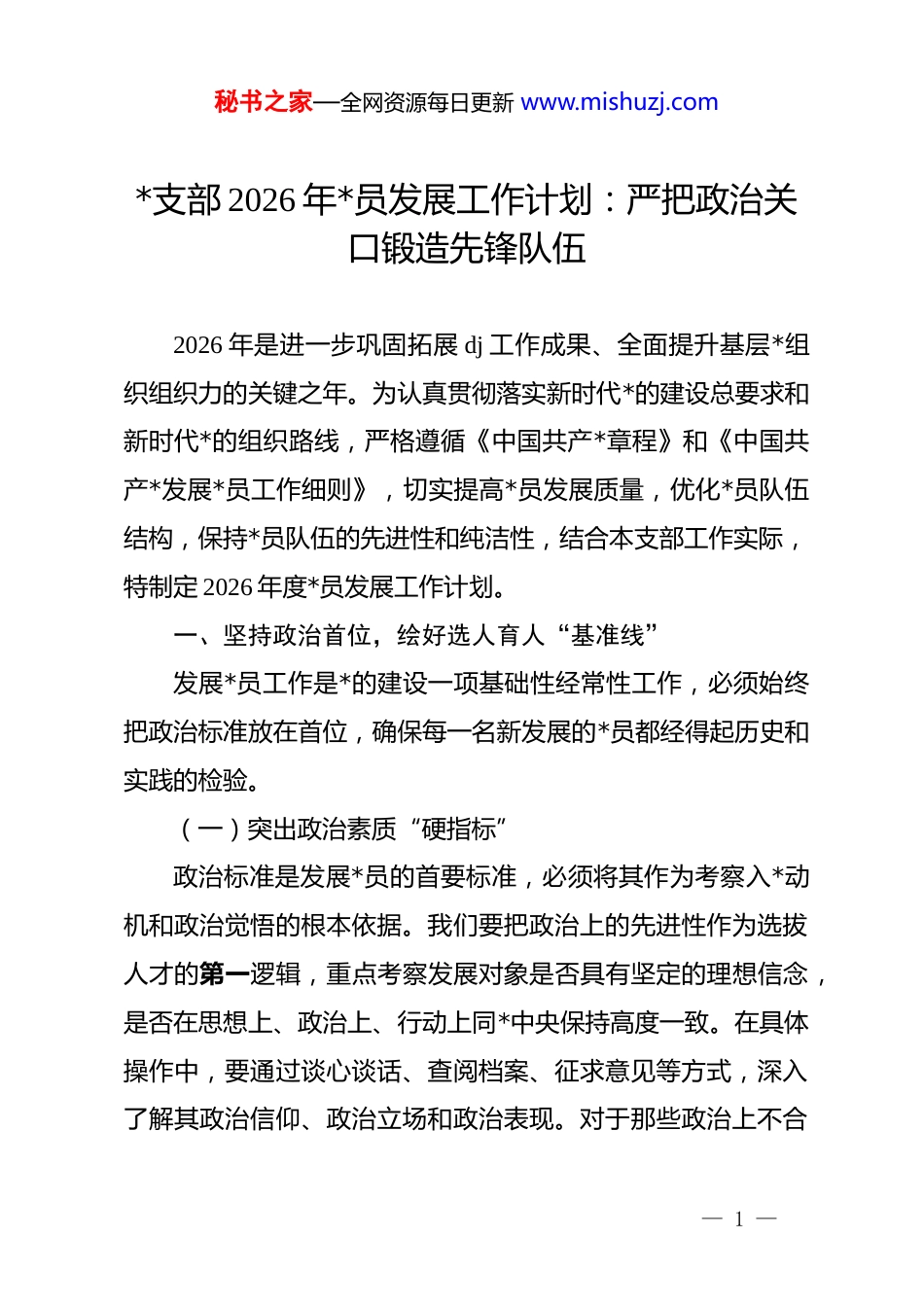 秘书之家—全网资源每日更新 www.mishuzj.com*支部 2026 年*员发展工作计划:严把政治关口锻造先锋队伍2026 年是进一步巩固拓展 dj 工作成果、全面提升基层*组织组织力的关键之年。为认真贯彻落实新时代*的建设总要求和新时代*的组织路线,严格遵循《中国共产*章程》和《中国共产*发展*员工作细则》,切实提高*员发展质量,优化*员队伍结构,保持*员队伍的先进性和纯洁性,结合本支部工作实际,特制定 2026 年度*员发展工作计划。一、坚持政治首位,绘好选人育人“基准线”发展*员工作是*的建设一项基础性经常性工作,必须始终把政治标准放在首位,确保每一名新发展的*员都经得起历史和实践的检验。(一)突出政治素质“硬指标”政治标准是发展*员的首要标准,必须将其作为考察入*动机和政治觉悟的根本依据。我们要把政治上的先进性作为选拔人才的第一逻辑,重点考察发展对象是否具有坚定的理想信念,是否在思想上、政治上、行动上同*中央保持高度一致。在具体操作中,要通过谈心谈话、查阅档案、征求意见等方式,深入了解其政治信仰、政治立场和政治表现。对于那些政治上不合— 1 —秘书之家—全网资源每日更新 www.mishuzj.com格、信仰上不坚定、动机上不纯粹的人,坚决实行“一票否决”,坚决防止“带病入*”,确保新发展的*员政治合格、信念过硬。(二)优化队伍结构“分布图”着眼于*的事业长远发展,必须统筹考量*员队伍的年龄、学历、性别和职业分布,实现队伍结构的科学化和合理化2026 年,我们将重点向生产工作第一线、高知识群体、青年人才和产业工人等领域倾斜,力争全年发展 35 岁以下青年*员比例达到 xx%以上,大专及以上学历人员比例达到 xx%以上。要注重从业务骨干、技术能手、先进模范中发现和培养苗子,改善*员队伍在各个岗位的分布状况,逐步解决*员队伍老化、结构单一等问题,形成老中青梯次配备、各行业广泛覆盖的生动局面。二、聚焦源头储备,通畅源头活水“蓄水池”问渠那得清如许,为有源头活水来。只有不断扩充入*积极分子队伍,才能优中选优,为*员队伍注入源源不断的新鲜血液。(一)拓宽吸纳人才“新渠道”改变过去“坐等上门”的被动局面,采取组织推荐、*员推荐、群团组织推优等多种方式,主动出击发现人才。我们将建立常态化的“双向培养”机制,即把业务骨干培养成*员,把*— 2 —秘书之家—全网资源每日更新 www.mishuzj.com员培养成业务骨干。支部委员要建立联系点,深入到各个班组、各个科室,善于发现那些在急难险重任务中表现突出的先进分子,及时进行引导和吸纳。特别是要关注那些在日常工作中默默奉献、群众基础好、业务能力强的“老黄牛”式职工,以及思想活跃、敢于创新的“拓荒牛”式青年,通过开展主题*日、志愿服务等活动,吸引他们向*组织靠拢,不断扩大入*积极分子的来源范围。(二)实行动态管理“记分册”建立健全入*积极分子动态管理机制,打破“一进定终身”的固化模式,保持队伍的生机与活力。我们将建立入*积极分子电子档案,实行“一人一档”,详细记录其思想汇报、参加培训、完成任务等情况。实施积分制管理,将政治表现、工作业绩、遵纪守法、群众评价等指标量化为具体分值,每季度进行一次评估,每半年进行一次调整。对于表现优秀、积分靠前的积极分子,列为重点培养对象;对于长期表现一般、入*动机不端正或主要精力不放在工作上的,及时调整出队伍,确保“蓄水池”里的水始终是“活水”,始终保持清澈。三、严格程序规范,架起制度执行“高压线”程序是正义的保障,严格履行入*手续是保证*员质量的重要环节。我们将以严谨的态度、严密的程序、严格的纪律,推— 3 —秘书之家—全网资源每日更新 www.mishuzj.com进发展*员工作规范化。(一)严守规定动作“流程图”严格按照申请入*、入*积极分子的确定和培养教育、发展对象的确定和考察、预备*员的接收、预备*员的教育考察和转正等 5 个阶段、25 个步骤进行操作。我们将制作《2026 年*员发展工作流程图》,挂图作战,对每一个环节都实行清单化管理,确保步骤一个不少、环节一个不漏、程序一步不错。特别是要严格落实公示制度,在确定入*积极分...
