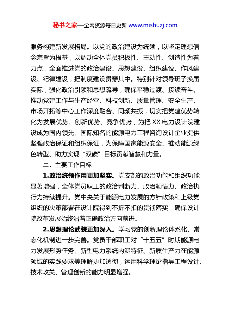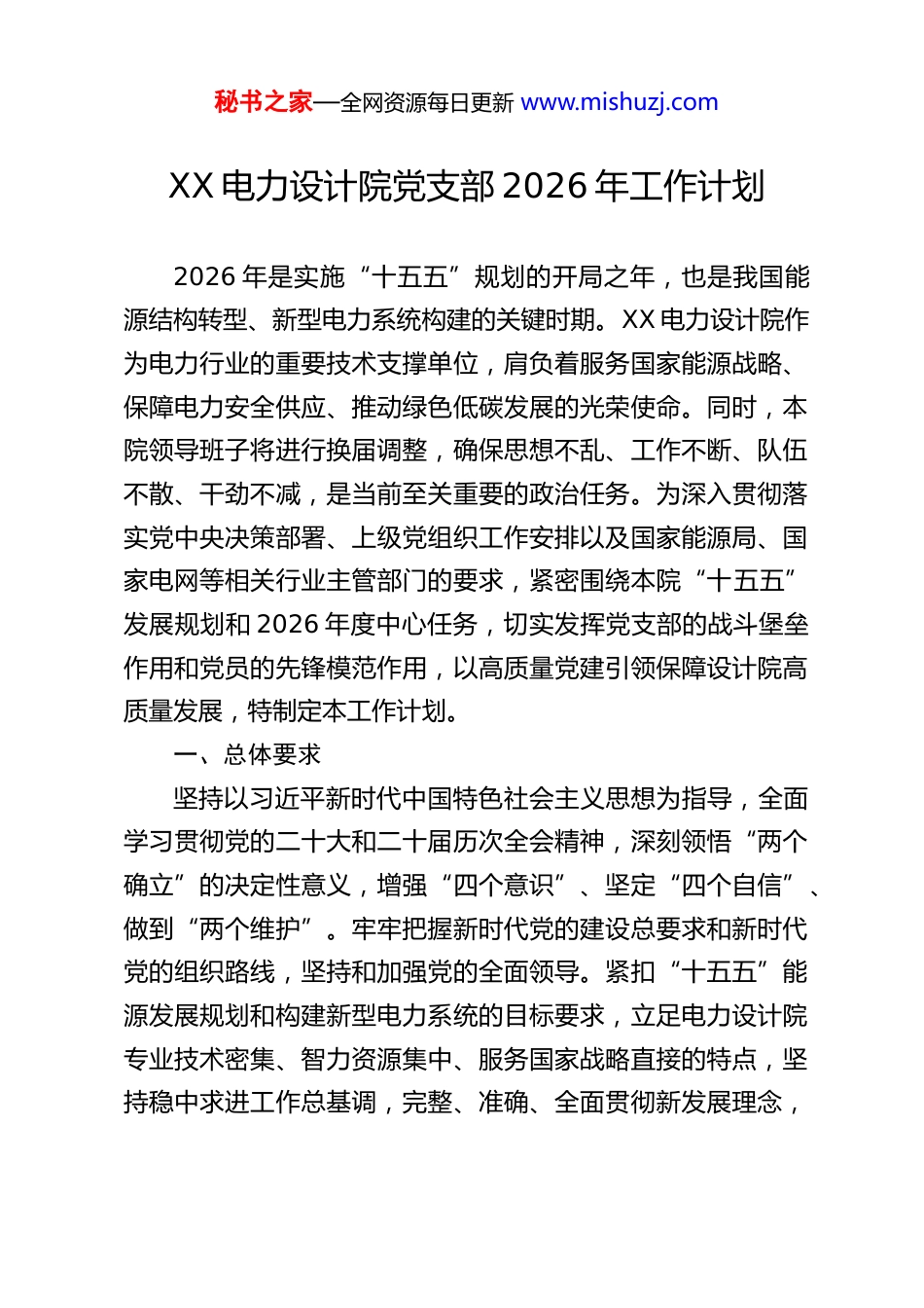 秘书之家—全网资源每日更新 www.mishuzj.comXX 电力设计院党支部 2026 年工作计划2026 年是实施“十五五”规划的开局之年,也是我国能源结构转型、新型电力系统构建的关键时期。XX 电力设计院作为电力行业的重要技术支撑单位,肩负着服务国家能源战略、保障电力安全供应、推动绿色低碳发展的光荣使命。同时,本院领导班子将进行换届调整,确保思想不乱、工作不断、队伍不散、干劲不减,是当前至关重要的政治任务。为深入贯彻落实党中央决策部署、上级党组织工作安排以及国家能源局、国家电网等相关行业主管部门的要求,紧密围绕本院“十五五”发展规划和 2026 年度中心任务,切实发挥党支部的战斗堡垒作用和党员的先锋模范作用,以高质量党建引领保障设计院高质量发展,特制定本工作计划。一、总体要求坚持以习近平新时代中国特色社会主义思想为指导,全面学习贯彻党的二十大和二十届历次全会精神,深刻领悟“两个确立”的决定性意义,增强“四个意识”、坚定“四个自信”、做到“两个维护”。牢牢把握新时代党的建设总要求和新时代党的组织路线,坚持和加强党的全面领导。紧扣“十五五”能源发展规划和构建新型电力系统的目标要求,立足电力设计院专业技术密集、智力资源集中、服务国家战略直接的特点,坚持稳中求进工作总基调,完整、准确、全面贯彻新发展理念,秘书之家—全网资源每日更新 www.mishuzj.com服务构建新发展格局。以党的政治建设为统领,以坚定理想信念宗旨为根基,以调动全体党员积极性、主动性、创造性为着力点,全面推进党的政治建设、思想建设、组织建设、作风建设、纪律建设,把制度建设贯穿其中。特别针对领导班子换届实际,强化政治引领和思想疏导,确保平稳过渡、接续奋斗。推动党建工作与生产经营、科技创新、质量管理、安全生产、市场开拓等中心工作深度融合、同频共振,切实把党建优势转化为发展优势、创新优势、竞争优势,为把 XX 电力设计院建设成为国内领先、国际知名的能源电力工程咨询设计企业提供坚强政治保证和组织保证,为保障国家能源安全、推动能源绿色转型、助力实现“双碳”目标贡献智慧和力量。二、主要工作目标1.政治统领作用更加坚实。党支部的政治功能和组织功能显著增强,全体党员职工的政治判断力、政治领悟力、政治执行力持续提升。党中央关于能源电力发展的方针政策和上级党组织的决策部署在设计院得到不折不扣的贯彻落实,确保设计院改革发展始终沿着正确政治方向前进。2.思想理论武装更加深入。学习党的创新理论体系化、常态化机制进一步完善。党员干部职工对“十五五”时期能源电力发展形势任务、新型电力系统内涵特征、新质生产力在能源领域的实践要求等理解更加透彻,运用科学理论指导工程设计、技术攻关、管理创新的能力明显增强。秘书之家—全网资源每日更新 www.mishuzj.com3.组织体系建设更加规范。党支部标准化规范化建设水平全面提升,力争达到行业乃至地方示范党支部标准。圆满完成支部换届选举,产生一个政治强、业务精、作风正、结构优的新一届支部委员会。党的组织生活严肃认真、富有实效,“三会一课”、主题党日等质量进一步提高。结合电力设计业务特点,打造具有行业特色和院本特色的党建品牌。4.党员队伍活力更加充沛。党员教育管理监督制度有效落实,发展党员质量不断提高。党员在重大工程设计、关键技术研发、急难险重任务、海外项目开拓、安全生产保障中的先锋模范作用突出,涌现出一批标杆典型,形成一支忠诚干净担当、技术精湛、勇于创新的党员骨干队伍。5.党建业务融合更加紧密。“围绕发展抓党建,抓好党建促发展”的机制更加成熟定型。党建工作有效嵌入重大项目全过程、科技创新各环节、经营管理各方面,在服务国家重大战略工程、攻克“卡脖子”技术难题、提升勘察设计质量、拓展新兴业务市场中展现党建价值,形成一批可量化、可评估的融合成果。6.政治生态氛围更加清朗。全面从严治党主体责任和监督责任压紧压实,党风廉政建设向纵深发展。中央八项规定及其实施细则精神落地生根,形式主义、官僚主义等“四风”问题得到有效纠治。廉洁风险防控体系健全,廉洁文化建设深入人心,设计院风...