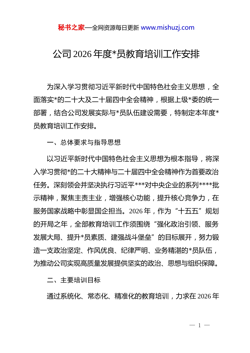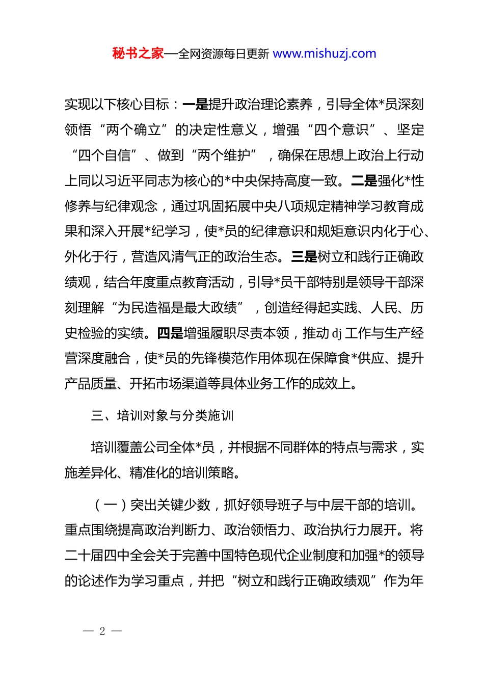 秘书之家—全网资源每日更新 www.mishuzj.com公司 2026 年度*员教育培训工作安排为深入学习贯彻习近平新时代中国特色社会主义思想,全面落实*的二十大及二十届四中全会精神,根据上级*委的统一部署,结合公司发展实际与*员队伍建设需要,特制定本年度*员教育培训工作安排。一、总体要求与指导思想以习近平新时代中国特色社会主义思想为根本指导,将深入学习贯彻*的二十大精神与二十届四中全会精神作为首要政治任务。深刻领会并坚决执行习近平***对中央企业的系列****批示精神,聚焦主责主业,增强核心功能,提升核心竞争力,在服务国家战略中彰显国企担当。2026 年,作为“十五五”规划的开局之年,全部教育培训工作须围绕“强化政治引领、服务发展大局、提升*员素质、建强战斗堡垒”的目标展开,努力锻造一支政治坚定、作风优良、纪律严明、业务精湛的*员队伍,为推动公司实现高质量发展提供坚实的政治、思想与组织保障。二、主要培训目标通过系统化、常态化、精准化的教育培训,力求在 2026 年— 1 —秘书之家—全网资源每日更新 www.mishuzj.com实现以下核心目标:一是提升政治理论素养,引导全体*员深刻领悟“两个确立”的决定性意义,增强“四个意识”、坚定“四个自信”、做到“两个维护”,确保在思想上政治上行动上同以习近平同志为核心的*中央保持高度一致。二是强化*性修养与纪律观念,通过巩固拓展中央八项规定精神学习教育成果和深入开展*纪学习,使*员的纪律意识和规矩意识内化于心、外化于行,营造风清气正的政治生态。三是树立和践行正确政绩观,结合年度重点教育活动,引导*员干部特别是领导干部深刻理解“为民造福是最大政绩”,创造经得起实践、人民、历史检验的实绩。四是增强履职尽责本领,推动 dj 工作与生产经营深度融合,使*员的先锋模范作用体现在保障食*供应、提升产品质量、开拓市场渠道等具体业务工作的成效上。三、培训对象与分类施训培训覆盖公司全体*员,并根据不同群体的特点与需求,实施差异化、精准化的培训策略。(一)突出关键少数,抓好领导班子与中层干部的培训。重点围绕提高政治判断力、政治领悟力、政治执行力展开。将二十届四中全会关于完善中国特色现代企业制度和加强*的领导的论述作为学习重点,并把“树立和践行正确政绩观”作为年— 2 —秘书之家—全网资源每日更新 www.mishuzj.com度专题教育的核心内容通过理论中心组学习、专题研讨、案例教学等方式,引导领导干部正确处理当前与长远、局部与全局的关系,科学决策,务实作为。(二)夯实骨干力量,加强*务工作干部的专业培训。组织*务干部系统学习 dj 理论、*内法规和实务操作知识,着重提升其组织“三会一课”、开展主题*日、做好*员发展与教育管理工作的专业能力。邀请上级*组织或专业机构的专家进行授课,分享 dj 工作创新经验,推动公司 dj 工作制度化、规范化、科学化水平迈上新台阶。(三)筑牢后备基础,做好青年*员与新发展*员的培养教育。针对新*员,系统开展入*启蒙和*性教育,组织学习*章*规*纪,参观红色教育基地,引导其坚定理想信念,扣好“第一粒扣子”。对于青年*员,则侧重于思想淬炼和实践锻炼,鼓励其在急难险重任务中担当作为,将个人成长融入公司发展蓝图。四、核心培训内容本年度培训内容将紧扣时代要求与公司实际,突出政治性、理论性与实践性的有机统一。(一)深化*的创新理论武装。将学习习近平新时代中国特— 3 —秘书之家—全网资源每日更新 www.mishuzj.com色社会主义思想作为贯穿全年的主线。重点组织学习*的二十届四中全会公报及其精神解读,深刻把握“十五五”时期国资国企改革发展的宏观部署与战略要求。同时,建立学习贯彻习近平***对中央企业****批示精神的长效机制,定期组织专题学习研讨,对照指示精神检查公司战略规划、业务布局与改革举措,确保***的****在公司不折不扣得到落实。(二)聚焦树立和践行正确政绩观学习教育。按照中央统一部署,将此项学习教育作为年度重点任务抓实抓好。组织全体*员干部深入学习习近平***关于正确政绩观的重要论述,围绕“政绩为谁而树、树什么样的政绩、靠什么树政绩”等根本问题...
