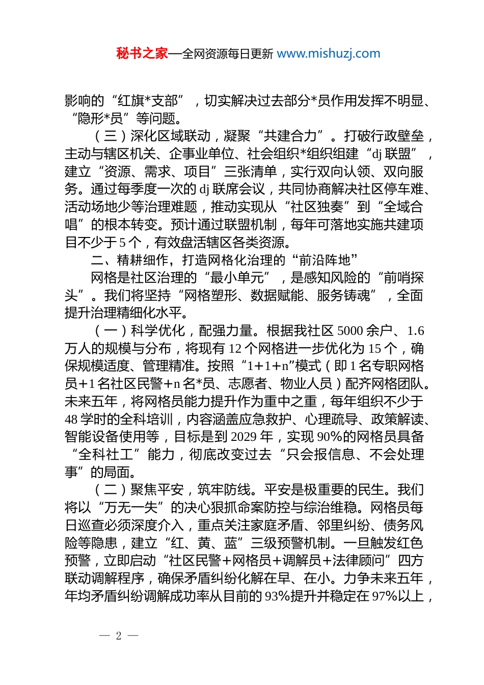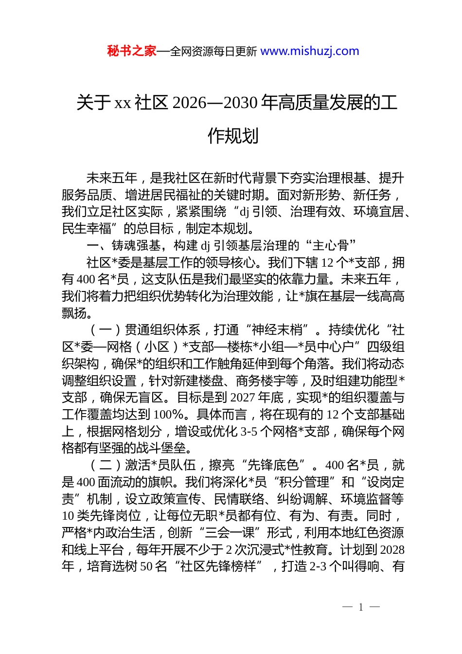 秘书之家—全网资源每日更新 www.mishuzj.com关于 xx 社区 2026—2030 年高质量发展的工作规划未来五年,是我社区在新时代背景下夯实治理根基、提升服务品质、增进居民福祉的关键时期。面对新形势、新任务,我们立足社区实际,紧紧围绕“dj 引领、治理有效、环境宜居、民生幸福”的总目标,制定本规划。一、铸魂强基,构建 dj 引领基层治理的“主心骨”社区*委是基层工作的领导核心。我们下辖 12 个*支部,拥有 400 名*员,这支队伍是我们最坚实的依靠力量。未来五年,我们将着力把组织优势转化为治理效能,让*旗在基层一线高高飘扬。(一)贯通组织体系,打通“神经末梢”。持续优化“社区*委—网格(小区)*支部—楼栋*小组—*员中心户”四级组织架构,确保*的组织和工作触角延伸到每个角落。我们将动态调整组织设置,针对新建楼盘、商务楼宇等,及时组建功能型*支部,确保无盲区。目标是到 2027 年底,实现*的组织覆盖与工作覆盖均达到 100%。具体而言,将在现有的 12 个支部基础上,根据网格划分,增设或优化 3-5 个网格*支部,确保每个网格都有坚强的战斗堡垒。(二)激活*员队伍,擦亮“先锋底色”。400 名*员,就是 400 面流动的旗帜。我们将深化*员“积分管理”和“设岗定责”机制,设立政策宣传、民情联络、纠纷调解、环境监督等10 类先锋岗位,让每位无职*员都有位、有为、有责。同时,严格*内政治生活,创新“三会一课”形式,利用本地红色资源和线上平台,每年开展不少于 2 次沉浸式*性教育。计划到 2028年,培育选树 50 名“社区先锋榜样”,打造 2-3 个叫得响、有— 1 —秘书之家—全网资源每日更新 www.mishuzj.com影响的“红旗*支部”,切实解决过去部分*员作用发挥不明显、“隐形*员”等问题。(三)深化区域联动,凝聚“共建合力”。打破行政壁垒,主动与辖区机关、企事业单位、社会组织*组织组建“dj 联盟”,建立“资源、需求、项目”三张清单,实行双向认领、双向服务。通过每季度一次的 dj 联席会议,共同协商解决社区停车难、活动场地少等治理难题,推动实现从“社区独奏”到“全域合唱”的根本转变。预计通过联盟机制,每年可落地实施共建项目不少于 5 个,有效盘活辖区各类资源。二、精耕细作,打造网格化治理的“前沿阵地”网格是社区治理的“最小单元”,是感知风险的“前哨探头”。我们将坚持“网格塑形、数据赋能、服务铸魂”,全面提升治理精细化水平。(一)科学优化,配强力量。根据我社区 5000 余户、1.6万人的规模与分布,将现有 12 个网格进一步优化为 15 个,确保规模适度、管理精准。按照“1+1+n”模式(即 1 名专职网格员+1 名社区民警+n 名*员、志愿者、物业人员)配齐网格团队。未来五年,将网格员能力提升作为重中之重,每年组织不少于48 学时的全科培训,内容涵盖应急救护、心理疏导、政策解读、智能设备使用等,目标是到 2029 年,实现 90%的网格员具备“全科社工”能力,彻底改变过去“只会报信息、不会处理事”的局面。(二)聚焦平安,筑牢防线。平安是极重要的民生。我们将以“万无一失”的决心狠抓命案防控与综治维稳。网格员每日巡查必须深度介入,重点关注家庭矛盾、邻里纠纷、债务风险等隐患,建立“红、黄、蓝”三级预警机制。一旦触发红色预警,立即启动“社区民警+网格员+调解员+法律顾问”四方联动调解程序,确保矛盾纠纷化解在早、在小。力争未来五年,年均矛盾纠纷调解成功率从目前的 93%提升并稳定在 97%以上,— 2 —秘书之家—全网资源每日更新 www.mishuzj.com力争实现“民转刑”案件零发生。对于信访维稳,变“被动接访”为“主动寻访”,网格员每周安排固定时间走访重点人员,用真情化解心结,用法治解决诉求,确保“小事不出网格,大事不出社区”。(三)数字赋能,智慧运行。计划于 2026 年底,全面升级现有系统,建成“xx 社区智慧治理平台”,整合人口、房屋、事件、组织等要素,实现“一图感知、一网统管”。网格员通过专用 app 可实现事件“发现—上报—处置—反馈—评价”线上闭环管理。此举预计将使事件平均处置时长从目前的 72 小时缩...