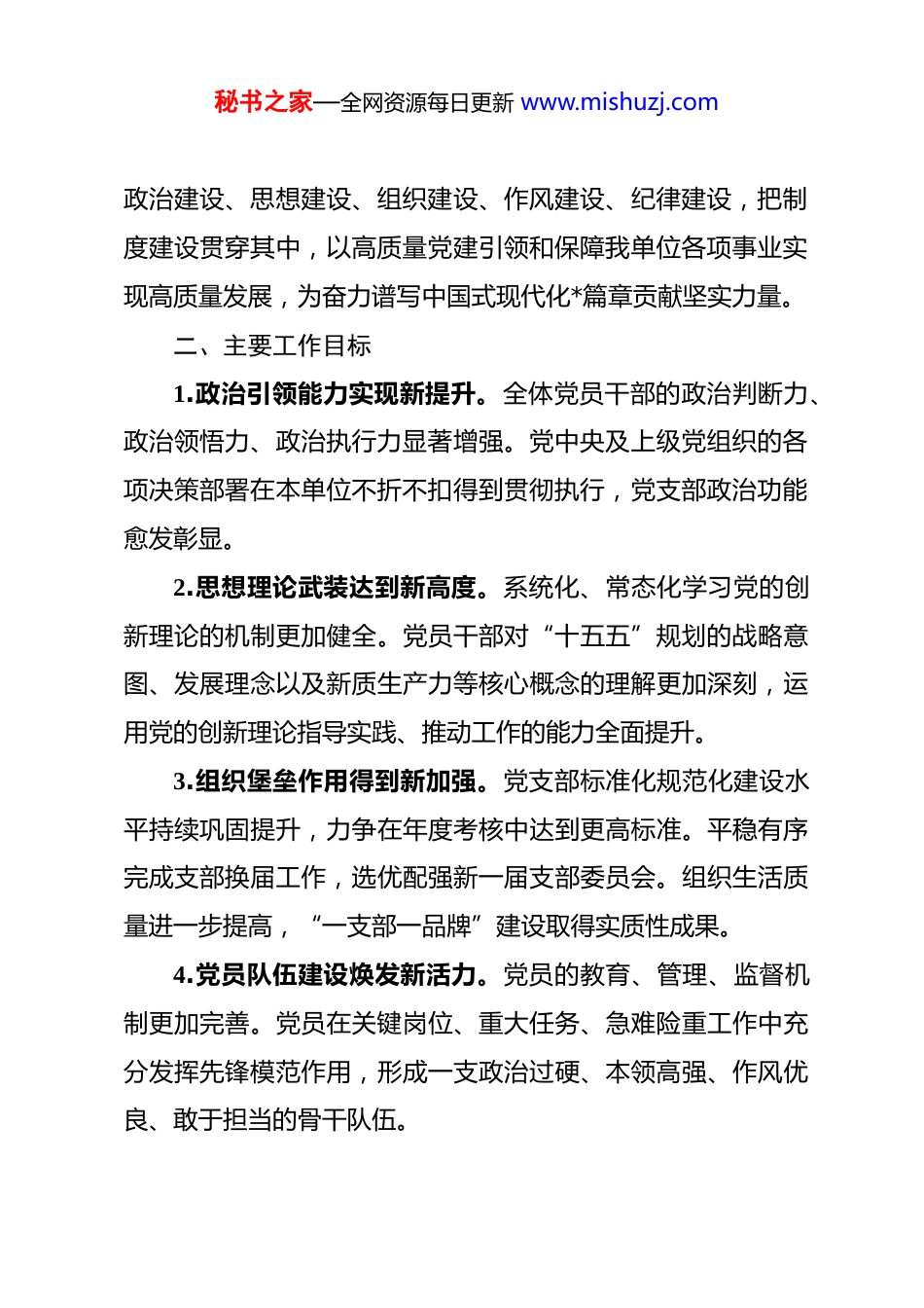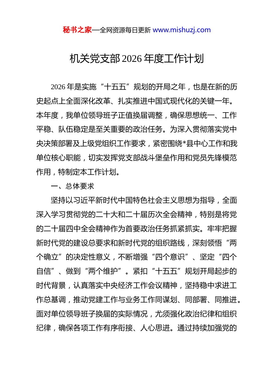 秘书之家—全网资源每日更新 www.mishuzj.com机关党支部 2026 年度工作计划 2026 年是实施“十五五”规划的开局之年,也是在新的历史起点上全面深化改革、扎实推进中国式现代化的关键一年。本年度,我单位领导班子正值换届调整,确保思想统一、工作平稳、队伍稳定是至关重要的政治任务。为深入贯彻落实党中央决策部署及上级党组织工作要求,紧密围绕*县中心工作和我单位核心职能,切实发挥党支部战斗堡垒作用和党员先锋模范作用,特制定本工作计划。一、总体要求坚持以习近平新时代中国特色社会主义思想为指导,全面深入学习贯彻党的二十大和二十届历次全会精神,特别是将党的二十届四中全会精神作为首要政治任务抓紧抓实。牢牢把握新时代党的建设总要求和新时代党的组织路线,深刻领悟“两个确立”的决定性意义,不断增强“四个意识”、坚定“四个自信”、做到“两个维护”。紧扣“十五五”规划开局起步的时代背景,认真落实中央经济工作会议精神,坚持稳中求进工作总基调,推动党建工作与业务工作同谋划、同部署、同推进。面对单位领导班子换届的实际情况,尤须强化政治纪律和组织纪律,确保各项工作有序衔接、人心思进。通过持续加强党的秘书之家—全网资源每日更新 www.mishuzj.com政治建设、思想建设、组织建设、作风建设、纪律建设,把制度建设贯穿其中,以高质量党建引领和保障我单位各项事业实现高质量发展,为奋力谱写中国式现代化*篇章贡献坚实力量。二、主要工作目标1.政治引领能力实现新提升。全体党员干部的政治判断力、政治领悟力、政治执行力显著增强。党中央及上级党组织的各项决策部署在本单位不折不扣得到贯彻执行,党支部政治功能愈发彰显。2.思想理论武装达到新高度。系统化、常态化学习党的创新理论的机制更加健全。党员干部对“十五五”规划的战略意图、发展理念以及新质生产力等核心概念的理解更加深刻,运用党的创新理论指导实践、推动工作的能力全面提升。3.组织堡垒作用得到新加强。党支部标准化规范化建设水平持续巩固提升,力争在年度考核中达到更高标准。平稳有序完成支部换届工作,选优配强新一届支部委员会。组织生活质量进一步提高,“一支部一品牌”建设取得实质性成果。4.党员队伍建设焕发新活力。党员的教育、管理、监督机制更加完善。党员在关键岗位、重大任务、急难险重工作中充分发挥先锋模范作用,形成一支政治过硬、本领高强、作风优良、敢于担当的骨干队伍。秘书之家—全网资源每日更新 www.mishuzj.com5.党建业务融合开创新局面。党建工作与业务工作深度融合的路径更加清晰、机制更加顺畅。党建工作有效服务于*县域经济社会发展大局,特别是在优化营商环境、服务重大项目等方面取得可检验的成效。6.政治生态建设呈现新气象。党风廉政建设责任制全面落实,廉洁文化深入人心。严格执行中央八项规定及其实施细则精神,坚决纠治“四风”问题,营造风清气正、干事创业的良好政治生态。三、重点任务与实施举措(一)聚焦政治建设,铸就绝对忠诚的政治品格。始终将党的政治建设摆在首位,教育引导全体党员干部旗帜鲜明讲政治。严格执行“第一议题”制度,第一时间传达学习习近平总书记最新重要讲话和重要指示批示精神。系统组织学习党的二十届四中全会和中央经济工作会议精神,引导党员干部准确把握党中央对当前形势的科学判断和对未来工作的战略部署。结合单位领导班子换届工作,开展严肃认真的政治纪律和组织纪律教育,强化规矩意识,严格执行重大事项请示报告制度,确保平稳过渡、风清气正。建立上级重大决策部署落实台账,实行清单化管理、项目化推进,定期开展“回头看”,确保政令畅通、执行有力。秘书之家—全网资源每日更新 www.mishuzj.com(二)深化理论武装,凝聚团结奋斗的思想共识。巩固拓展学习教育成果,建立理论学习长效机制。创新构建“班子带头领学、专家辅导讲学、党支部书记讲党课、党员研讨促学、立足岗位践学”的“五学联动”学习体系。围绕“十五五”规划宏伟蓝图,组织开展专题学习和系列解读,使全体党员深刻理解中国式现代化的理论体系与实践要求,准确把握发展新质生产力的核心要义和方法路径,切实把学习...