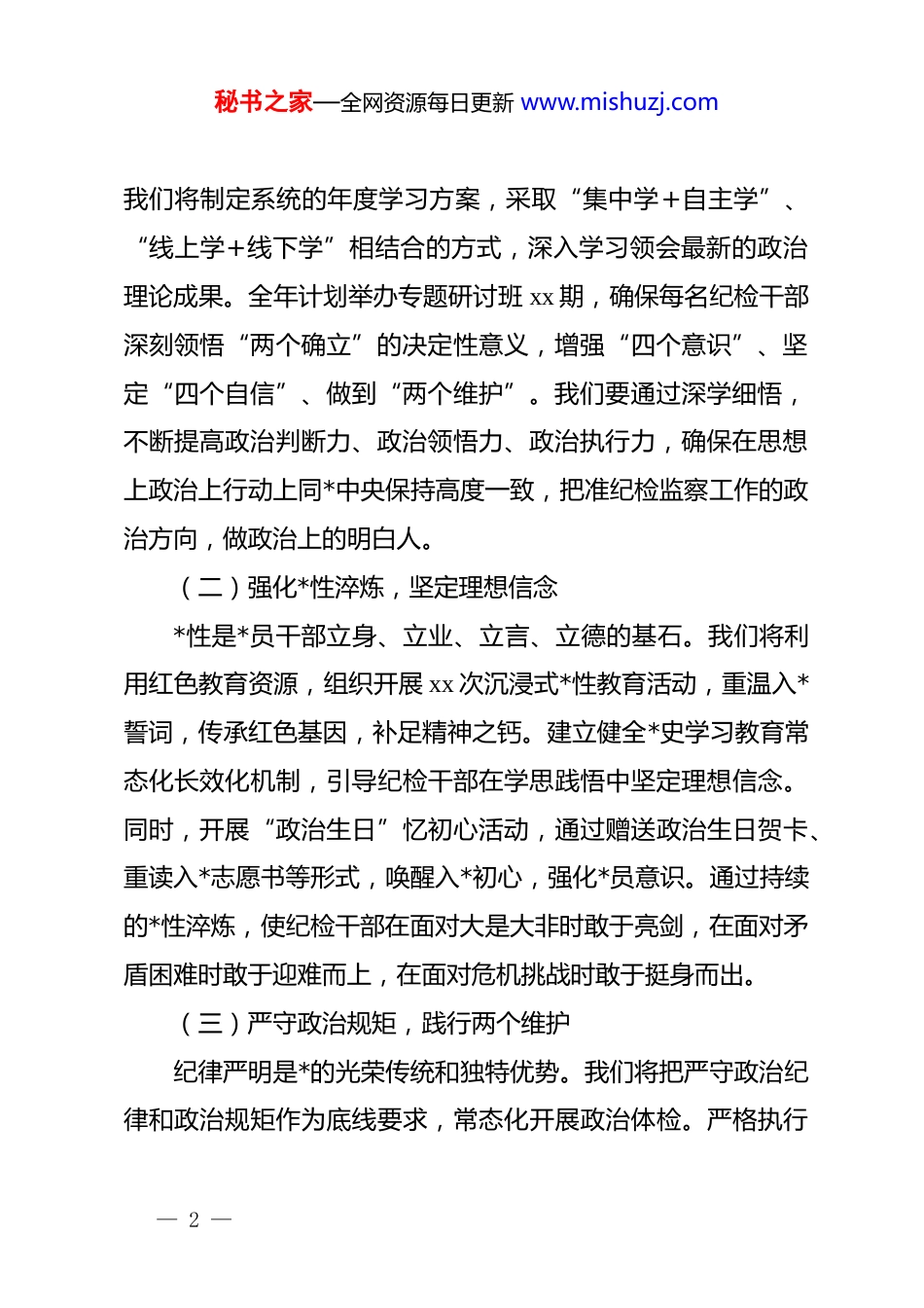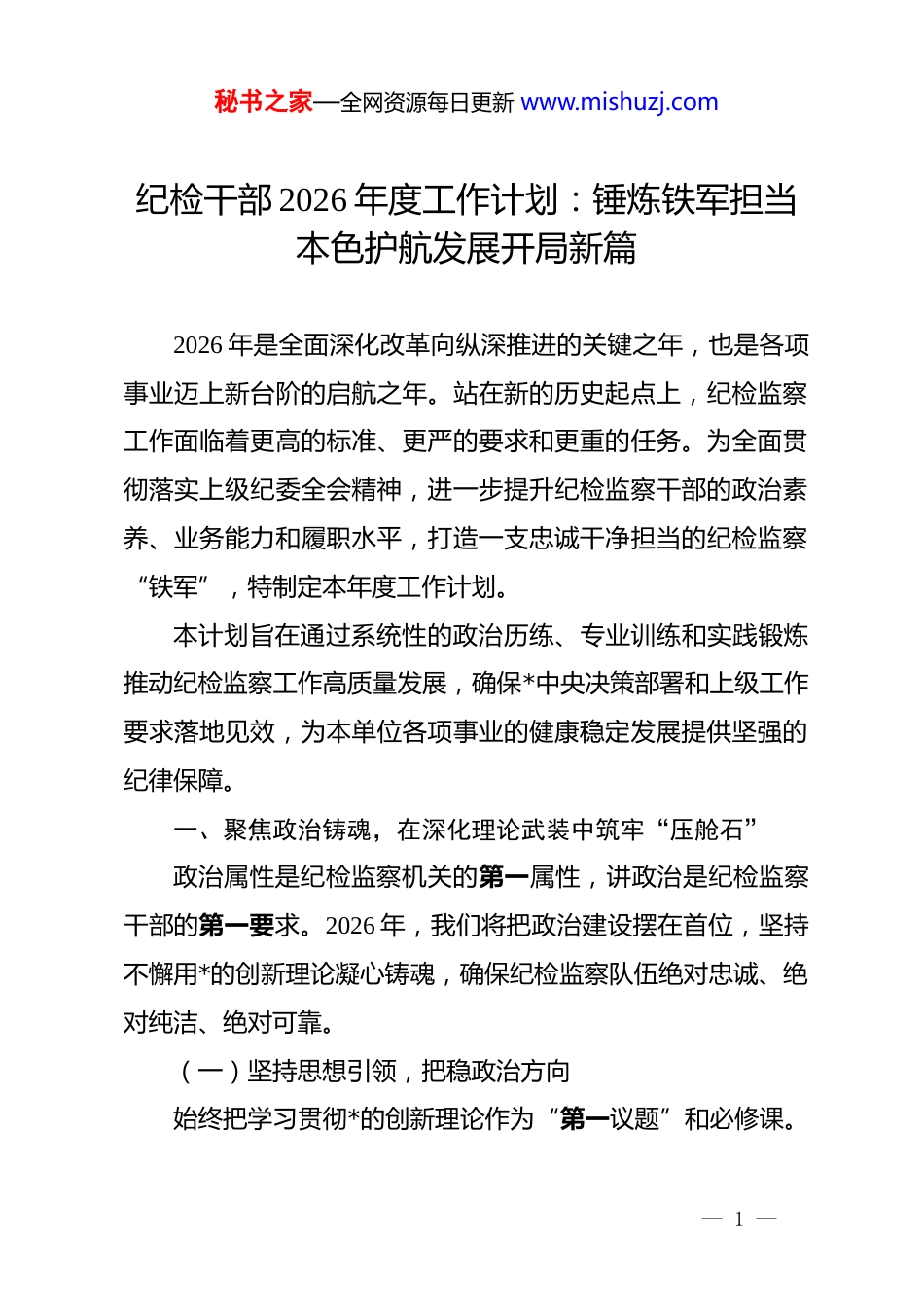 秘书之家—全网资源每日更新 www.mishuzj.com纪检干部 2026 年度工作计划:锤炼铁军担当本色护航发展开局新篇2026 年是全面深化改革向纵深推进的关键之年,也是各项事业迈上新台阶的启航之年。站在新的历史起点上,纪检监察工作面临着更高的标准、更严的要求和更重的任务。为全面贯彻落实上级纪委全会精神,进一步提升纪检监察干部的政治素养、业务能力和履职水平,打造一支忠诚干净担当的纪检监察“铁军”,特制定本年度工作计划。本计划旨在通过系统性的政治历练、专业训练和实践锻炼推动纪检监察工作高质量发展,确保*中央决策部署和上级工作要求落地见效,为本单位各项事业的健康稳定发展提供坚强的纪律保障。一、聚焦政治铸魂,在深化理论武装中筑牢“压舱石”政治属性是纪检监察机关的第一属性,讲政治是纪检监察干部的第一要求。2026 年,我们将把政治建设摆在首位,坚持不懈用*的创新理论凝心铸魂,确保纪检监察队伍绝对忠诚、绝对纯洁、绝对可靠。(一)坚持思想引领,把稳政治方向始终把学习贯彻*的创新理论作为“第一议题”和必修课。— 1 —秘书之家—全网资源每日更新 www.mishuzj.com我们将制定系统的年度学习方案,采取“集中学+自主学”、“线上学+线下学”相结合的方式,深入学习领会最新的政治理论成果。全年计划举办专题研讨班 xx 期,确保每名纪检干部深刻领悟“两个确立”的决定性意义,增强“四个意识”、坚定“四个自信”、做到“两个维护”。我们要通过深学细悟,不断提高政治判断力、政治领悟力、政治执行力,确保在思想上政治上行动上同*中央保持高度一致,把准纪检监察工作的政治方向,做政治上的明白人。(二)强化*性淬炼,坚定理想信念*性是*员干部立身、立业、立言、立德的基石。我们将利用红色教育资源,组织开展 xx 次沉浸式*性教育活动,重温入*誓词,传承红色基因,补足精神之钙。建立健全*史学习教育常态化长效化机制,引导纪检干部在学思践悟中坚定理想信念。同时,开展“政治生日”忆初心活动,通过赠送政治生日贺卡、重读入*志愿书等形式,唤醒入*初心,强化*员意识。通过持续的*性淬炼,使纪检干部在面对大是大非时敢于亮剑,在面对矛盾困难时敢于迎难而上,在面对危机挑战时敢于挺身而出。(三)严守政治规矩,践行两个维护纪律严明是*的光荣传统和独特优势。我们将把严守政治纪律和政治规矩作为底线要求,常态化开展政治体检。严格执行— 2 —秘书之家—全网资源每日更新 www.mishuzj.com重大事项请示报告制度,坚决防止“七个有之”,做到“五个必须”。加强对*章*规 dj 执行情况的监督检查,督促全体纪检干部时刻绷紧政治纪律这根弦,自觉规范言行。我们将把践行“两个维护”体现在实际行动上,落实到每一次监督执纪问责的具体工作中,确保*中央政令畅通,确保上级决策部署不折不扣落实到位,以实际行动诠释对*的绝对忠诚。二、聚焦监督执纪,在服务中心大局中磨砺“杀手锏”监督是纪检监察机关的基本职责、第一职责。2026 年,我们将紧紧围绕中心、服务大局,不断创新监督方式,提升监督质效,充分发挥监督保障执行、促进完善发展作用,确保重大决策部署落地生根。(一)紧盯关键少数,实施精准监督加强对“一把手”和领导班子的监督是监督工作的重中之重。我们将制定并实施《关于加强对“一把手”和领导班子监督的实施细则》,通过列席重要会议、查阅资料、谈心谈话等方式,重点监督其贯彻执行民主集中制、依规依法履职用权、落实全面从严治*主体责任等情况。建立健全廉政档案,实行动态更新管理,精准“画像”,及时发现和纠正苗头性、倾向性问题。我们要在监督的深度和精度上下功夫,既要敢于监督,又要善于监督,督促“关键少数”严于律己、严负其责、严管— 3 —秘书之家—全网资源每日更新 www.mishuzj.com所辖,发挥好“头雁效应”。(二)围绕重点领域,深化专项治理重点领域往往是腐败易发多发的高风险区。我们将紧盯工程建设、物资采购、选人用人、财务管理等关键环节和重点领域,开展 xx 项专项治理行动。深入排查廉政风险点,制定防控措施,堵塞制度漏洞。针对群众反映强烈的突出问题,开展“点...