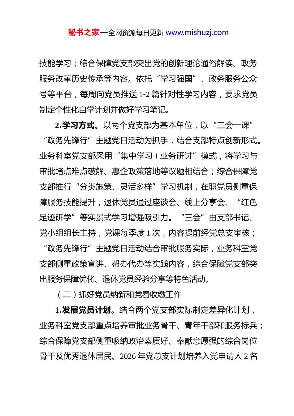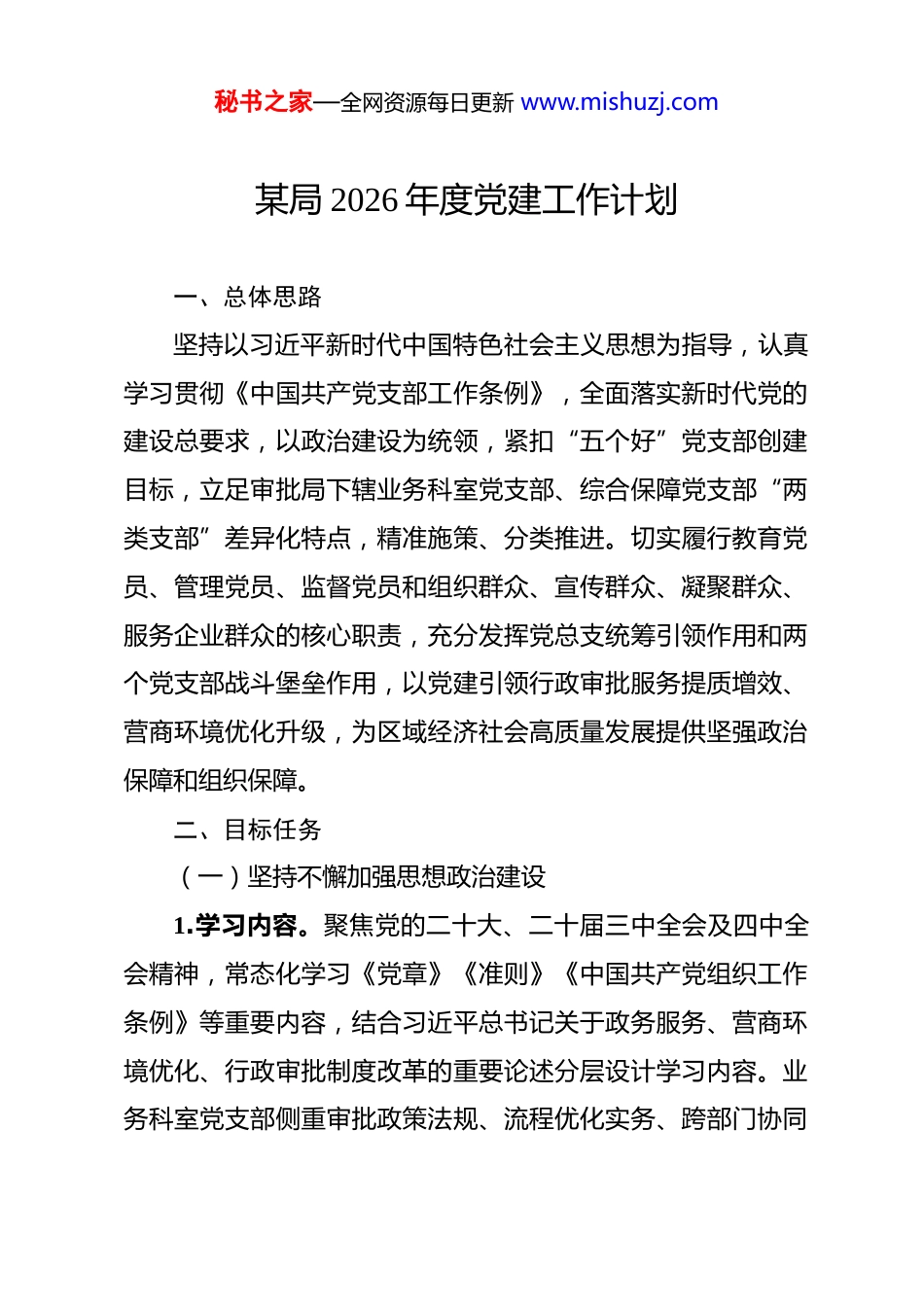 秘书之家—全网资源每日更新 www.mishuzj.com某局 2026 年度党建工作计划 一、总体思路坚持以习近平新时代中国特色社会主义思想为指导,认真学习贯彻《中国共产党支部工作条例》,全面落实新时代党的建设总要求,以政治建设为统领,紧扣“五个好”党支部创建目标,立足审批局下辖业务科室党支部、综合保障党支部“两类支部”差异化特点,精准施策、分类推进。切实履行教育党员、管理党员、监督党员和组织群众、宣传群众、凝聚群众、服务企业群众的核心职责,充分发挥党总支统筹引领作用和两个党支部战斗堡垒作用,以党建引领行政审批服务提质增效、营商环境优化升级,为区域经济社会高质量发展提供坚强政治保障和组织保障。二、目标任务(一)坚持不懈加强思想政治建设1.学习内容。聚焦党的二十大、二十届三中全会及四中全会精神,常态化学习《党章》《准则》《中国共产党组织工作条例》等重要内容,结合习近平总书记关于政务服务、营商环境优化、行政审批制度改革的重要论述分层设计学习内容。业务科室党支部侧重审批政策法规、流程优化实务、跨部门协同秘书之家—全网资源每日更新 www.mishuzj.com技能学习;综合保障党支部突出党的创新理论通俗解读、政务服务改革历史传承等内容。依托“学习强国”、政务服务公众号等平台,每周向党员推送 1-2 篇针对性学习内容,要求党员制定个性化自学计划并做好学习笔记。2.学习方式。以两个党支部为基本单位,以“三会一课”“政务先锋行”主题党日活动为抓手,结合支部特点创新形式。业务科室党支部采用“集中学习+业务研讨”模式,将学习与审批堵点难点破解、惠企政策落地等议题相结合;综合保障党支部推行“分类施策、灵活多样”学习机制,在职党员侧重保障服务技能提升,退休党员通过座谈会、线上分享会、“红色足迹研学”等实景式学习增强吸引力。“三会”由支部书记、党小组组长主持,党课每季度 1 次,内容提前经党总支审核;“政务先锋行”主题党日活动结合审批服务实际,业务科室党支部侧重政策宣讲、帮办代办等实践内容,综合保障党支部突出服务保障优化、退休党员经验分享等特色活动。(二)抓好党员纳新和党费收缴工作1.发展党员计划。结合两个党支部实际制定差异化计划,业务科室党支部重点培养审批业务骨干、青年干部和服务标兵;综合保障党支部侧重吸纳政治素质好、奉献意愿强的综合岗位骨干及优秀退休居民。2026 年党总支计划培养入党申请人 2 名秘书之家—全网资源每日更新 www.mishuzj.com以上,选拔入党积极分子 2 名,发展党员 1 名,定期完善党员台账和档案资料,实行全程纪实管理。2.党费收缴管理。明确每月 1-5 日为党费收缴日,每年 2 月根据党员收入情况调整党费基数,两个党支部指定专人负责收缴登记,党总支定期核查公示,确保足额及时收缴。3.特殊党员管理。建立“1+1+N”结对联系机制,针对综合保障党支部退休党员,安排年轻党员结对上门送学、代办事务;针对业务科室流动党员,通过微信、电话定期沟通,每月推送学习清单和业务动态,加强与派驻单位党组织联动,确保学习管理无死角。4.党员亮岗履职。实行党员岗位责任卡制度,组织全体党员立足审批服务窗口、后台审核、综合保障等岗位,认领政策解读、流程优化、帮办代办、难题攻坚等责任事项,做好履职记录与成效评判,作为评优表彰重要依据。5.支部例会制度。两个党支部每月召开支委会,安排当月工作重点;党总支每季度召开支部书记联席会议,交流党建与业务融合进展、解决实际问题,提升支部独立解决问题能力。(三)抓好党风廉政建设工作1.压实主体责任。落实“一岗双责”,党总支书记牵头抓总,班子成员分工负责,与两个党支部书记签订党风廉政责任秘书之家—全网资源每日更新 www.mishuzj.com书。每季度召开党风廉政建设专题会议,结合行政审批权运行、惠企政策落实、政务服务窗口作风、经费使用等重点领域,分析研判廉政风险,制定针对性防控措施。2.深化廉政教育。开展党风廉政教育月活动,组织两个党支部党员共同学习党章党规和习近平总书记关于党风廉政建设重要论述;观看审批领域廉政警示片、参观廉政教育基地,通报基层政...
