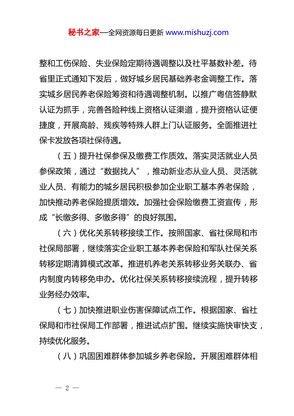 秘书之家—全网资源每日更新 www.mishuzj.com社保分局 2026 年度工作要点一、加强理论武装,推动政治建设(一)持续加强**************思想学习。严格落实“第一议题”制度,深入学习******的重要讲话和****批示精神,跟进学习党的创新理论,牢牢把握推动工作的根本遵循。加强和改进党员思想政治工作,筑牢党员社会主义核心价值观,抓好《******关于*的建设的重要思想概论》学习贯彻。(二)不断夯实基层 dj 基础。深入开展“三会一课”、主题*日等,进一步加强党员理想信念教育、对*忠诚教育和政治意识教育,教育引导党员严守*的政治纪律和政治规矩,做到讲政治、守纪律、负责任、有效率等要求,推动党员干部增强政治素养、强化政治担当、提升政治能力。(三)坚定不移推进全面从严治*。严肃纠治“四风”突出问题和隐形变异行为,深入推进风腐同查同治,加强对重点领域和重点岗位的监督。持续推进整治群众身边不正之风和腐败问题,积极参与骗取套取社保基金专项整治活动。二、实施精准扩面,压实社保惠民责任(四)确保社保待遇按时足额发放。兜牢民生底线,按时足额规范发放各项社会保险待遇。做好退休人员基本养老金调— 1 —秘书之家—全网资源每日更新 www.mishuzj.com整和工伤保险、失业保险定期待遇调整以及社平基数补差。待省里正式通知下发后,做好城乡居民基础养老金调整工作。落实城乡居民养老保险筹资和待遇调整机制。以推广粤信签静默认证为抓手,完善各险种线上资格认证渠道,提升资格认证便捷度,开展高龄、残疾等特殊人群上门认证服务。全面推进社保卡发放各项社保待遇。(五)提升社保参保及缴费工作质效。落实灵活就业人员参保政策,通过“数据找人”,推动新业态从业人员、灵活就业人员、有能力的城乡居民积极参加企业职工基本养老保险,加快推动养老保险提质增效。加强社会保险缴费工资宣传,形成“长缴多得、多缴多得”的良好氛围。(六)优化关系转移接续工作。按照国家、省社保局和市社保局部署,继续落实企业职工基本养老保险和军队社保关系转移定期清算模式改革。推进机养老关系转移业务关联办、省内制度内转移免申办。优化社保关系转移接续流程,提升转移业务经办效率。(七)加快推进职业伤害保障试点工作。根据国家、省社保局和市社保局工作部署,推进试点扩围。继续实施快审快支,持续优化服务。(八)巩固困难群体参加城乡养老保险。开展困难群体相— 2 —秘书之家—全网资源每日更新 www.mishuzj.com关数据比对,精准确定困难群体代缴名单,进一步提高困难群体参保代缴动态清零。三、全面深化改革,推进社保工作规范建设(九)做好延迟退休政策落地实施。落实渐进式延迟退休年龄暂行办法、基本养老保险病残津贴暂行办法及各项政策过渡衔接。开展弹性退休预服务和历史档案信息预审核,主动对接临近退休年龄人员,及时开展申办退休提醒服务,告知可选择的弹性退休时间、退休手续办理流程和渠道,做好政策解释和宣传引导工作。(十)推动机关事业单位养老保险平稳运行。做好过渡期结束后待遇平稳衔接经办工作。加强部门协同,确保每月按时足额发放机关事业单位养老待遇。(十一)加强职业年金基金管理。持续推进归集账户资金常态化清理。加强职业年金转入业务经办,确保账实匹配。及时清理退役军人职业年金补助转入存量业务,根据不同情况,加强与原部队对接,确保转入资金账实匹配。(十二)推进城乡居民养老保险规范管理。开展长期暂停缴费和待遇人员清理,分析研判居保暂停缴费情况,引导暂停缴费人员参加更高保障水平的养老保险。落实被征地农民基本养老保险相关政策。— 3 —秘书之家—全网资源每日更新 www.mishuzj.com(十三)持续完善工伤保险管理服务体系。加强与税务部门联动,开展工伤保险基金运行监测,打击“先伤后保”等欺诈骗保行为。推动工伤预防和工伤康复工作进一步提质增效,加强工伤预防宣传和培训工作。 (十四)加强失业保险业务经办管理。贯彻落实《xx 省失业保险条例》,加强办事群众沟通解释,保障已取消业务的平稳有序过渡,做好失业领金人员代缴医疗保险、大龄失业领金人员参加基本养老保险工作。对短期参...