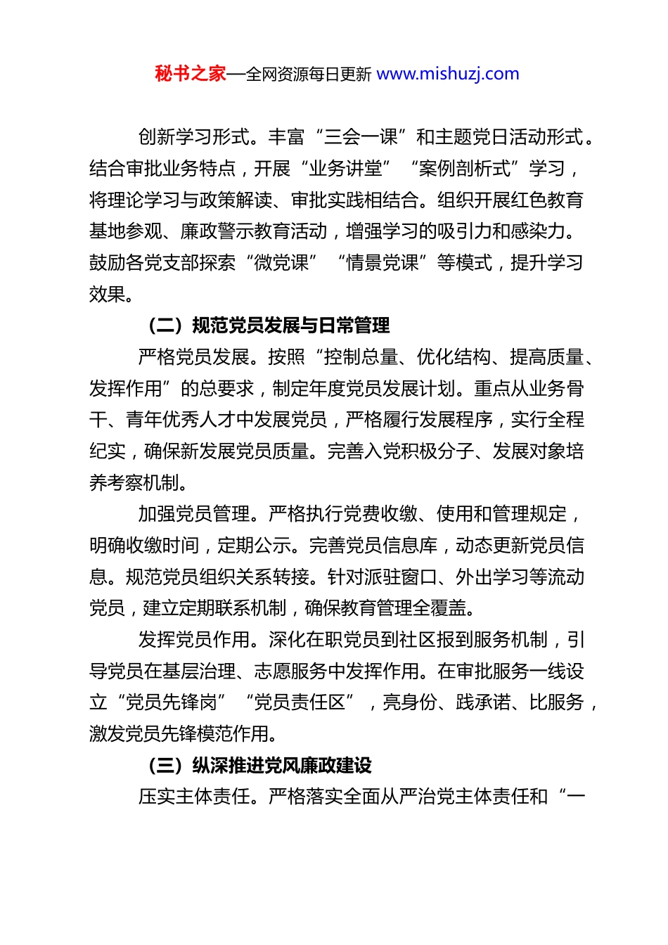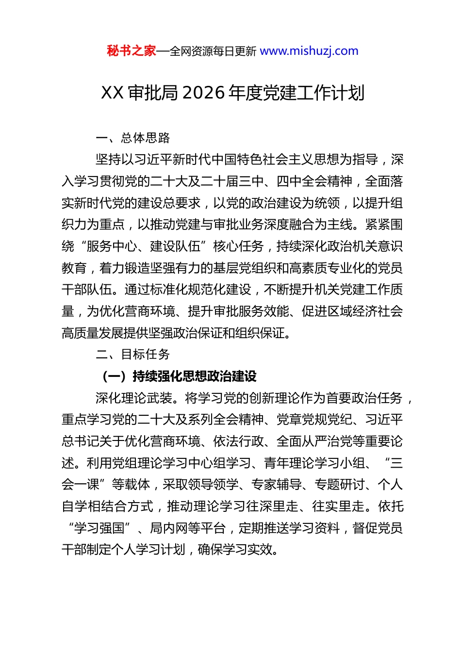秘书之家—全网资源每日更新 www.mishuzj.comXX 审批局 2026 年度党建工作计划一、总体思路坚持以习近平新时代中国特色社会主义思想为指导,深入学习贯彻党的二十大及二十届三中、四中全会精神,全面落实新时代党的建设总要求,以党的政治建设为统领,以提升组织力为重点,以推动党建与审批业务深度融合为主线。紧紧围绕“服务中心、建设队伍”核心任务,持续深化政治机关意识教育,着力锻造坚强有力的基层党组织和高素质专业化的党员干部队伍。通过标准化规范化建设,不断提升机关党建工作质量,为优化营商环境、提升审批服务效能、促进区域经济社会高质量发展提供坚强政治保证和组织保证。二、目标任务(一)持续强化思想政治建设深化理论武装。将学习党的创新理论作为首要政治任务,重点学习党的二十大及系列全会精神、党章党规党纪、习近平总书记关于优化营商环境、依法行政、全面从严治党等重要论述。利用党组理论学习中心组学习、青年理论学习小组、“三会一课”等载体,采取领导领学、专家辅导、专题研讨、个人自学相结合方式,推动理论学习往深里走、往实里走。依托“学习强国”、局内网等平台,定期推送学习资料,督促党员干部制定个人学习计划,确保学习实效。秘书之家—全网资源每日更新 www.mishuzj.com创新学习形式。丰富“三会一课”和主题党日活动形式。结合审批业务特点,开展“业务讲堂”“案例剖析式”学习,将理论学习与政策解读、审批实践相结合。组织开展红色教育基地参观、廉政警示教育活动,增强学习的吸引力和感染力。鼓励各党支部探索“微党课”“情景党课”等模式,提升学习效果。(二)规范党员发展与日常管理严格党员发展。按照“控制总量、优化结构、提高质量、发挥作用”的总要求,制定年度党员发展计划。重点从业务骨干、青年优秀人才中发展党员,严格履行发展程序,实行全程纪实,确保新发展党员质量。完善入党积极分子、发展对象培养考察机制。加强党员管理。严格执行党费收缴、使用和管理规定,明确收缴时间,定期公示。完善党员信息库,动态更新党员信息。规范党员组织关系转接。针对派驻窗口、外出学习等流动党员,建立定期联系机制,确保教育管理全覆盖。发挥党员作用。深化在职党员到社区报到服务机制,引导党员在基层治理、志愿服务中发挥作用。在审批服务一线设立“党员先锋岗”“党员责任区”,亮身份、践承诺、比服务,激发党员先锋模范作用。(三)纵深推进党风廉政建设压实主体责任。严格落实全面从严治党主体责任和“一秘书之家—全网资源每日更新 www.mishuzj.com岗双责”,局党组书记负总责,班子成员分工负责,层层签订党风廉政建设责任书。定期召开党风廉政建设专题会议,分析研判形势,部署工作任务。聚焦审批权力运行关键环节、廉政风险点,制定和完善防控措施。加强廉政教育。扎实开展党风廉政教育月活动,组织学习党纪处分条例、监察法等法律法规,通报典型案例,观看警示教育片,参观廉政教育基地。结合审批工作实际,开展“廉洁审批”承诺践诺活动,筑牢拒腐防变思想防线。强化监督执纪。加强日常监督,紧盯重要节点、重点岗位,严肃查处“四风”问题,特别是形式主义、官僚主义新表现。畅通监督渠道,设立举报信箱和电话,自觉接受群众监督。加强对审批流程、时限、结果等环节的监督检查,促进依法行政、廉洁审批。(四)抓实宣传与意识形态工作筑牢意识形态阵地。严格落实意识形态工作责任制,加强对局网站、微信公众号、宣传栏等阵地的管理。定期分析研判意识形态领域风险,确保意识形态安全。讲好审批故事。围绕优化营商环境、提升审批效率、服务企业发展等中心工作,积极挖掘宣传先进典型、经验做法和改革成效。利用多种媒介,展示党建工作成果和党员风采,营造比学赶超、奋发有为的良好氛围。(五)严格规范党内组织生活秘书之家—全网资源每日更新 www.mishuzj.com落实基本制度。严格执行“三会一课”、组织生活会、民主评议党员、谈心谈话等制度。提高组织生活会质量,认真开展批评与自我批评。党员领导干部带头参加双重组织生活。提升活动质量。精心设计主题党日活动内容,增强政治性和仪式感。鼓励党支部...
