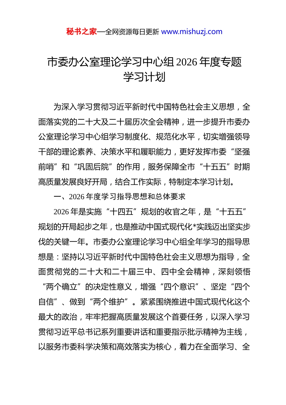 秘书之家—全网资源每日更新 www.mishuzj.com市委办公室理论学习中心组 2026 年度专题学习计划 为深入学习贯彻习近平新时代中国特色社会主义思想,全面落实党的二十大及二十届历次全会精神,进一步提升市委办公室理论学习中心组学习制度化、规范化水平,切实增强领导干部的理论素养、决策水平和履职能力,更好发挥市委“坚强前哨”和“巩固后院”的作用,服务保障全市“十五五”时期高质量发展良好开局,结合工作实际,特制定本学习计划。一、2026 年度学习指导思想和总体要求2026 年是实施“十四五”规划的收官之年,是“十五五”规划的开局起步之年,也是推动中国式现代化*实践迈出坚实步伐的关键一年。市委办公室理论学习中心组全年学习的指导思想是:坚持以习近平新时代中国特色社会主义思想为指导,全面贯彻党的二十大和二十届三中、四中全会精神,深刻领悟“两个确立”的决定性意义,增强“四个意识”、坚定“四个自信”、做到“两个维护”。紧紧围绕推进中国式现代化这个最大的政治,牢牢把握高质量发展这个首要任务,以深入学习贯彻习近平总书记系列重要讲话和重要指示批示精神为主线,以服务市委科学决策和高效落实为核心,着力在全面学习、全秘书之家—全网资源每日更新 www.mishuzj.com面把握、全面落实上下功夫。学习的总体要求是:坚持将理论学习作为加强办公室政治建设的首要任务和提升“三服务”工作质效的根本途径。弘扬马克思主义学风,坚持读原著、学原文、悟原理,做到学思用贯通、知信行统一。始终胸怀“国之大者”,自觉将办公室工作置于党和国家事业发展全局、置于全省全市中心工作中去谋划和推进。聚焦“十五五”时期经济社会发展目标与战略任务,着力提升政治判断力、政治领悟力、政治执行力,切实把学习成果转化为精准参谋、高效协调、有力督查、周全保障的实际效能,转化为推动党中央决策部署和省委、市委工作要求不折不扣落地生根的生动实践,为奋力谱写中国式现代化*篇章贡献党办智慧和力量。二、2026 年度重点学习专题安排全年计划围绕以下十四个专题开展集中学习研讨,每个专题学习时间不少于半天,中心组成员须结合分管领域和工作实际深入开展调研与思考,确保学习实效。1.专题一:深入学习《习近平谈治国理政》第五卷,全面把握习近平新时代中国特色社会主义思想的最新成果与核心要义本专题旨在系统研学《习近平谈治国理政》第五卷这一权秘书之家—全网资源每日更新 www.mishuzj.com威著作,该卷收录了习近平总书记在 2022 年 5 月至 2024 年 12月期间的 91 篇重要著作,分为 18 个专题。学习要聚焦于著作中深刻阐明的以中国式现代化全面推进强国建设、民族复兴伟业的使命任务,深入理解关于谋划和推进进一步全面深化改革、发展新质生产力、坚持“两个结合”、构建人类命运共同体等一系列具有原创性、时代性、指导性的重大思想观点。市委办公室作为政治机关,必须将学习第五卷作为长期政治任务,通过原原本本学、融会贯通学,深刻领会其丰富内涵、精神实质和实践要求。要重点思考如何将这一思想武器转化为服务市委统揽全局、协调各方的具体思路,如何运用其中蕴含的立场观点方法破解办公室在服务高质量发展中遇到的新问题,如何以党的创新理论最新成果指导文稿起草、信息研判、改革督查等各项工作,不断提升工作的科学性、预见性、主动性,确保办公室各项工作始终沿着正确政治方向前进。2.专题二:深入学习贯彻习近平经济思想,深刻领会把握推动高质量发展的战略部署与实践路径本专题要求深入学习领会习近平经济思想,特别是其中关于立足新发展阶段、贯彻新发展理念、构建新发展格局、推动高质量发展的系统性论述。要结合学习中央经济工作会议精神以及“十五五”规划建议中关于经济发展的战略部署,深刻理秘书之家—全网资源每日更新 www.mishuzj.com解坚持高质量发展是新时代的硬道理。市委办公室承担着服务市委抓经济工作的参谋助手职责,必须精准把握当前经济发展面临的形势与任务,深入领会建设现代化产业体系、因地制宜发展新质生产力、建设全国统一大市场、扩大高水平对外开放等关键命题。学习要着力于提升围绕中心、...