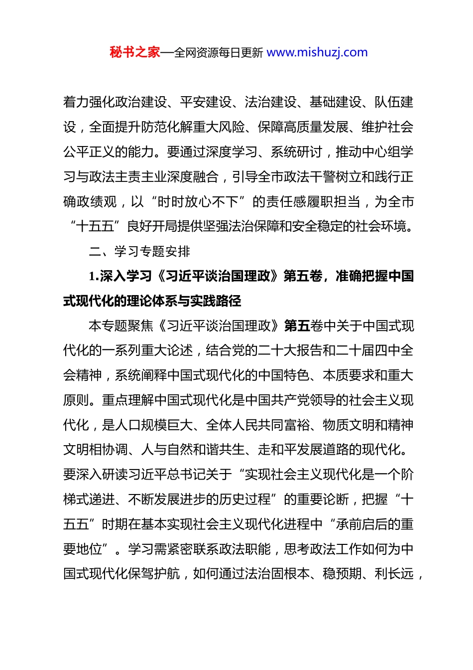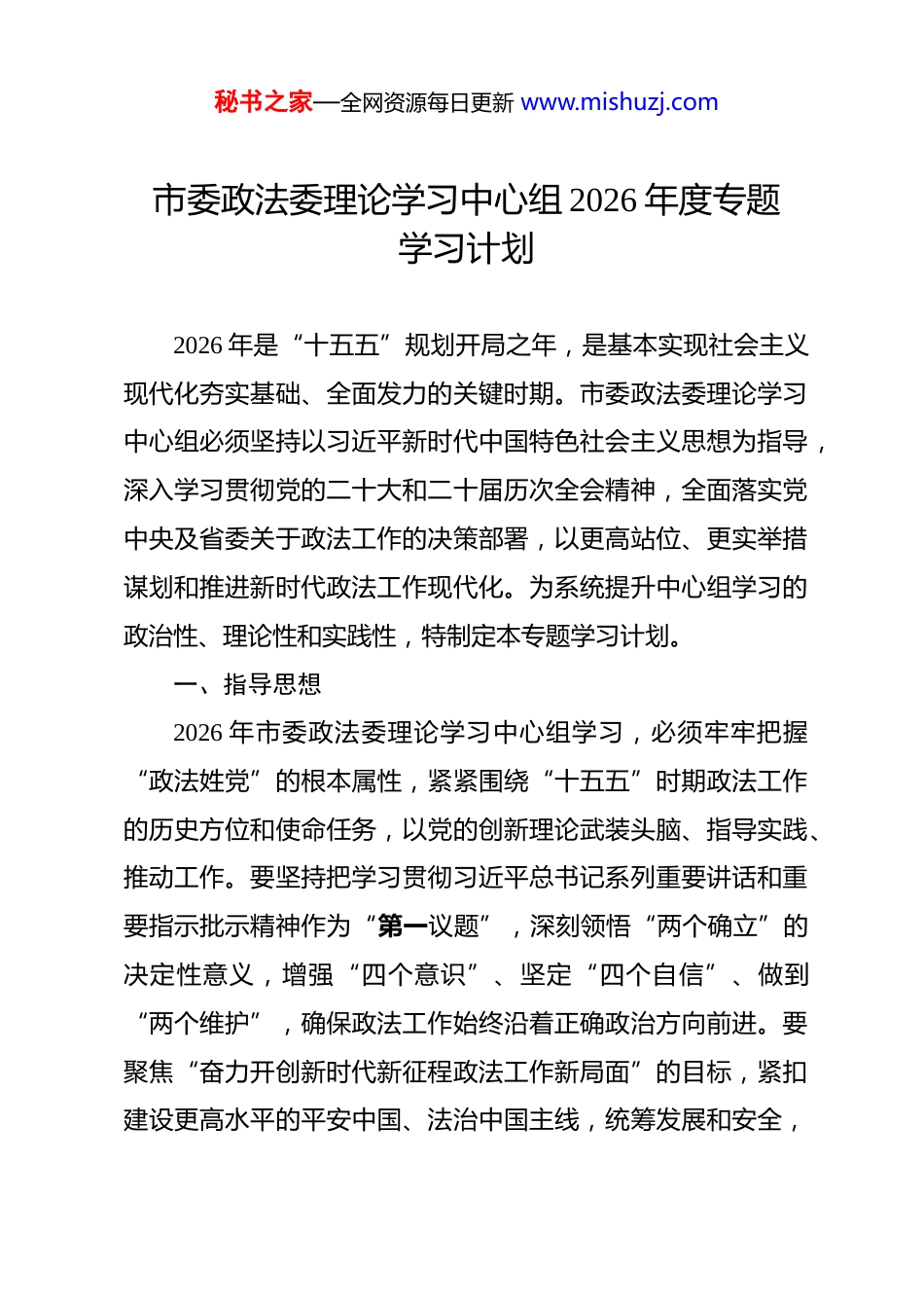 秘书之家—全网资源每日更新 www.mishuzj.com市委政法委理论学习中心组 2026 年度专题学习计划 2026 年是“十五五”规划开局之年,是基本实现社会主义现代化夯实基础、全面发力的关键时期。市委政法委理论学习中心组必须坚持以习近平新时代中国特色社会主义思想为指导,深入学习贯彻党的二十大和二十届历次全会精神,全面落实党中央及省委关于政法工作的决策部署,以更高站位、更实举措谋划和推进新时代政法工作现代化。为系统提升中心组学习的政治性、理论性和实践性,特制定本专题学习计划。一、指导思想2026 年市委政法委理论学习中心组学习,必须牢牢把握“政法姓党”的根本属性,紧紧围绕“十五五”时期政法工作的历史方位和使命任务,以党的创新理论武装头脑、指导实践、推动工作。要坚持把学习贯彻习近平总书记系列重要讲话和重要指示批示精神作为“第一议题”,深刻领悟“两个确立”的决定性意义,增强“四个意识”、坚定“四个自信”、做到“两个维护”,确保政法工作始终沿着正确政治方向前进。要聚焦“奋力开创新时代新征程政法工作新局面”的目标,紧扣建设更高水平的平安中国、法治中国主线,统筹发展和安全,秘书之家—全网资源每日更新 www.mishuzj.com着力强化政治建设、平安建设、法治建设、基础建设、队伍建设,全面提升防范化解重大风险、保障高质量发展、维护社会公平正义的能力。要通过深度学习、系统研讨,推动中心组学习与政法主责主业深度融合,引导全市政法干警树立和践行正确政绩观,以“时时放心不下”的责任感履职担当,为全市“十五五”良好开局提供坚强法治保障和安全稳定的社会环境。二、学习专题安排1.深入学习《习近平谈治国理政》第五卷,准确把握中国式现代化的理论体系与实践路径本专题聚焦《习近平谈治国理政》第五卷中关于中国式现代化的一系列重大论述,结合党的二十大报告和二十届四中全会精神,系统阐释中国式现代化的中国特色、本质要求和重大原则。重点理解中国式现代化是中国共产党领导的社会主义现代化,是人口规模巨大、全体人民共同富裕、物质文明和精神文明相协调、人与自然和谐共生、走和平发展道路的现代化。要深入研读习近平总书记关于“实现社会主义现代化是一个阶梯式递进、不断发展进步的历史过程”的重要论断,把握“十五五”时期在基本实现社会主义现代化进程中“承前启后的重要地位”。学习需紧密联系政法职能,思考政法工作如何为中国式现代化保驾护航,如何通过法治固根本、稳预期、利长远,秘书之家—全网资源每日更新 www.mishuzj.com如何在社会治理中体现公平正义、促进人的全面发展。要结合《习近平关于全面依法治国论述摘编》等著作,领悟法治与中国式现代化的内在关系,明确政法机关在推进国家治理体系和治理能力现代化中的职责使命。2.学习贯彻习近平总书记关于坚持和加强党的全面领导的重要论述,筑牢政法机关绝对忠诚的政治根基本专题重点学习《习近平关于坚持和加强党的全面领导论述摘编》、习近平总书记在中央政治局民主生活会上的重要讲话精神,以及《中国共产党领导全面依法治国工作条例》的核心要义。深刻认识坚持党的全面领导是最高政治原则,是政法工作始终沿着正确方向前进的根本保证。要深入理解“刀把子”必须牢牢掌握在党和人民手中的政治要求,把握政法机关首先是政治机关的根本属性。学习要围绕“坚定拥护‘两个确立’、坚决做到‘两个维护’”这一最高政治纪律和规矩展开,探讨如何将党的绝对领导贯彻到政法工作各方面全过程。需系统研究党领导立法、保证执法、支持司法、带头守法的体制机制,思考如何完善党委政法委“把方向、管大局、保落实”的制度安排。结合《中国共产党政法工作条例》的再学习再落实,研究如何强化请示报告、督查督办、中心组学习等制度,确保党的路线方针政策在政法系统不折不扣执行,永葆政法队伍绝秘书之家—全网资源每日更新 www.mishuzj.com对忠诚、绝对纯洁、绝对可靠的政治本色。3.深研笃行习近平法治思想,以法治现代化支撑和服务中国式现代化本专题以《习近平法治思想学习纲要》为核心教材,结合习近平总书记对政法工作的重要指示和中央全面依法治国委...