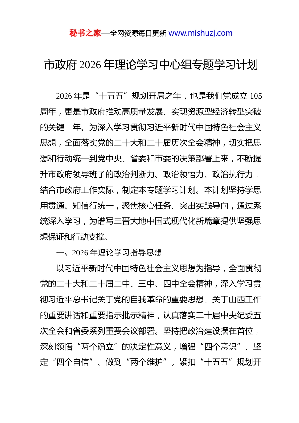 秘书之家—全网资源每日更新 www.mishuzj.com市政府 2026 年理论学习中心组专题学习计划 2026 年是“十五五”规划开局之年,也是我们党成立 105周年,更是市政府推动高质量发展、实现资源型经济转型突破的关键一年。为深入学习贯彻习近平新时代中国特色社会主义思想,全面落实党的二十大和二十届历次全会精神,切实把思想和行动统一到党中央、省委和市委的决策部署上来,不断提升市政府领导班子的政治判断力、政治领悟力、政治执行力,结合市政府工作实际,制定本专题学习计划。本计划坚持学思用贯通、知信行统一,聚焦核心任务、突出实践导向,通过系统深入学习,为谱写三晋大地中国式现代化新篇章提供坚强思想保证和行动支撑。一、2026 年理论学习指导思想以习近平新时代中国特色社会主义思想为指导,全面贯彻党的二十大和二十届二中、三中、四中全会精神,深入学习贯彻习近平总书记关于党的自我革命的重要思想、关于山西工作的重要讲话和重要指示批示精神,认真落实二十届中央纪委五次全会和省委系列重要会议部署。坚持把政治建设摆在首位,深刻领悟“两个确立”的决定性意义,增强“四个意识”、坚定“四个自信”、做到“两个维护”。紧扣“十五五”规划开秘书之家—全网资源每日更新 www.mishuzj.com局起步要求,围绕推动资源型经济转型、发展新质生产力、保障和改善民生、维护安全稳定等重点工作,坚持稳中求进工作总基调,完整准确全面贯彻新发展理念,统筹发展和安全,以高质量理论学习引领高质量发展,推动市政府各项工作再上新台阶,为基本实现社会主义现代化夯实基础。二、重点学习专题1.、深入学习《习近平谈治国理政》第五卷,筑牢思想根基引领发展实践深入学习《习近平谈治国理政》第五卷,深刻领会其中蕴含的马克思主义立场、观点、方法,准确把握新时代中国特色社会主义的理论逻辑、历史逻辑、实践逻辑。重点研读关于坚持和加强党的全面领导、推动高质量发展、统筹发展和安全等重要篇章,深刻理解“中国之治”的制度优势和实践路径。将学习成果与市政府工作实际深度融合,切实把学习成效转化为谋划工作的思路、推动落实的举措、解决问题的能力。强化理论武装的政治自觉,坚持用习近平新时代中国特色社会主义思想凝心铸魂,始终在思想上政治上行动上同以习近平同志为核心的党中央保持高度一致。注重学深悟透核心要义,深刻认识新时代十年伟大变革的重大意义,不断增强推动转型发展的责任感和使命感。以理论清醒保证政治坚定,以思想自觉引领行秘书之家—全网资源每日更新 www.mishuzj.com动自觉,切实把学习成果体现在提升政府治理效能、推动各项工作落地见效上,为“十五五”时期发展开好局起好步提供思想支撑。2.、学习习近平总书记关于新质生产力的重要论述,激活转型发展新动能深入学习习近平总书记关于发展新质生产力的重要论述,认真研读《习近平著作选读》中关于科技创新、产业升级的相关内容,准确把握新质生产力的科学内涵、发展规律和实践要求。深刻认识发展新质生产力是推动高质量发展的内在要求,是实现资源型经济转型的关键路径。结合市政府工作职责,聚焦传统产业升级、新兴产业培育,推动人工智能、大数据等新技术与实体经济深度融合,加快构建体现本地特色、具有比较优势的现代化产业体系。主动对接国家战略部署,因地制宜布局新兴产业和未来产业,推动产业结构向高端化、智能化、绿色化转型。强化科技创新支撑作用,完善科技成果转化机制,加大对关键核心技术攻关的支持力度,培育壮大新产业新业态新模式。通过系统学习,切实把思想和行动统一到党中央关于发展新质生产力的决策部署上来,以技术创新引领产业转型,以产业升级赋能高质量发展。3.、学习习近平总书记关于山西工作重要讲话精神,锚定秘书之家—全网资源每日更新 www.mishuzj.com转型发展正确方向深入学习习近平总书记在山西考察时的重要讲话和重要指示批示精神,认真贯彻“努力在推动资源型经济转型发展上迈出新步伐”的重大要求,深刻领会党中央对山西发展的战略定位和殷切期望。重点学习关于资源型经济转型、黄河流域生态保护和高质量发展、中部地区加快崛起等重要论述,...
