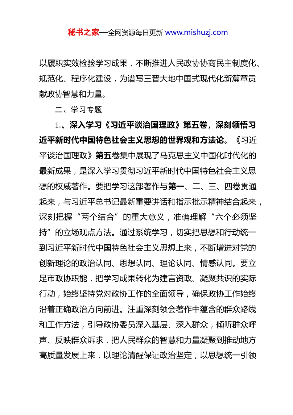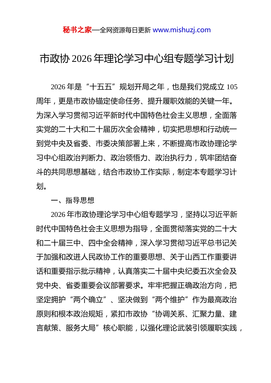 秘书之家—全网资源每日更新 www.mishuzj.com市政协 2026 年理论学习中心组专题学习计划 2026 年是“十五五”规划开局之年,也是我们党成立 105周年,更是市政协锚定使命任务、提升履职效能的关键一年。为深入学习贯彻习近平新时代中国特色社会主义思想,全面落实党的二十大和二十届历次全会精神,切实把思想和行动统一到党中央及省委、市委决策部署上来,不断提高市政协理论学习中心组政治判断力、政治领悟力、政治执行力,筑牢团结奋斗的共同思想基础,结合市政协工作实际,制定本专题学习计划。一、指导思想2026 年市政协理论学习中心组专题学习,坚持以习近平新时代中国特色社会主义思想为指导,全面贯彻落实党的二十大和二十届三中、四中全会精神,深入学习贯彻习近平总书记关于加强和改进人民政协工作的重要思想、关于山西工作重要讲话和重要指示批示精神,认真落实二十届中央纪委五次全会及党中央、省委重要会议部署要求。牢牢把握正确政治方向,把坚定拥护“两个确立”、坚决做到“两个维护”作为最高政治原则和根本政治规矩,紧扣市政协“协调关系、汇聚力量、建言献策、服务大局”核心职能,以强化理论武装引领履职实践,秘书之家—全网资源每日更新 www.mishuzj.com以履职实效检验学习成果,不断推进人民政协协商民主制度化、规范化、程序化建设,为谱写三晋大地中国式现代化新篇章贡献政协智慧和力量。二、学习专题1.、深入学习《习近平谈治国理政》第五卷,深刻领悟习近平新时代中国特色社会主义思想的世界观和方法论。《习近平谈治国理政》第五卷集中展现了马克思主义中国化时代化的最新成果,是深入学习贯彻习近平新时代中国特色社会主义思想的权威著作。要把学习这部著作与第一、二、三、四卷贯通起来,与习近平总书记最新重要讲话和指示批示精神结合起来,深刻把握“两个结合”的重大意义,准确理解“六个必须坚持”的立场观点方法。通过系统学习,切实把思想和行动统一到习近平新时代中国特色社会主义思想上来,不断增进对党的创新理论的政治认同、思想认同、理论认同、情感认同。要立足市政协职能,把学习成果转化为建言资政、凝聚共识的实际行动,始终坚持党对政协工作的全面领导,确保政协工作始终沿着正确政治方向前进。注重深刻领会著作中蕴含的群众路线和工作方法,引导政协委员深入基层、深入群众,倾听群众呼声、反映群众诉求,把人民群众的智慧和力量凝聚到推动地方高质量发展上来,以理论清醒保证政治坚定,以思想统一引领秘书之家—全网资源每日更新 www.mishuzj.com行动一致。2.、深入学习习近平总书记关于党的自我革命的重要思想,贯彻落实二十届中央纪委五次全会精神。习近平总书记关于党的自我革命的重要思想,是习近平新时代中国特色社会主义思想的重要组成部分,为深入推进全面从严治党提供了根本遵循。二十届中央纪委五次全会公报对 2026 年党风廉政建设和反腐败工作作出全面部署,明确了工作方向和重点任务。要深入学习习近平总书记在二十届中央纪委五次全会上的重要讲话精神,深刻把握全会提出的“四个深刻把握”要求,切实增强推进党的自我革命的政治自觉、思想自觉、行动自觉。结合市政协工作实际,要把全面从严治党要求贯穿政协履职全过程,严格落实管党治党政治责任,坚持党性党风党纪一起抓,持续加固中央八项规定精神堤坝,坚决纠治形式主义、官僚主义。引导政协委员中的党员干部严守政治纪律和政治规矩,自觉抵制歪风邪气,筑牢拒腐防变思想防线。要以“纪检监察工作规范化法治化正规化建设年”行动为契机,健全政协内部监督机制,强化对委员履职行为的监督管理,营造风清气正的政治生态和履职环境,以过硬作风保障政协工作高质量发展。3.、深入学习习近平总书记关于加强和改进人民政协工作的重要思想,提升专门协商机构效能。习近平总书记在庆祝中秘书之家—全网资源每日更新 www.mishuzj.com国人民政治协商会议成立 65 周年大会上的讲话,系统阐述了人民政协的性质定位、职能作用和工作要求,为新时代人民政协事业发展指明了前进方向。要深入学习这一重要讲话及习近平总书记关于人民政协工作的系列重要论述,深刻把...