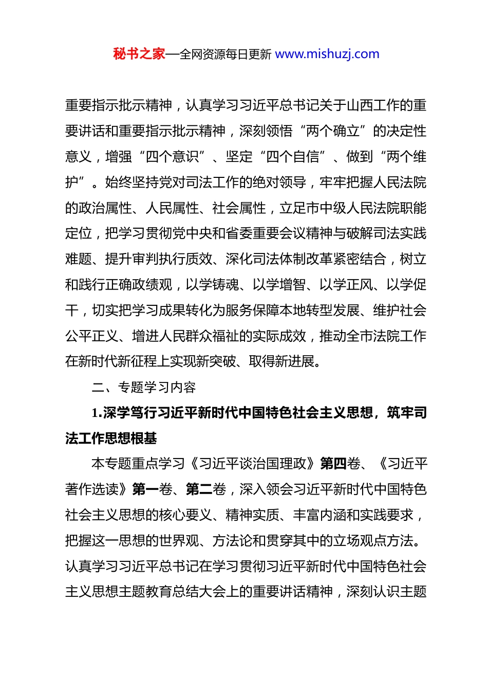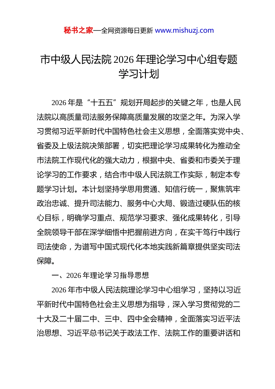 秘书之家—全网资源每日更新 www.mishuzj.com市中级人民法院 2026 年理论学习中心组专题学习计划 2026 年是“十五五”规划开局起步的关键之年,也是人民法院以高质量司法服务保障高质量发展的攻坚之年。为深入学习贯彻习近平新时代中国特色社会主义思想,全面落实党中央、省委及上级法院决策部署,切实把理论学习成果转化为推动全市法院工作现代化的强大动力,根据中央、省委和市委关于理论学习的工作要求,结合市中级人民法院工作实际,制定本专题学习计划。本计划坚持学思用贯通、知信行统一,聚焦筑牢政治忠诚、提升司法能力、服务中心大局、锻造过硬队伍的核心目标,明确学习重点、规范学习要求、强化成果转化,引导全院领导干部在深学细悟中把握前进方向,在实干笃行中践行司法使命,为谱写中国式现代化本地实践新篇章提供坚实司法保障。一、2026 年理论学习指导思想2026 年市中级人民法院理论学习中心组学习,坚持以习近平新时代中国特色社会主义思想为指导,深入学习贯彻党的二十大及二十届二中、三中、四中全会精神,全面落实习近平法治思想、习近平总书记关于政法工作、法院工作的重要讲话和秘书之家—全网资源每日更新 www.mishuzj.com重要指示批示精神,认真学习习近平总书记关于山西工作的重要讲话和重要指示批示精神,深刻领悟“两个确立”的决定性意义,增强“四个意识”、坚定“四个自信”、做到“两个维护”。始终坚持党对司法工作的绝对领导,牢牢把握人民法院的政治属性、人民属性、社会属性,立足市中级人民法院职能定位,把学习贯彻党中央和省委重要会议精神与破解司法实践难题、提升审判执行质效、深化司法体制改革紧密结合,树立和践行正确政绩观,以学铸魂、以学增智、以学正风、以学促干,切实把学习成果转化为服务保障本地转型发展、维护社会公平正义、增进人民群众福祉的实际成效,推动全市法院工作在新时代新征程上实现新突破、取得新进展。二、专题学习内容1.深学笃行习近平新时代中国特色社会主义思想,筑牢司法工作思想根基本专题重点学习《习近平谈治国理政》第四卷、《习近平著作选读》第一卷、第二卷,深入领会习近平新时代中国特色社会主义思想的核心要义、精神实质、丰富内涵和实践要求,把握这一思想的世界观、方法论和贯穿其中的立场观点方法。认真学习习近平总书记在学习贯彻习近平新时代中国特色社会主义思想主题教育总结大会上的重要讲话精神,深刻认识主题秘书之家—全网资源每日更新 www.mishuzj.com教育的重大成果、成功经验和实践要求,持续巩固拓展主题教育成效。结合法院工作实际,深刻理解“两个结合”的重大意义,始终把习近平新时代中国特色社会主义思想作为司法工作的根本遵循和行动指南,不断提高运用党的创新理论指导实践、破解难题、推动工作的能力。把理论学习与司法工作政治方向校准相结合,切实把思想和行动统一到党中央决策部署上来。坚持读原著、学原文、悟原理,做到学深悟透、融会贯通,始终坚持党对人民法院工作的绝对领导,把党的领导贯穿司法审判全过程各方面,确保法院工作始终沿着正确政治方向前进。不断健全完善以学铸魂、以学增智、以学正风、以学促干长效机制,切实把学习成效体现为坚定政治忠诚、提升司法能力、服务中心大局的实际行动,为全市法院工作高质量发展提供坚强思想保证。2.深入学习习近平法治思想,精准把握新时代司法工作规律本专题重点学习《习近平法治思想学习纲要》《习近平法治思想学习问答》,认真研读习近平总书记《论坚持全面依法治国》等重要著作,深入学习习近平总书记在中央全面依法治国委员会会议上的重要讲话精神,深刻领会习近平法治思想“十一个坚持”的核心内涵。准确把握习近平法治思想关于公秘书之家—全网资源每日更新 www.mishuzj.com正司法的重要论述,深刻认识公正司法是维护社会公平正义的最后一道防线,始终把公平正义作为司法工作的生命线和价值追求。将习近平法治思想融入司法审判各环节,以法治思维和法治方式提升司法服务保障质效。紧密结合市中级人民法院职能,深刻理解新时代司法工作的使命任务,坚持以人民为中心的发展思想,把体现人民利益、反映人民...