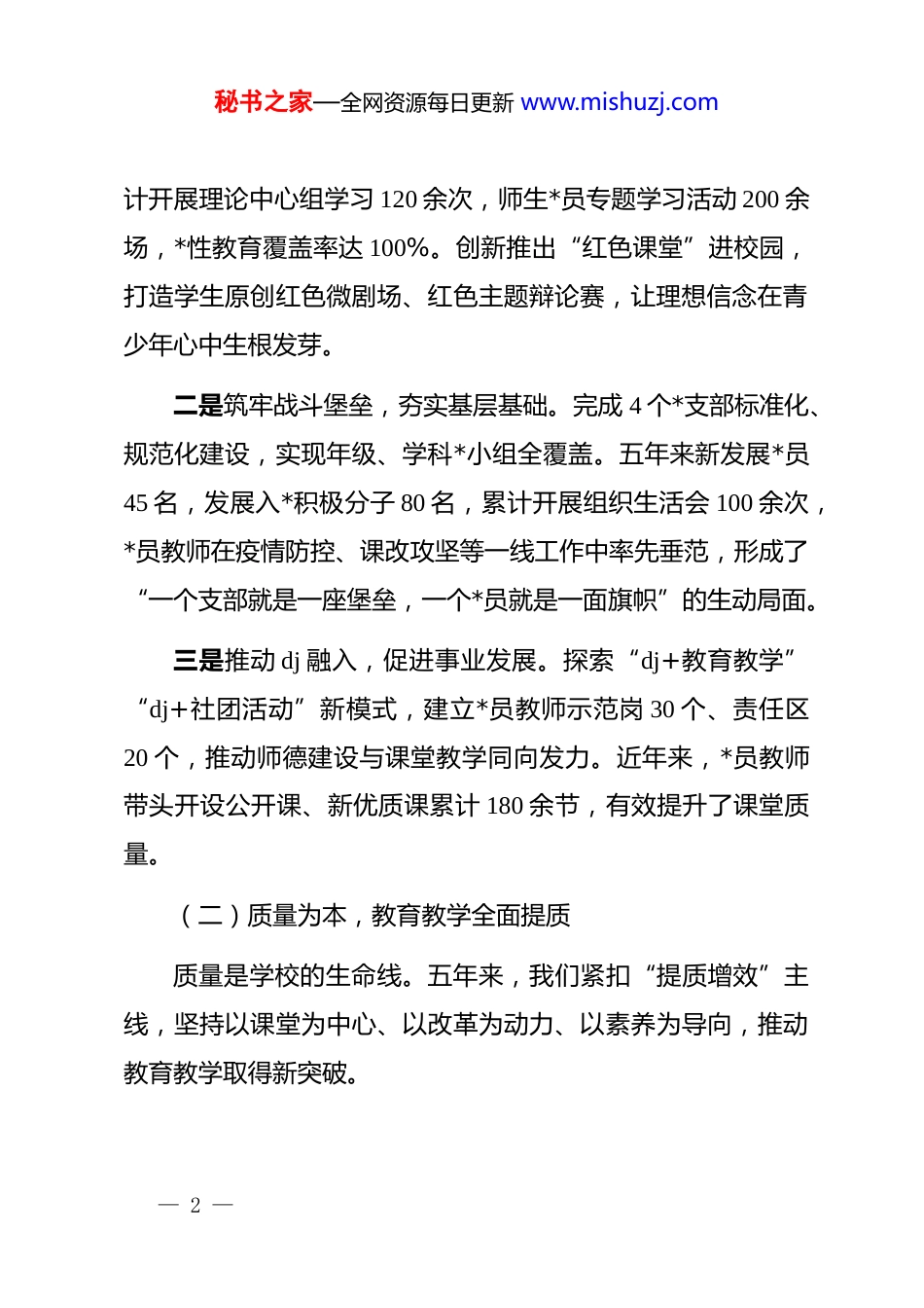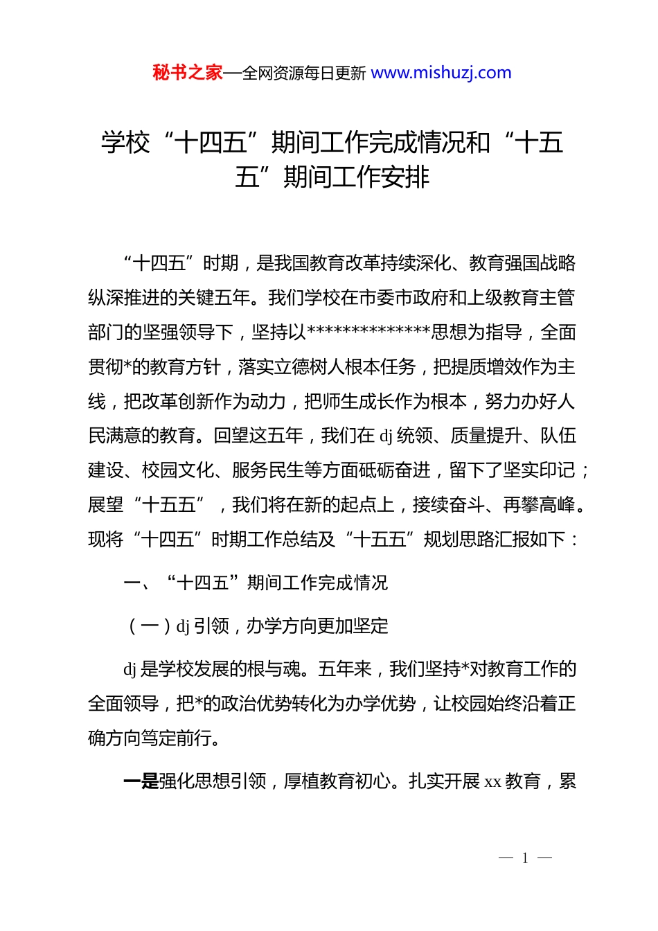 秘书之家—全网资源每日更新 www.mishuzj.com学校“十四五”期间工作完成情况和“十五五”期间工作安排“十四五”时期,是我国教育改革持续深化、教育强国战略纵深推进的关键五年。我们学校在市委市政府和上级教育主管部门的坚强领导下,坚持以**************思想为指导,全面贯彻*的教育方针,落实立德树人根本任务,把提质增效作为主线,把改革创新作为动力,把师生成长作为根本,努力办好人民满意的教育。回望这五年,我们在 dj 统领、质量提升、队伍建设、校园文化、服务民生等方面砥砺奋进,留下了坚实印记;展望“十五五”,我们将在新的起点上,接续奋斗、再攀高峰。现将“十四五”时期工作总结及“十五五”规划思路汇报如下:一、“十四五”期间工作完成情况(一)dj 引领,办学方向更加坚定dj 是学校发展的根与魂。五年来,我们坚持*对教育工作的全面领导,把*的政治优势转化为办学优势,让校园始终沿着正确方向笃定前行。一是强化思想引领,厚植教育初心。扎实开展 xx 教育,累— 1 —秘书之家—全网资源每日更新 www.mishuzj.com计开展理论中心组学习 120 余次,师生*员专题学习活动 200 余场,*性教育覆盖率达 100%。创新推出“红色课堂”进校园,打造学生原创红色微剧场、红色主题辩论赛,让理想信念在青少年心中生根发芽。二是筑牢战斗堡垒,夯实基层基础。完成 4 个*支部标准化、规范化建设,实现年级、学科*小组全覆盖。五年来新发展*员45 名,发展入*积极分子 80 名,累计开展组织生活会 100 余次,*员教师在疫情防控、课改攻坚等一线工作中率先垂范,形成了“一个支部就是一座堡垒,一个*员就是一面旗帜”的生动局面。三是推动 dj 融入,促进事业发展。探索“dj+教育教学”“dj+社团活动”新模式,建立*员教师示范岗 30 个、责任区20 个,推动师德建设与课堂教学同向发力。近年来,*员教师带头开设公开课、新优质课累计 180 余节,有效提升了课堂质量。(二)质量为本,教育教学全面提质质量是学校的生命线。五年来,我们紧扣“提质增效”主线,坚持以课堂为中心、以改革为动力、以素养为导向,推动教育教学取得新突破。— 2 —秘书之家—全网资源每日更新 www.mishuzj.com一是深化课程改革,激活课堂生态。全面落实国家课程方案,构建“国家课程校本化、地方课程特色化、校本课程多样化”的课程体系。累计开发校本课程 15 门,涵盖书法、戏剧、人工智能编程等特色内容,深受学生喜爱。引入智慧黑板、智慧教室,覆盖率达 90%以上,课堂互动性显著增强。二是注重因材施教,推进均衡发展。推出“分层教学+导师制”模式,建立学情分析和精准帮扶制度。五年来累计帮扶学困生 1200 余人次,其中 85%以上顺利提升成绩并树立自信。开设“优生拓展班”,学生在市级学科竞赛中获奖人数比“十三五”末增长 30%。三是强化质量监测,提升育人水平。完善“学段监测—年级评价—课堂诊断”三级质量监控体系,每学期开展两次全校质量检测,形成改进闭环。近三年,学校中考重点率稳居全区前列,高考一本率连续攀升,学生在科技创新大赛、艺术展演中累计获奖 120 余项。(三)队伍建设,教师成长更加坚实教师是教育的第一资源。五年来,我们把师资队伍建设作为学校发展的核心任务,着力打造一支师德高尚、业务精湛、— 3 —秘书之家—全网资源每日更新 www.mishuzj.com结构合理的教师队伍。一是突出师德师风,筑牢立德根基。严格落实师德师风建设长效机制,开展师德教育专题培训 60 余场,签订师德承诺书100%全覆盖。评选“最美教师”“师德标兵”20 名,通过校园媒体宣传先进事迹,营造“学先进、当先锋”的良好氛围。二是实施培养计划,提升专业素养。推进“青蓝工程”,累计结对“师徒对子”60 对,青年教师课堂合格率和优质课获奖率提升显著。组织教师参加市级以上培训 500 余人次,选派骨干教师赴省内外名校学习 120 人次,先后有 10 余人获评市级骨干教师、学科带头人。三是拓展成长路径,激发队伍活力。完善职称评聘与考核机制,畅通成长通道。五年来,晋升中高级职称教师 40 人,引进硕士研究生学历教师 25 人...