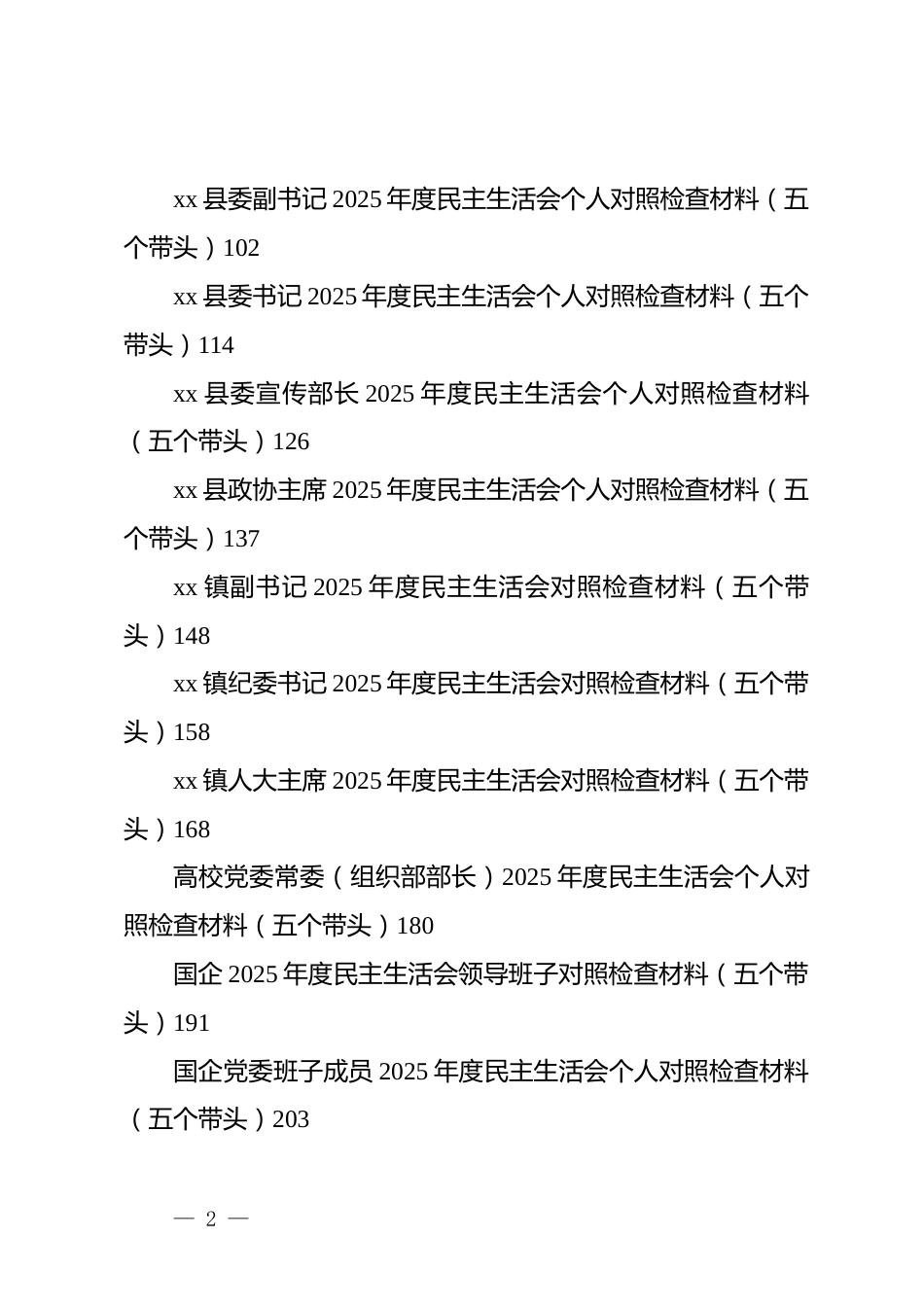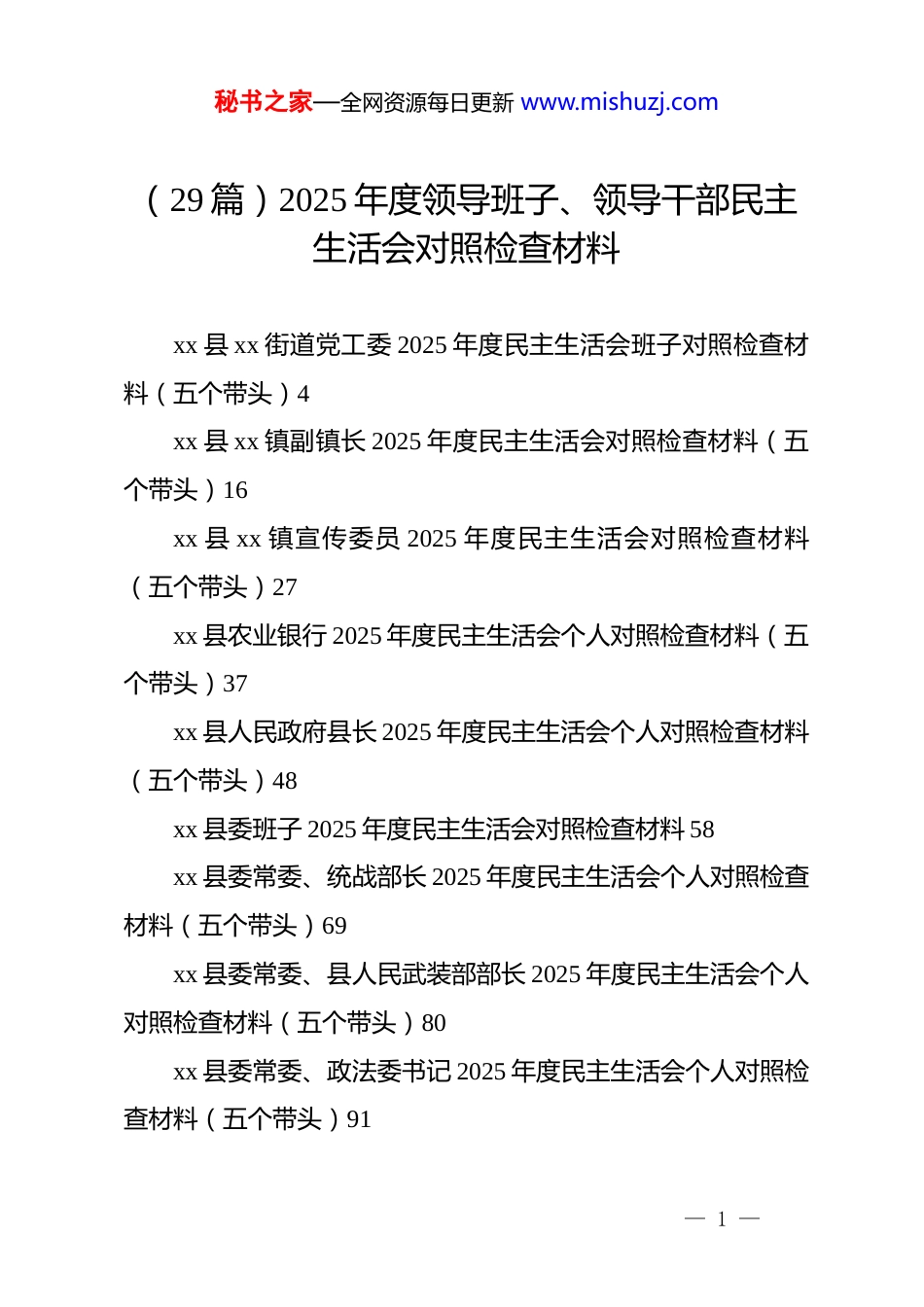 秘书之家—全网资源每日更新 www.mishuzj.com(29 篇)2025 年度领导班子、领导干部民主生活会对照检查材料xx 县 xx 街道党工委 2025 年度民主生活会班子对照检查材料(五个带头)4xx 县 xx 镇副镇长 2025 年度民主生活会对照检查材料(五个带头)16xx 县 xx 镇宣传委员 2025 年度民主生活会对照检查材料(五个带头)27xx 县农业银行 2025 年度民主生活会个人对照检查材料(五个带头)37xx 县人民政府县长 2025 年度民主生活会个人对照检查材料(五个带头)48xx 县委班子 2025 年度民主生活会对照检查材料 58xx 县委常委、统战部长 2025 年度民主生活会个人对照检查材料(五个带头)69xx 县委常委、县人民武装部部长 2025 年度民主生活会个人对照检查材料(五个带头)80xx 县委常委、政法委书记 2025 年度民主生活会个人对照检查材料(五个带头)91— 1 —xx 县委副书记 2025 年度民主生活会个人对照检查材料(五个带头)102xx 县委书记 2025 年度民主生活会个人对照检查材料(五个带头)114xx 县委宣传部长 2025 年度民主生活会个人对照检查材料(五个带头)126xx 县政协主席 2025 年度民主生活会个人对照检查材料(五个带头)137xx 镇副书记 2025 年度民主生活会对照检查材料(五个带头)148xx 镇纪委书记 2025 年度民主生活会对照检查材料(五个带头)158xx 镇人大主席 2025 年度民主生活会对照检查材料(五个带头)168高校党委常委(组织部部长)2025 年度民主生活会个人对照检查材料(五个带头)180国企 2025 年度民主生活会领导班子对照检查材料(五个带头)191国企党委班子成员 2025 年度民主生活会个人对照检查材料(五个带头)203— 2 —秘书之家—全网资源每日更新 www.mishuzj.com区长 2025 年度民主生活会个人对照检查材料(五个带头)215市财政局党组书记 2025 年度民主生活会对照检查材料(对照“五个带头”)225市局领导干部 2025 年度专题民主生活会检视剖析材料(对照“五个带头”)238市直单位党员干部 2025 年民主生活会查摆问题清单(对照“六个带头”共 24 条)254县纪委书记 2025 年度民主生活会个人对照检查材料(五个带头)260县委办公室主任 2025 年度民主生活会个人对照检查材料(五个带头)271乡党委书记 2025 年度民主生活会对照检查材料 283在 xx 单位领导班子专题民主生活会上的对照检查材料 293镇长 2025 年度民主生活会对照检查材料(五个带头)303组织部长 2025 年度民主生活会个人对照检查材料(五个带头)313xx 县 xx 街道党工委 2025 年度民主生活会班子对照检查材料(五个带头)根据中央、省委、市委和县委关于开好 2025 年度党员领导— 3 —干部民主生活会的统一部署和要求,xx 街道党工委班子紧扣会议主题,在深入开展学习研讨、广泛征求意见建议、坦诚进行谈心谈话的基础上,认真对照本次民主生活会明确的五个方面重点内容,深入查摆突出问题,深刻剖析问题根源,明确整改方向和措施。现将班子对照检查情况报告如下。一、存在的主要问题党工委班子坚持问题导向,对照党的创新理论,对照党章党规党纪,对照初心使命,对照群众期盼,对照先进典型,紧密联系街道工作实际和班子自身建设情况,深入查摆了以下五个方面存在的突出问题。(一)在带头强化政治忠诚、提高政治能力方面,政治判断力、政治领悟力、政治执行力仍需持续淬炼提升。1.理论武装向实践转化的“深度”尚有欠缺。班子能够坚持“第一议题”制度,及时跟进学习***总书记最新重要讲话和重要指示批示精神,但在系统把握、融会贯通上还不够彻底,运用党的创新理论指导街道发展实践、破解复杂难题的“结合点”和“突破口”找得不够精准。例如,在谋划 xx 片区城市更新项目时,虽然学习了关于城市工作的重要论述,但在具体规划中,对如何更深刻地体现“人民城市”理念、更有机地融入区域发展大局,前瞻性思考和战略性布局不足,导致项目初期— 4 —秘书之家—全网资源每日更新 www.mishuzj.com方案在功能定位上与群众更高品质生活期待存在一定落差,后续进行了较大调...