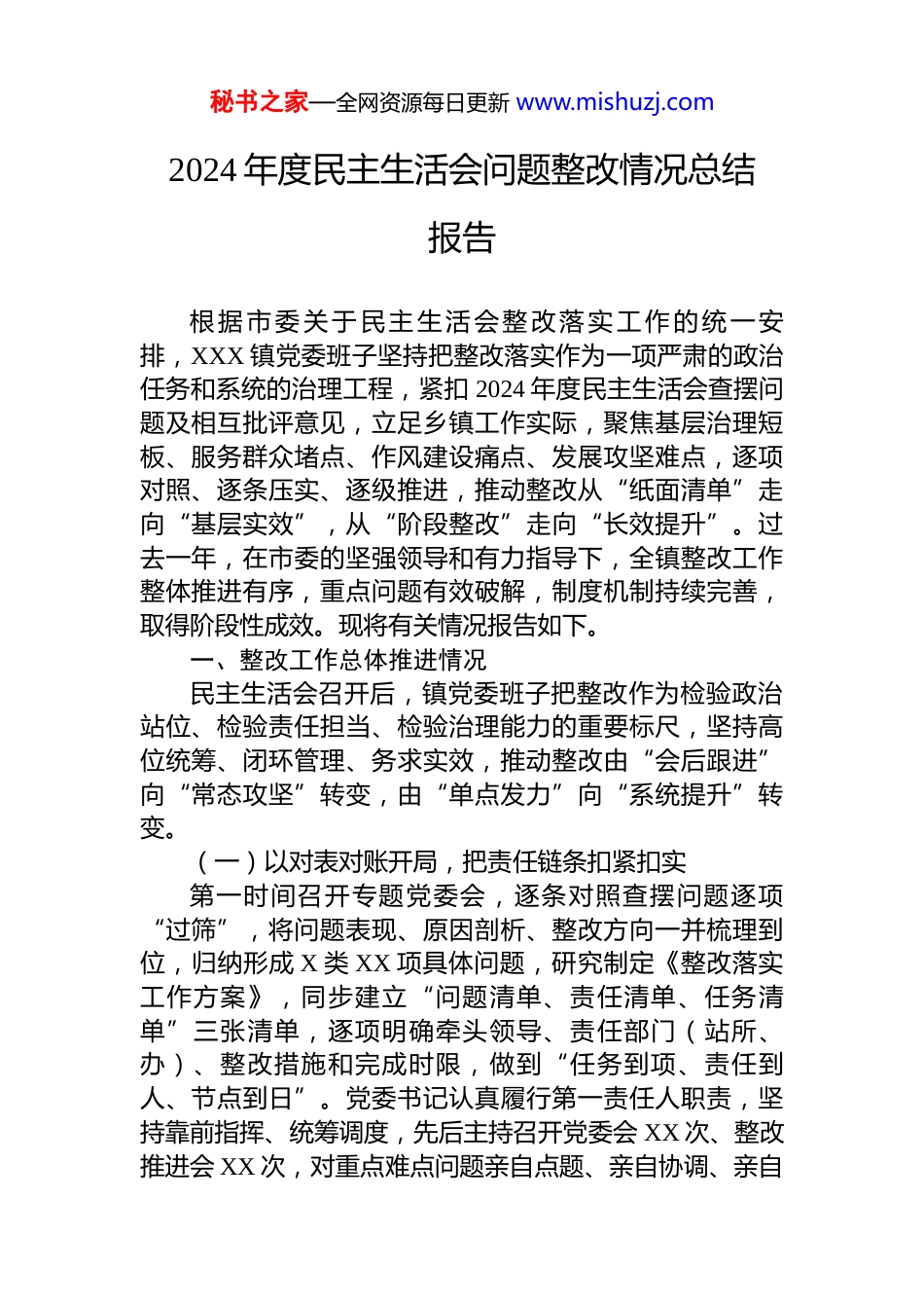 秘书之家—全网资源每日更新 www.mishuzj.com2024 年度民主生活会问题整改情况总结报告根据市委关于民主生活会整改落实工作的统一安排,XXX 镇党委班子坚持把整改落实作为一项严肃的政治任务和系统的治理工程,紧扣 2024 年度民主生活会查摆问题及相互批评意见,立足乡镇工作实际,聚焦基层治理短板、服务群众堵点、作风建设痛点、发展攻坚难点,逐项对照、逐条压实、逐级推进,推动整改从“纸面清单”走向“基层实效”,从“阶段整改”走向“长效提升”。过去一年,在市委的坚强领导和有力指导下,全镇整改工作整体推进有序,重点问题有效破解,制度机制持续完善,取得阶段性成效。现将有关情况报告如下。一、整改工作总体推进情况民主生活会召开后,镇党委班子把整改作为检验政治站位、检验责任担当、检验治理能力的重要标尺,坚持高位统筹、闭环管理、务求实效,推动整改由“会后跟进”向“常态攻坚”转变,由“单点发力”向“系统提升”转变。(一)以对表对账开局,把责任链条扣紧扣实第一时间召开专题党委会,逐条对照查摆问题逐项“过筛”,将问题表现、原因剖析、整改方向一并梳理到位,归纳形成 X 类 XX 项具体问题,研究制定《整改落实工作方案》,同步建立“问题清单、责任清单、任务清单”三张清单,逐项明确牵头领导、责任部门(站所、办)、整改措施和完成时限,做到“任务到项、责任到人、节点到日”。党委书记认真履行第一责任人职责,坚持靠前指挥、统筹调度,先后主持召开党委会 XX 次、整改推进会 XX 次,对重点难点问题亲自点题、亲自协调、亲自秘书之家—全网资源每日更新 www.mishuzj.com督办;班子成员严格落实“一岗双责”,对分管领域问题逐项认领、逐条推进,形成上下联动、左右协同、同题共答的整改格局。(二)以挂图作战推进,把过程管控抓细抓严坚持“清单化管理、项目化推进、常态化督导”,建立“周调度、月通报、季盘点”机制,由党政办牵头每周汇总整改进展、动态更新台账,每月形成《整改工作简报》,每季度召开专题研判会集中攻坚难点堵点,确保整改全过程可追踪、可核验。同步建立“红黄绿”三色预警台账,对进度滞后事项开展提醒督办、对整改质效不高事项开展约谈整改,推动问题不积压、整改不拖延、措施不走样。对需要长期推进的事项,坚持分阶段压茬推进、分节点验收评估,确保整改不断档、机制不悬空。(三)以改出实效落点,把整改成果用好用活坚持把整改与中心工作同谋划、同推进、同检验,把整改成效体现在抓发展、强治理、惠民生、守底线的全过程。围绕“学用脱节”问题,健全党委会“第一议题”与重点工作研讨贯通机制,推动学习成果转化为务实举措;围绕“基层治理不精细”问题,推动网格治理、矛盾化解、民生服务流程再造;围绕“服务群众不够顺畅”问题,聚焦便民服务中心运行、村级代办、一次告知、限时办结等关键环节,推动服务提速提质;围绕“纪律作风仍需加力”问题,把深入贯彻中央⑧项规定精神学习教育贯穿整改全过程,与干部作风整治、基层减负、规范用权、风险防控一体落实,持续以严实作风保障整改见效。二、重点问题整改落实情况围绕民主生活会查摆问题,镇党委班子坚持靶向施策、分类推进,突出“抓重点、破难点、补短板、建机制”,确保整改一项、巩固一项、提升一项。(一)抓好“带头严守政治纪律和政治规矩,维护党的团结统一”方面的问题整改,筑牢政治忠诚根基。秘书之家—全网资源每日更新 www.mishuzj.com针对政治理论学习转化不够、贯彻上级决策部署有时存在重形式轻实效倾向、意识形态阵地管理仍需加强等问题,重点推进以下整改措施:一是把理论武装抓紧抓实。坚持把学习贯彻习近平新时代中国特色社会主义思想作为首要政治任务,把党中央重大决策部署、省委市委工作要求作为党委会和理论学习中心组学习的首学内容,健全“学理论、抓研讨、明举措、促落实”闭环机制,推动学习由“碎片化”向“体系化”转变、由“泛泛学”向“带着问题学”转变。围绕乡村振兴、基层治理、项目攻坚、民生保障等重点任务,组织专题研学 XX 次,班子成员深入村(社区)、企业、项目一线调研 XX 次,形成调...